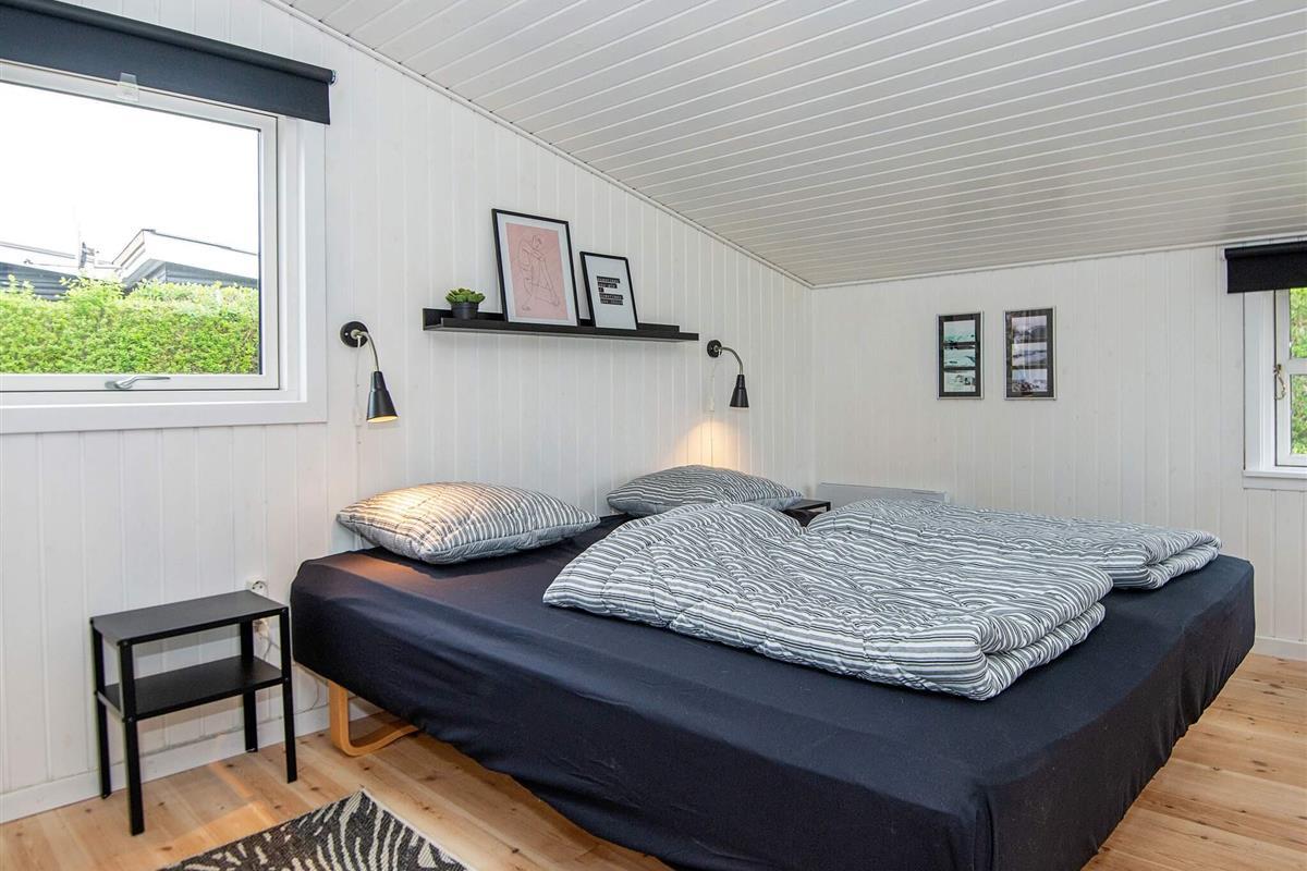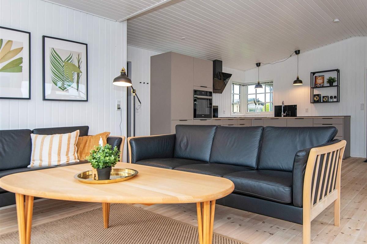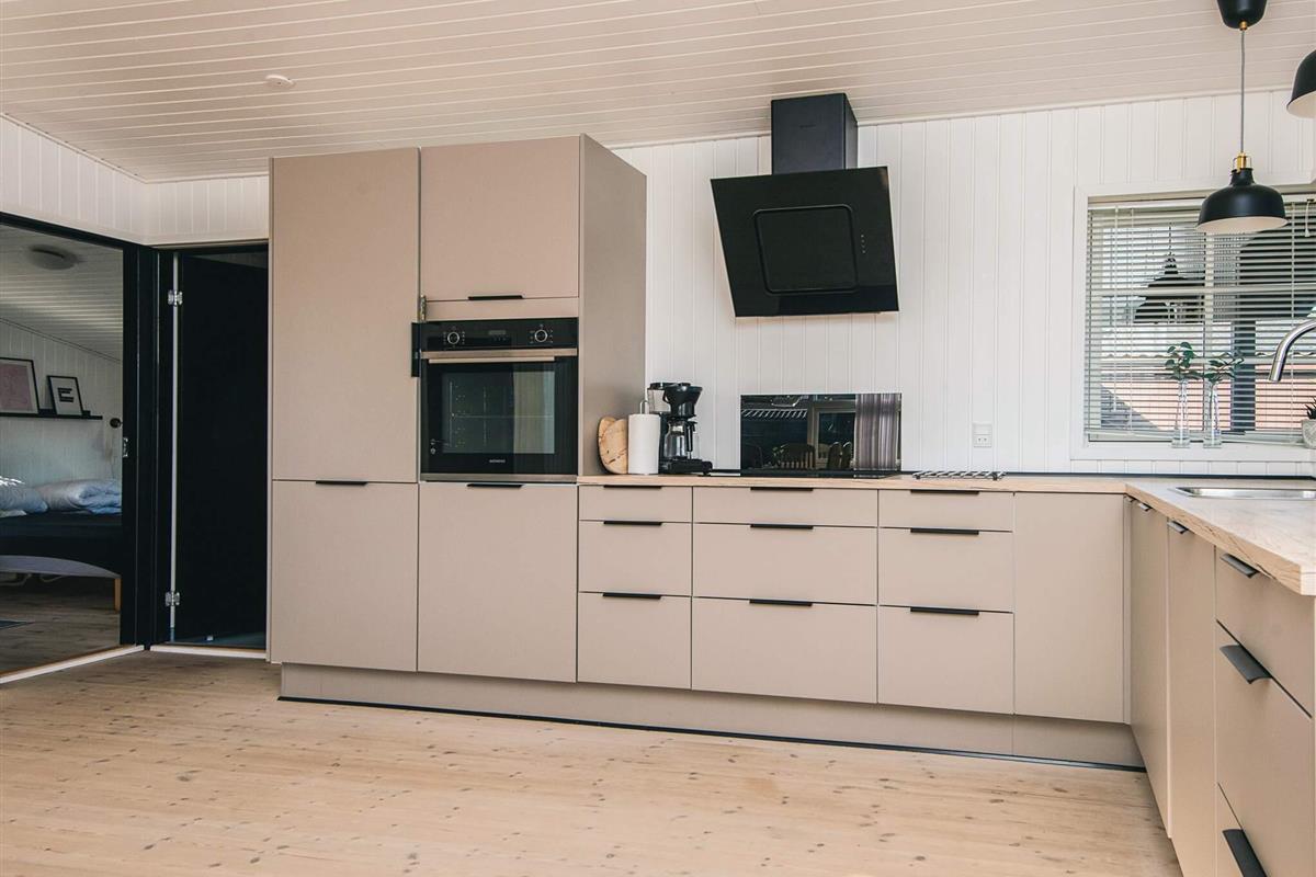 Die neue Küche ist offen in den Wohnbereich integriert. Zudem stehen zwei gute Schlafzimmer zur Verfügung. Vom Wohnzimmer aus hat man direkten Zugang zum Grundstück mit Rasenfläche für Spiel und Spaß der Kinder. Hier gibt es auch Platz zum Sonnenbaden und für Grillabende. Nebenan auf dem Grundstück steht zudem ein kleiner Annex mit zwei weiteren Schlafplätzen in einem Doppelbett.