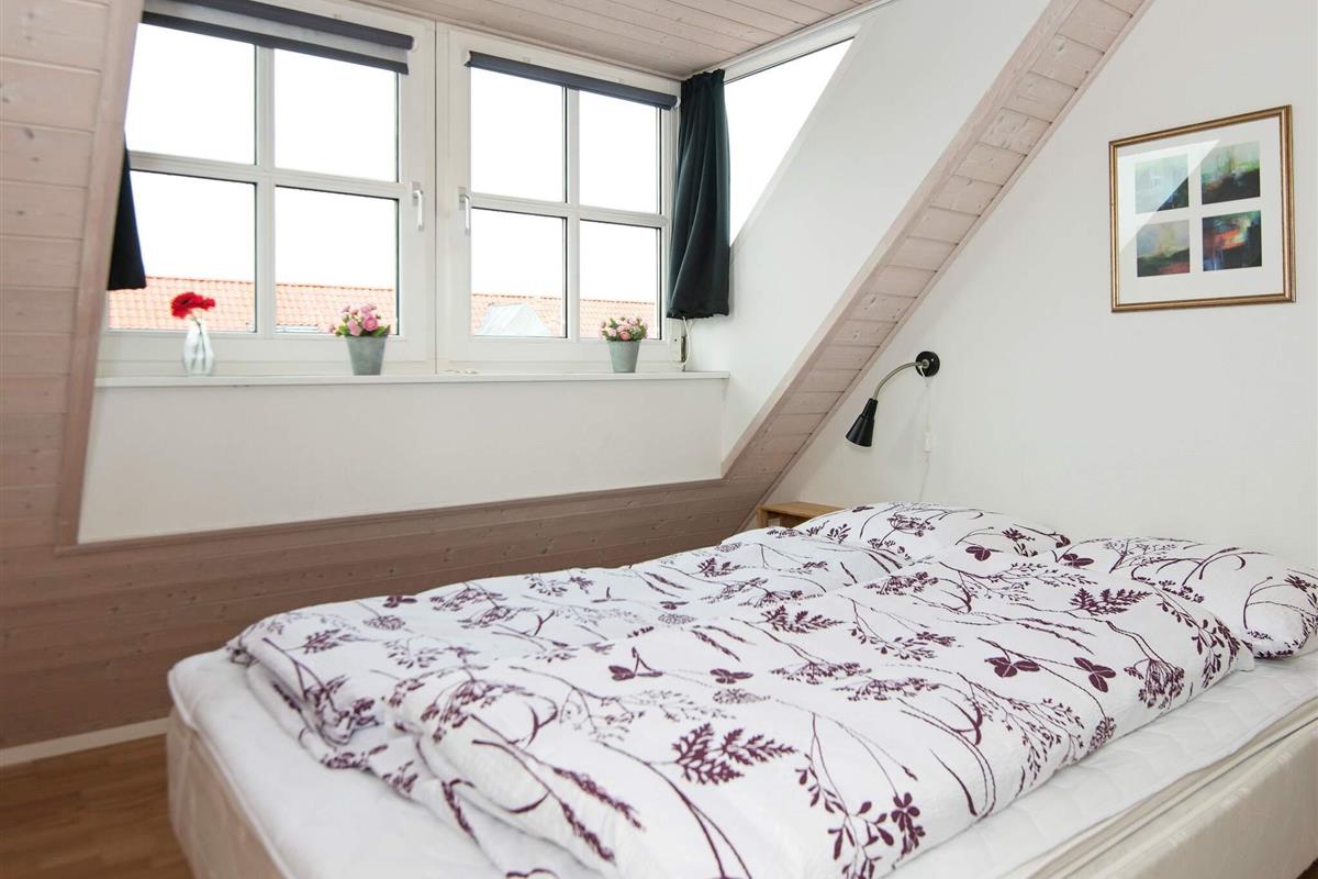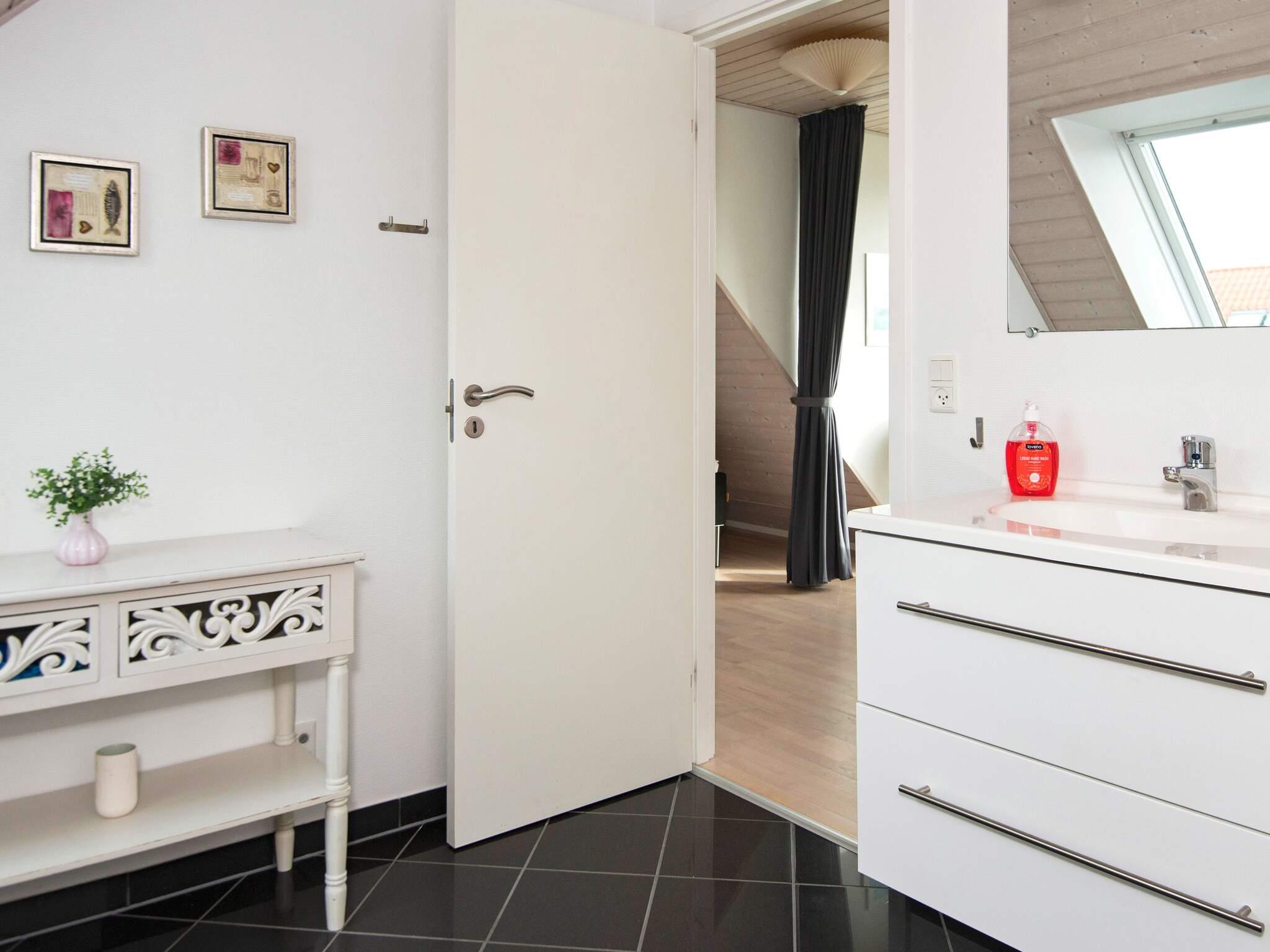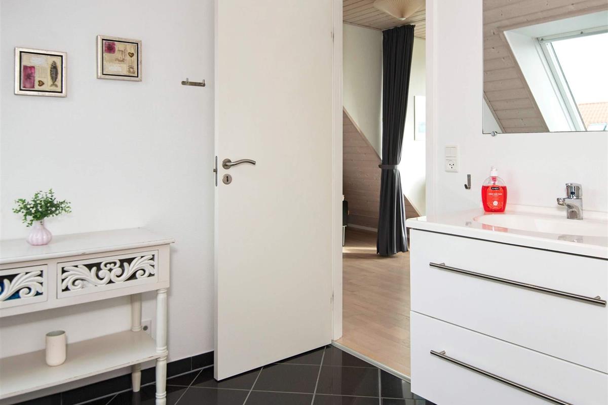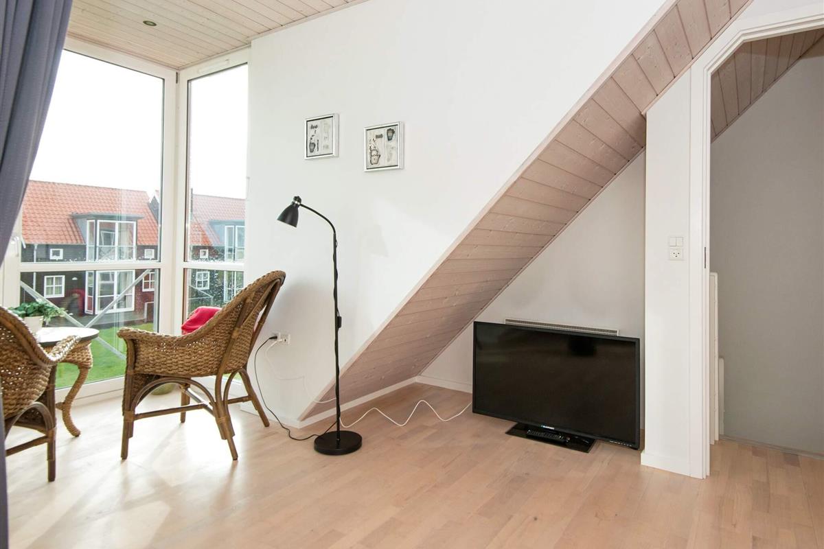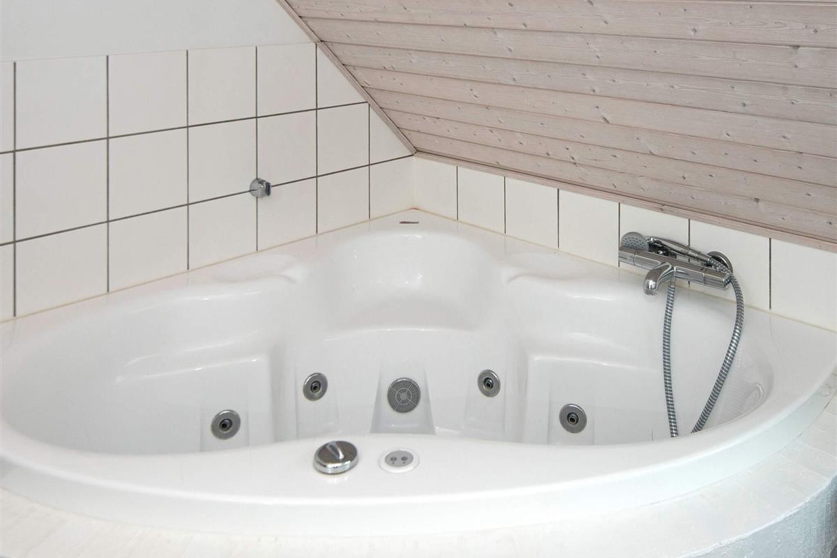Im Erdgeschoss befinden sich ein großer Küchen-Wohnraum und ein Bad mit Dusche. Im ersten Stock gibt es ein großes Bad mit Whirlpool, ein Schlafzimmer und einen Wohnbereich mit zwei Betten sowie Fernseher. Dachschrägen sorgen für ein gemütliches Ambiente.