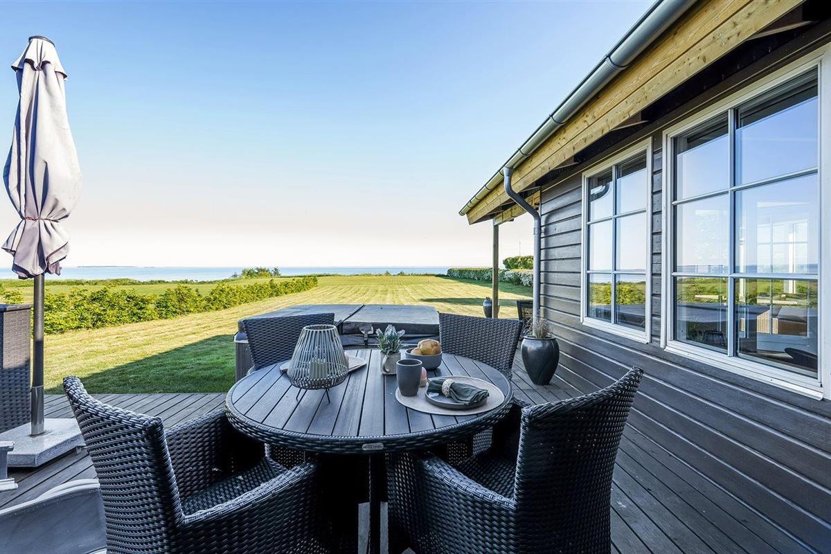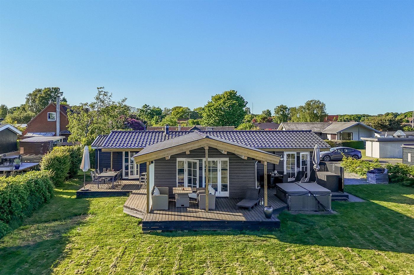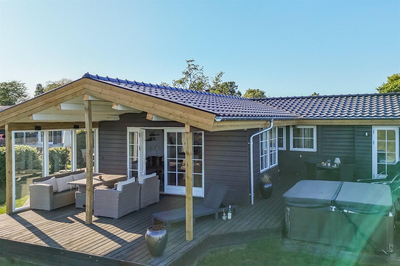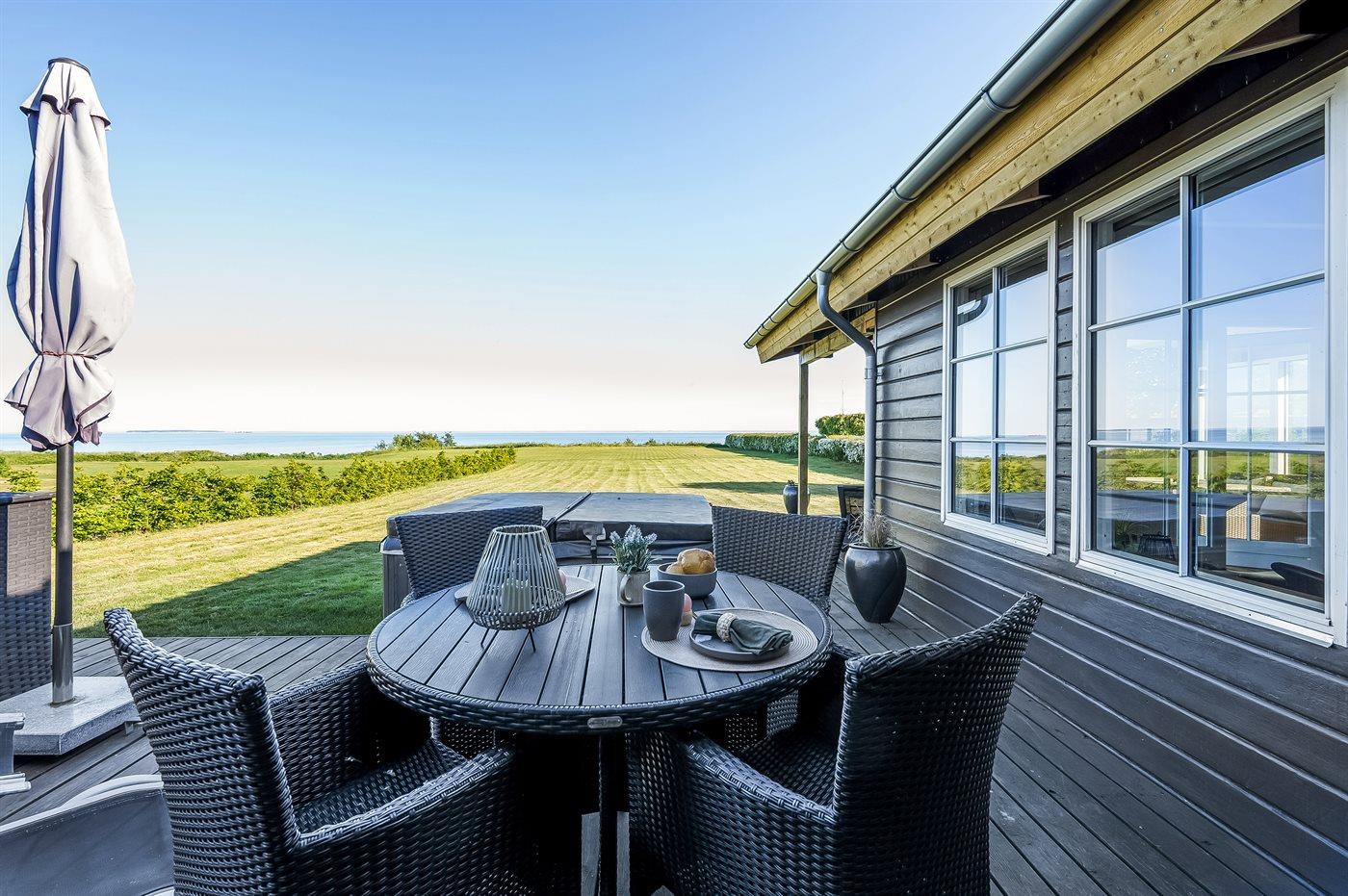 Comfortabel vakantiehuis in Juelsminde met zeezicht, grote tuin en buitenbubbelbad voor ontspannen vakanties.