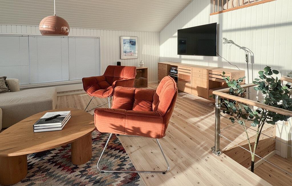 Dit lichte en uitnodigende vakantiehuis met uitzicht op zee ligt op slechts een paar meter van het zandstrand.