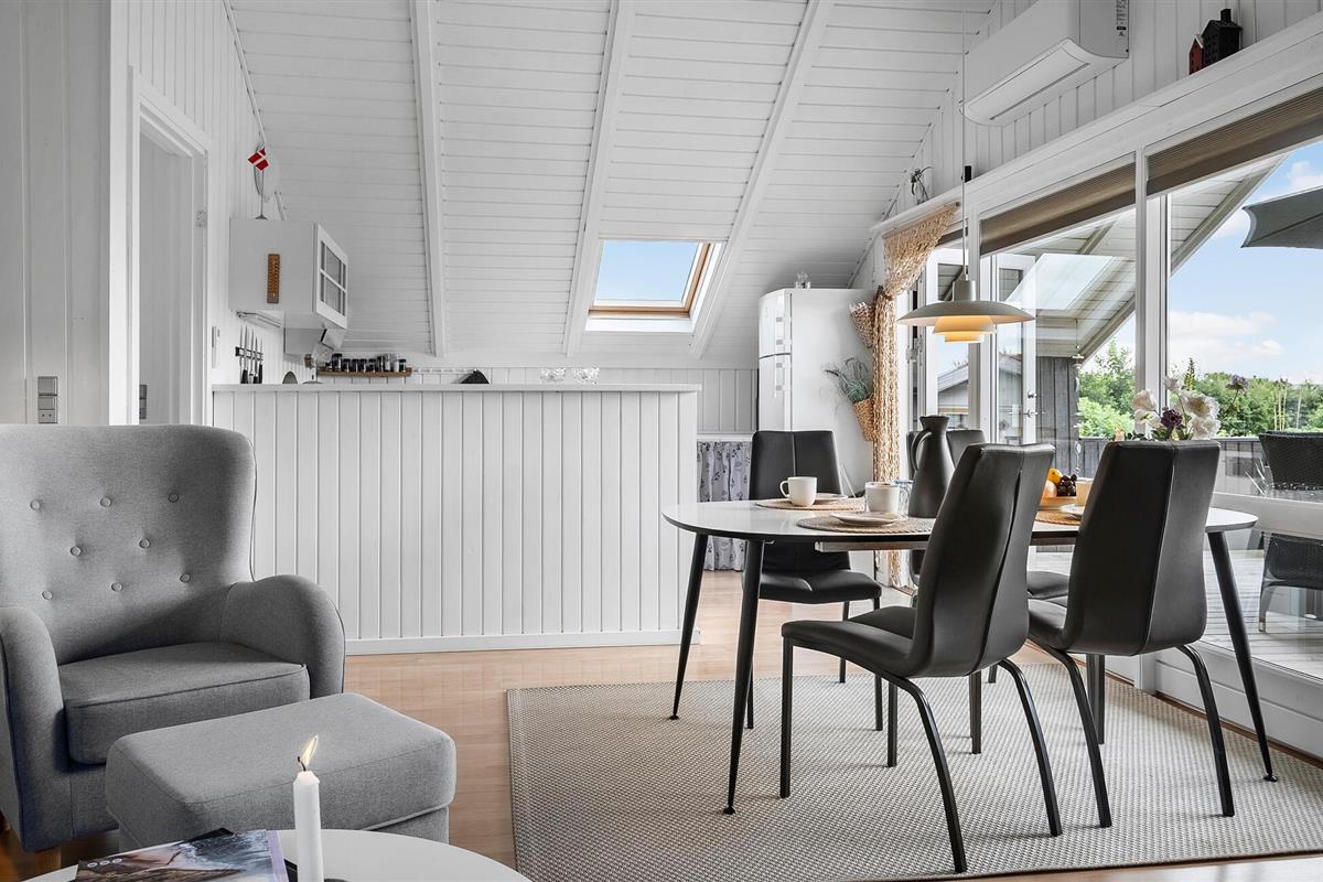Je vakantiehuis verwelkomt je met een lichte en vriendelijke sfeer die uitnodigt om samen te blijven. De witte houten elementen in het interieur, die contrasteren met de zwarte buitenkant van het huis, zorgen voor een uitnodigende sfeer. Gebruik de open keuken om een uitgebreid ontbijt en andere culinaire specialiteiten te bereiden. Aan de elegante eettafel kun je tijdens het eten genieten van het uitzicht op buiten. Het ruime terras biedt ook de mogelijkheid om buiten te dineren of de volgende vakantiedag te plannen onder het genot van een kopje koffie of thee. Sluit de avond ontspannen af in de gezellige zithoek, die nog gezelliger wordt door de zachte gloed van de open haard.