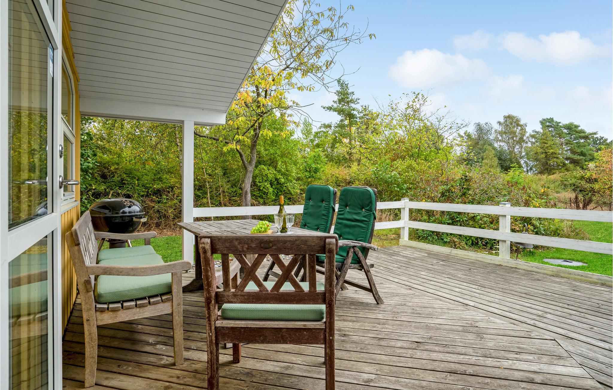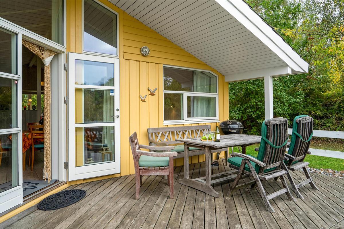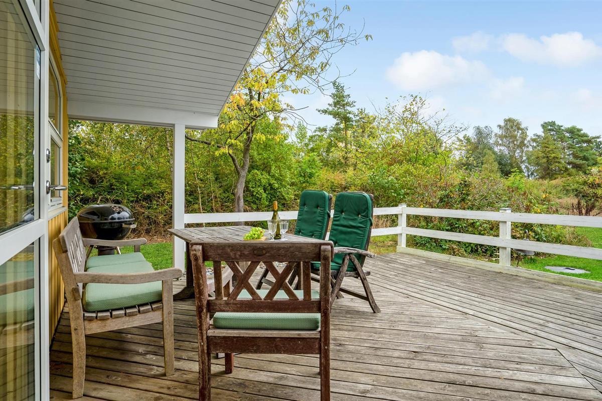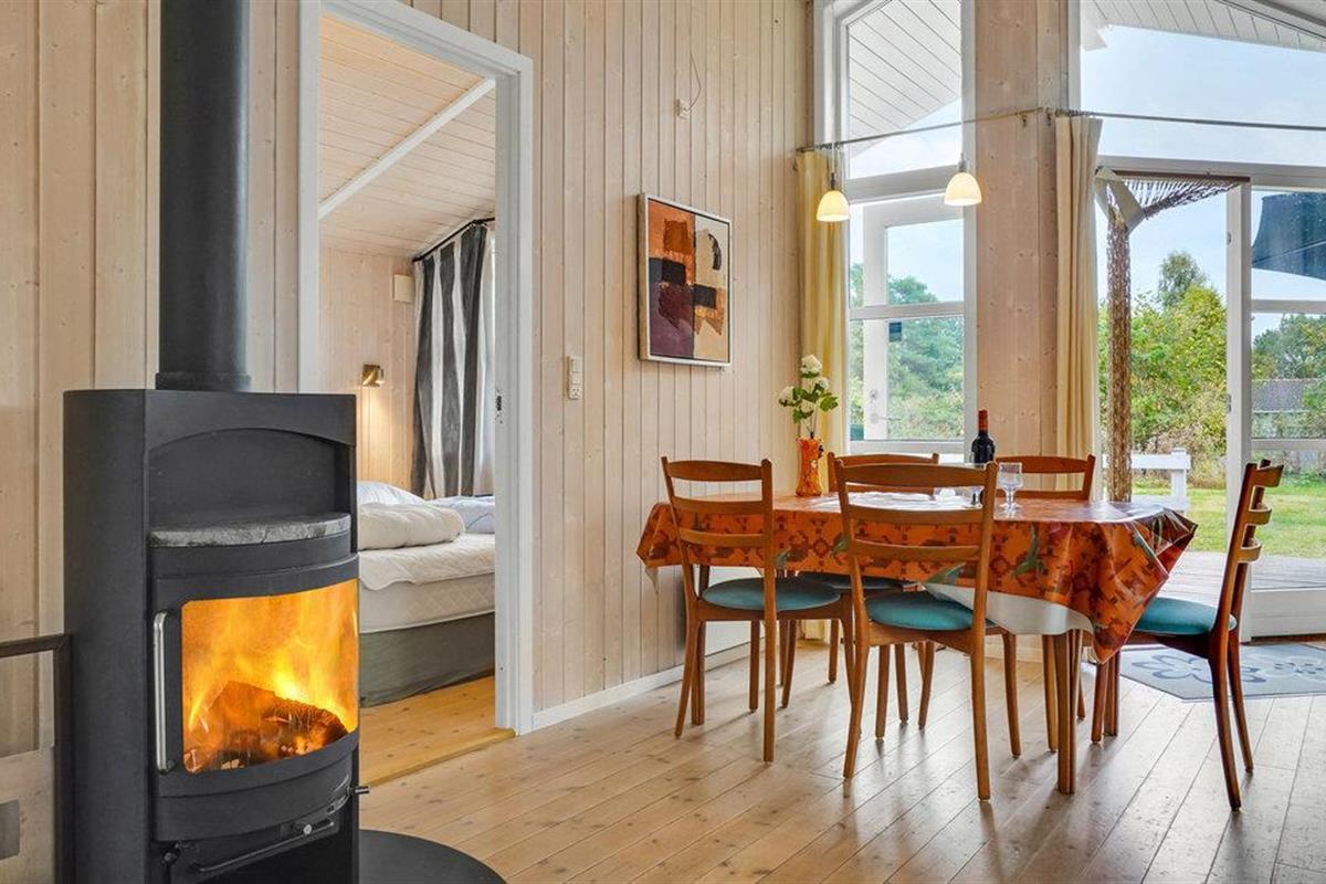 In de woonkamer vindt u de houtkachel en een alkoof. Op het gedeeltelijk overdekte terras geniet u van veel zon en frisse lucht en kunt u 's avonds barbecueën. Het huis ligt op een afgelegen natuurgrondstuk en biedt een rustige sfeer.