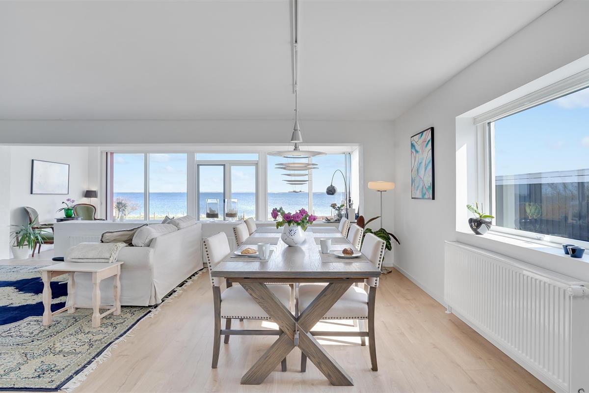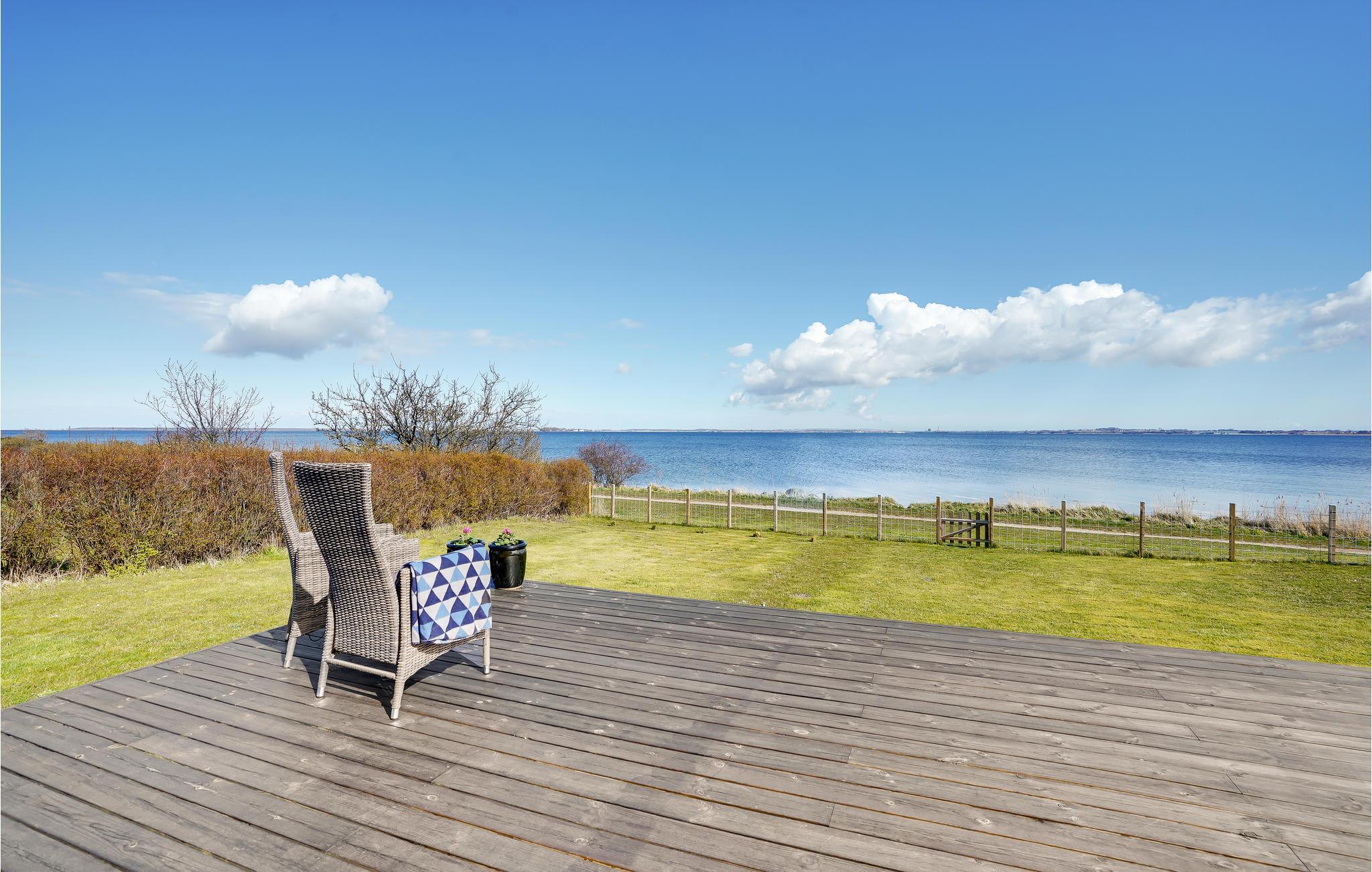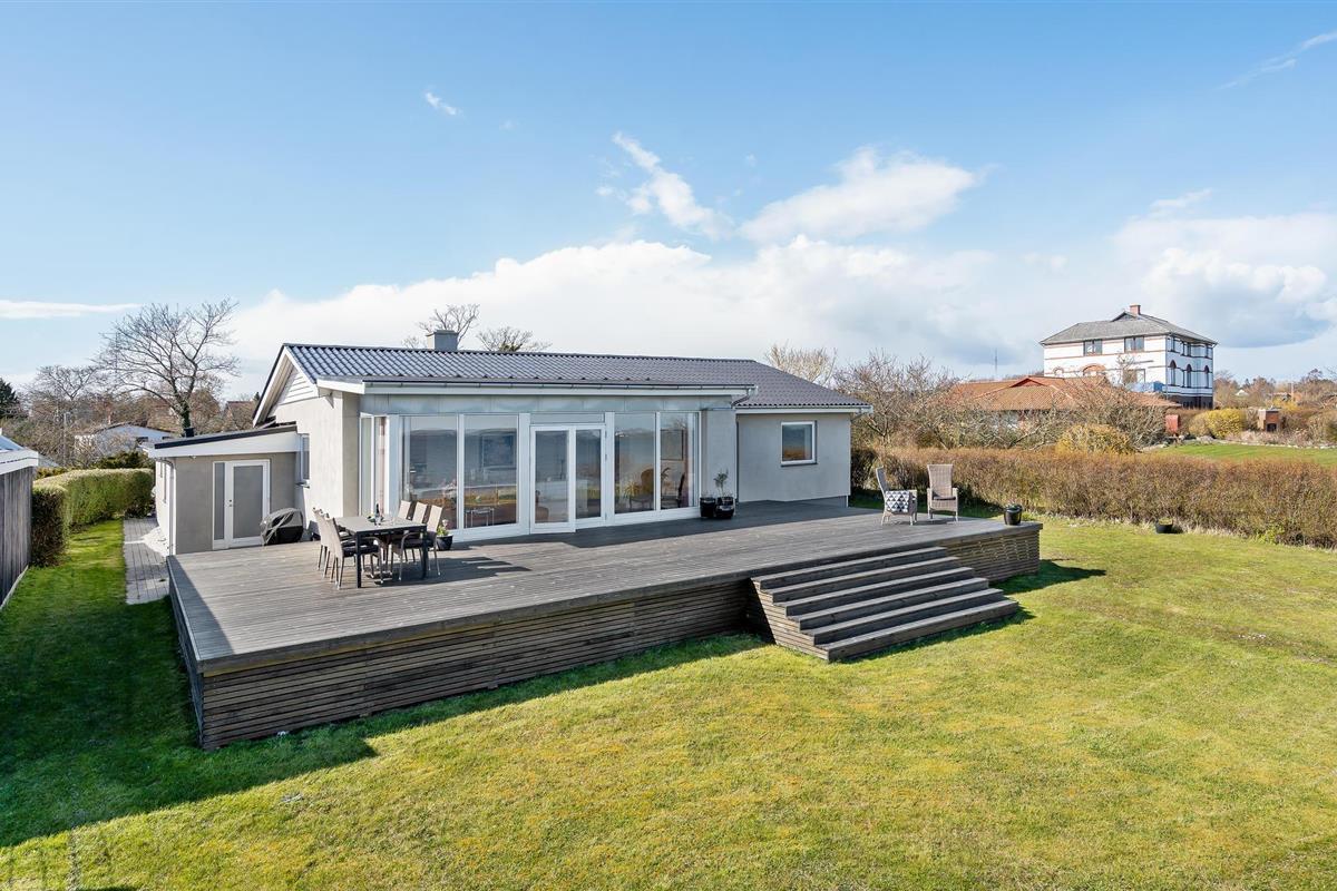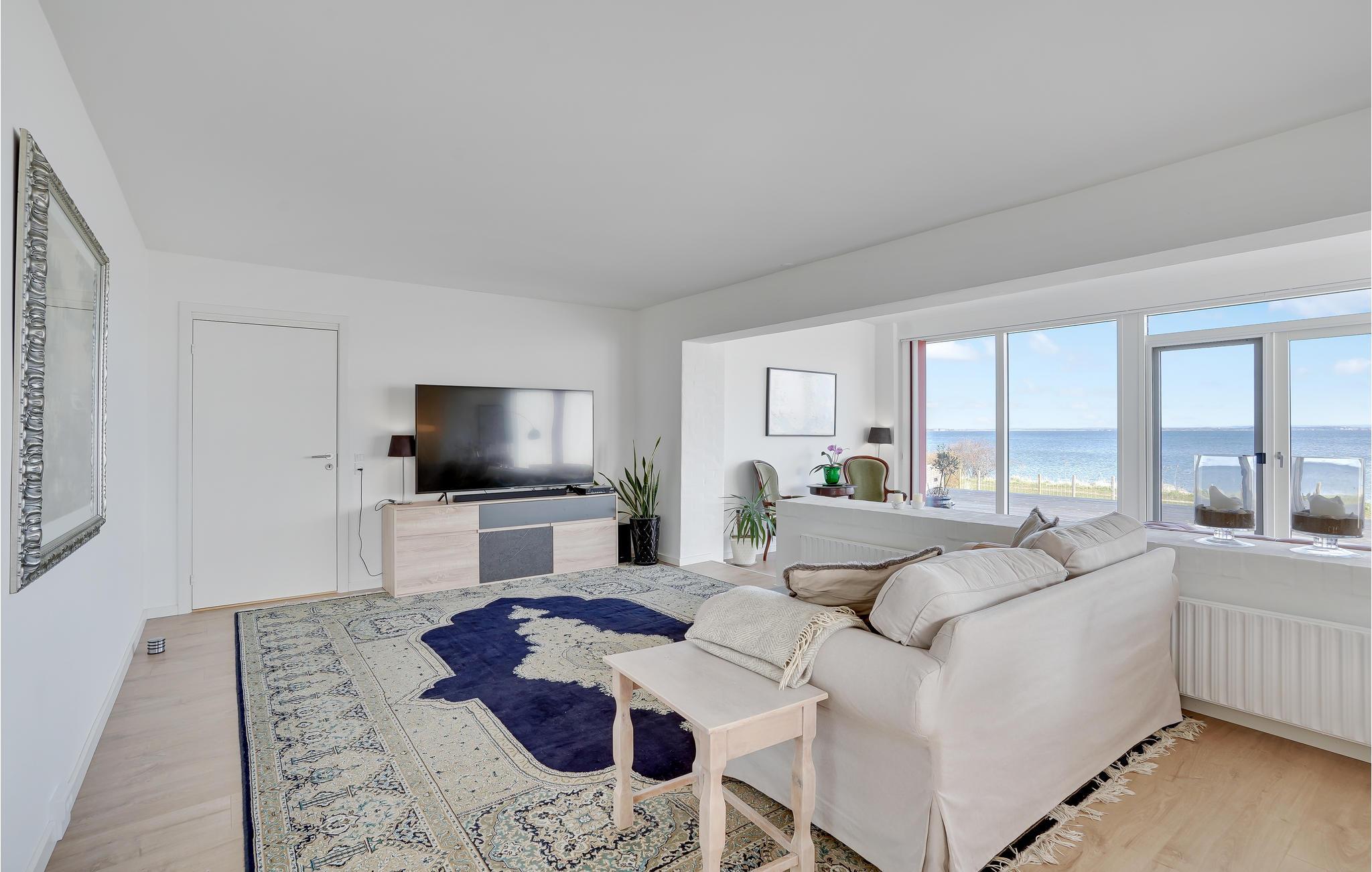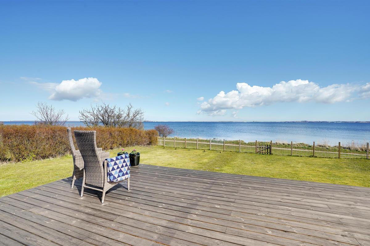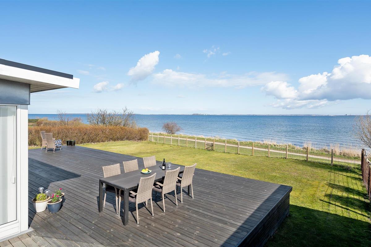 Geniet van een modern vakantiehuis met panoramisch zeezicht direct aan het strand in Kalvehave.