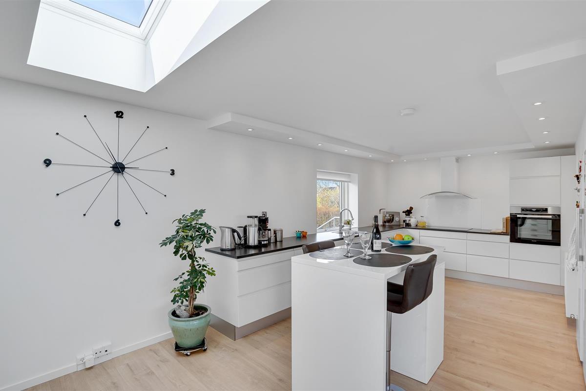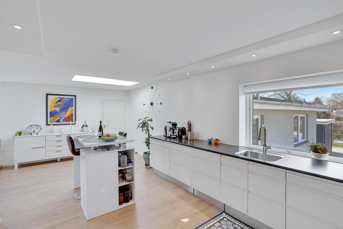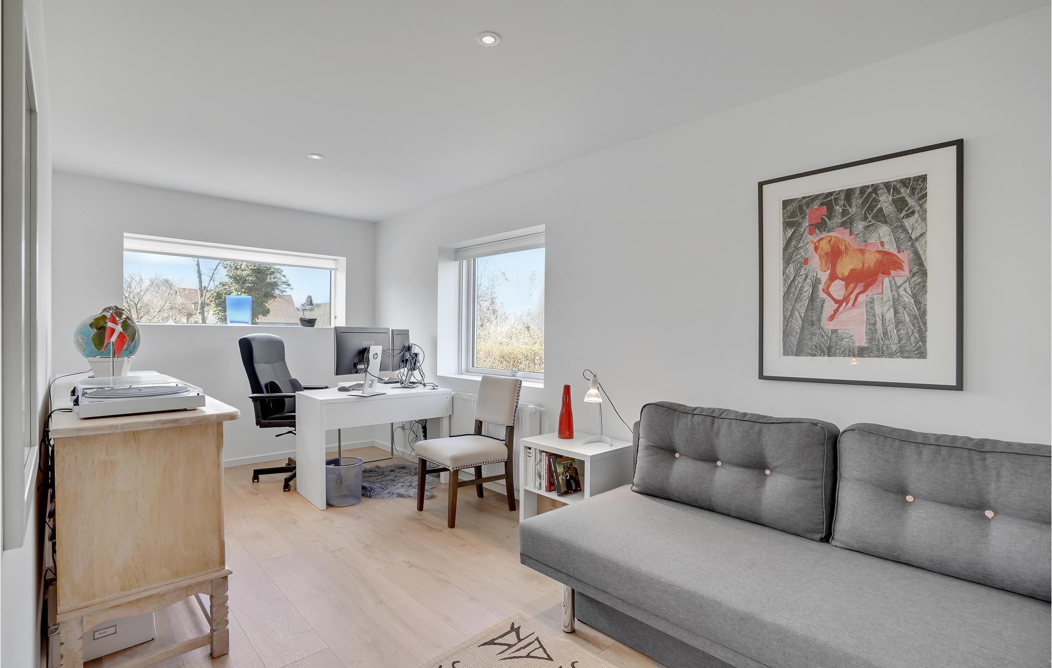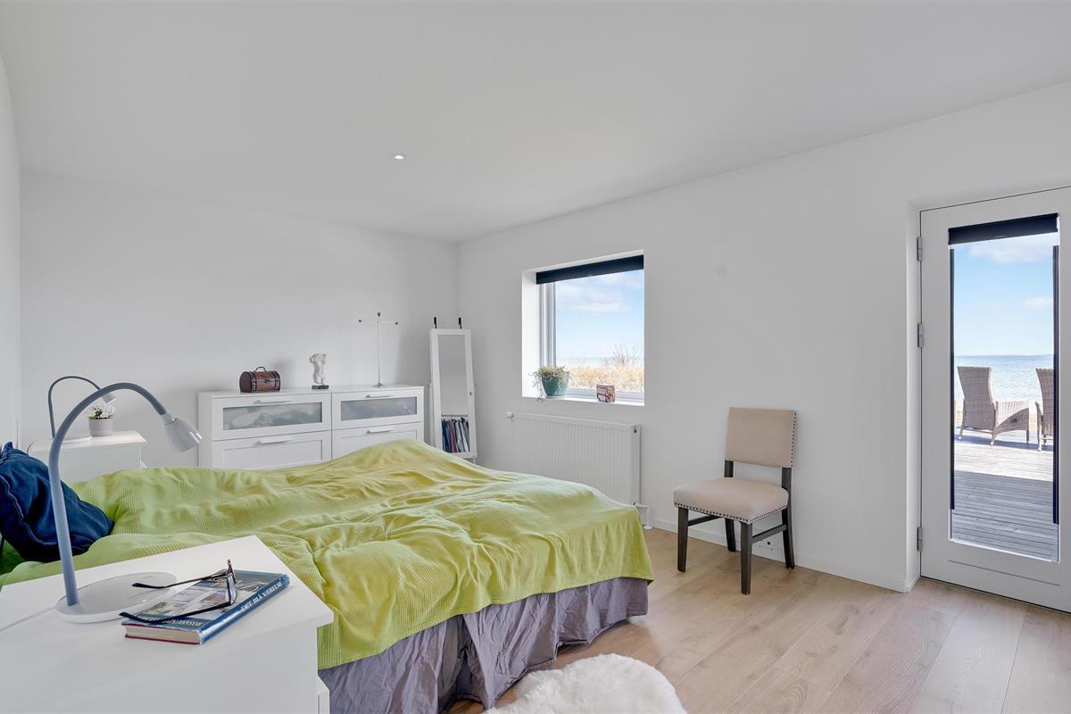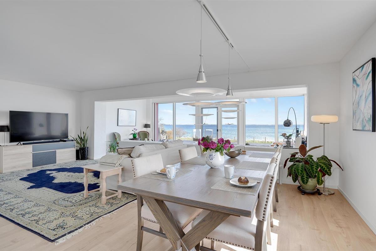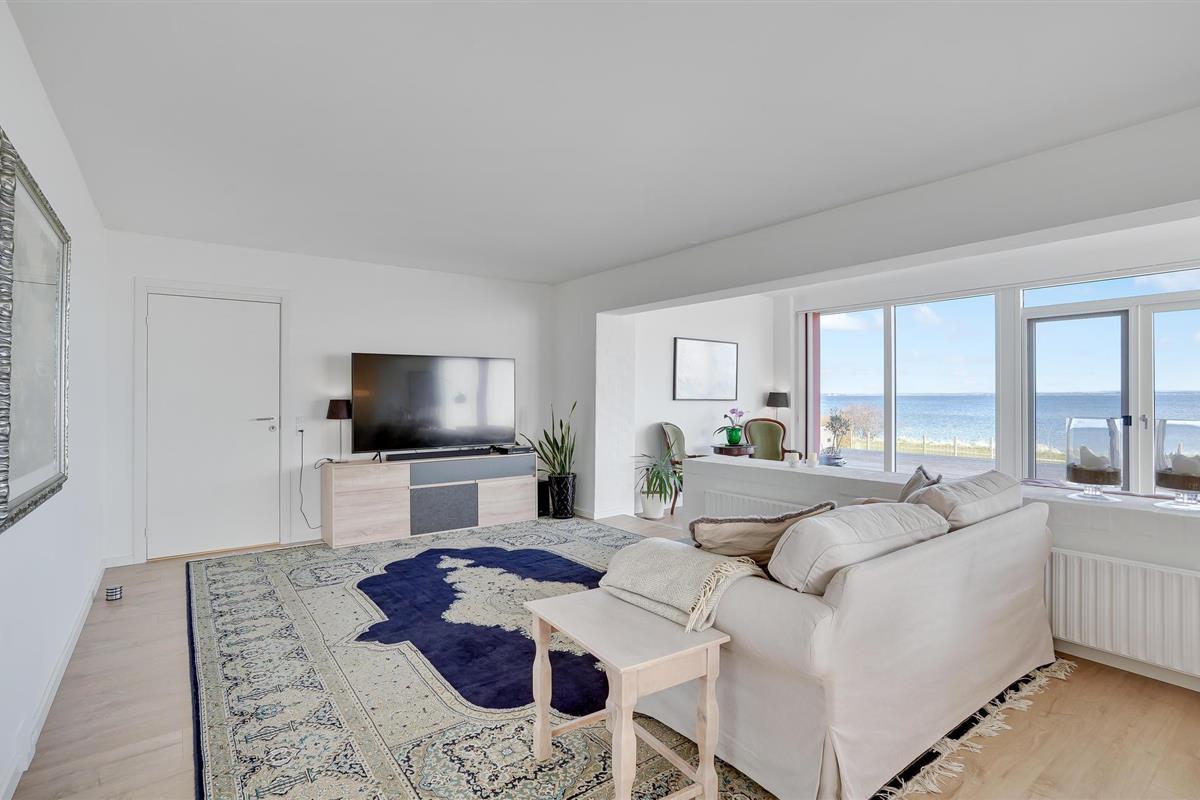 Geniet van een modern vakantiehuis met panoramisch zeezicht direct aan het strand in Kalvehave.
