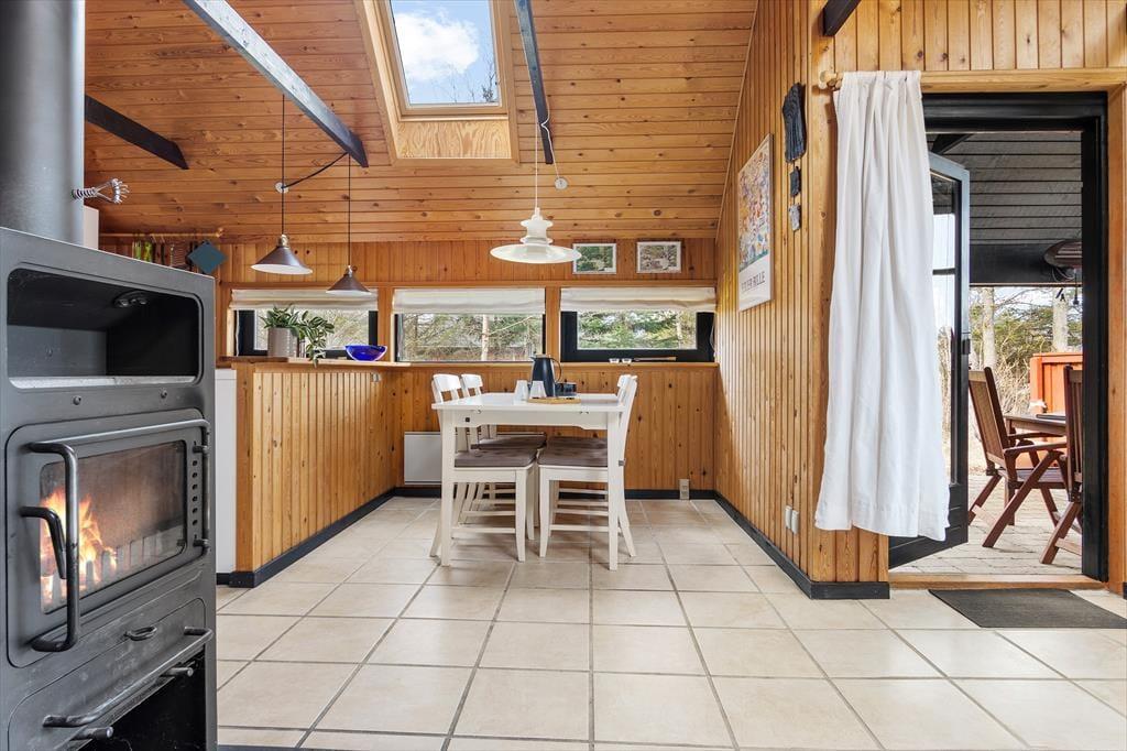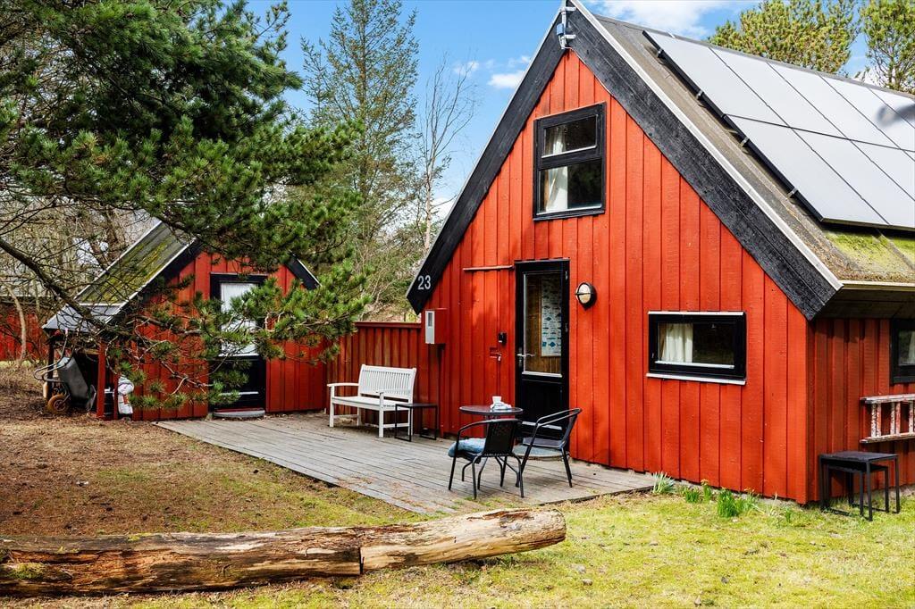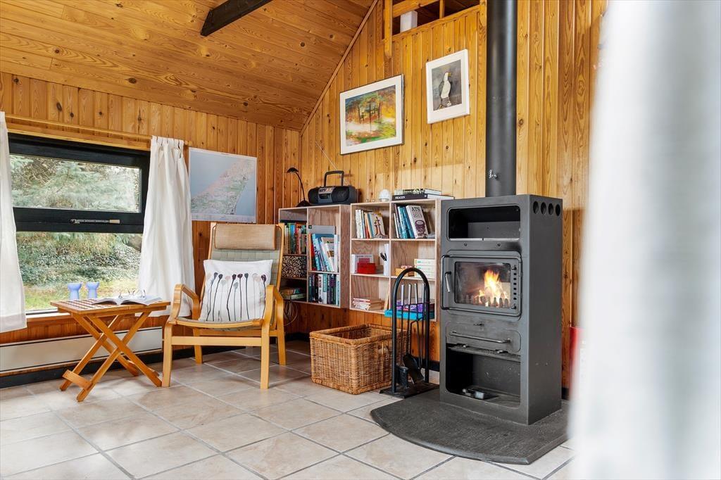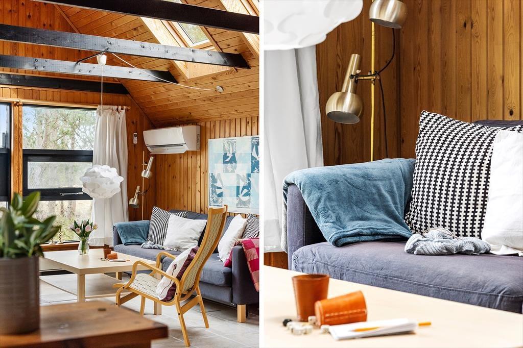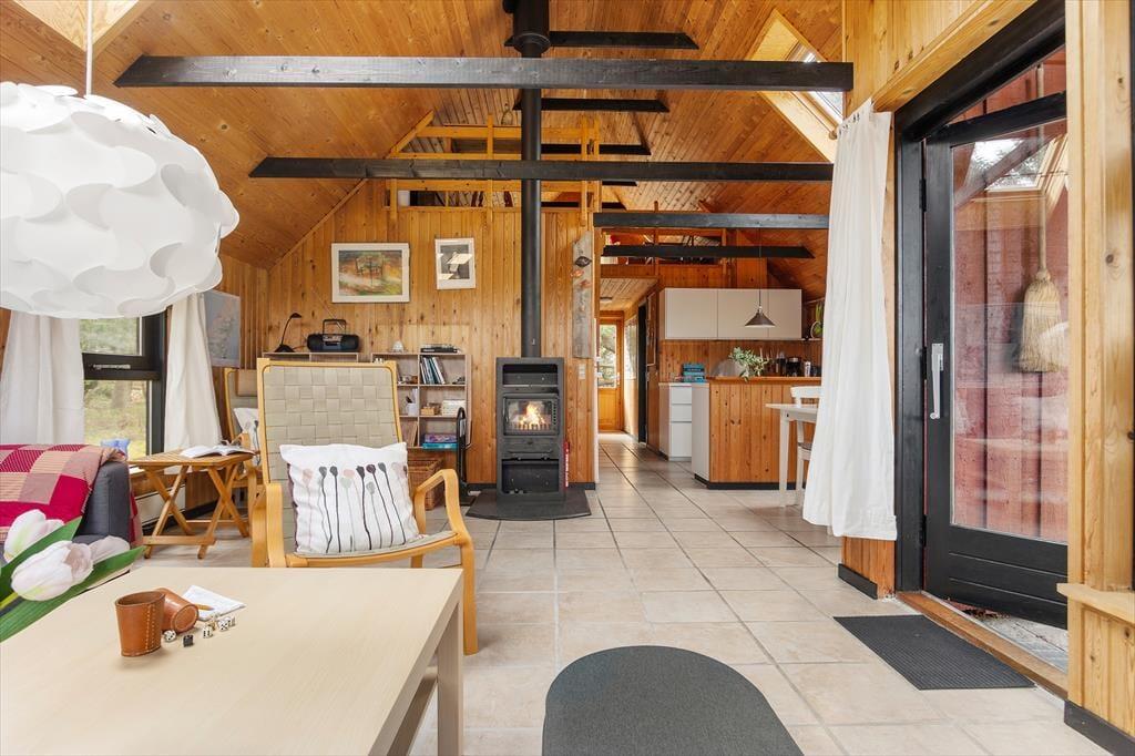 Hinter der roten Holzfassade des Hauses begrüßen dich gemütliche und stimmungsvolle Räumlichkeiten. In klassischer Ferienhausmanier triffst du auf hohe Decken und rustikal mit Holz vertäfelte Wände. Vom Wohnraum führt eine Leiter hinauf auf den offenen Schlafboden unter dem Dach. Während du dich in der Polstersitzgruppe im Wohnraum entspannst oder in der offenen Küche die Mahlzeiten zubereitest, werden deine Kinder sich garantiert gern auf den Schlafboden zurückziehen, um dort zu spielen, zu lesen oder mit den Freunden daheim zu chatten. Der neben dem Kaminofen platzierte Lehnstuhl ist ein ideales Plätzchen, um an kühlen Abenden in Ruhe zu lesen oder zu stricken. Der Rest der Wohnfläche ist zwei Schlafräumen und einem Duschbadezimmer überlassen.