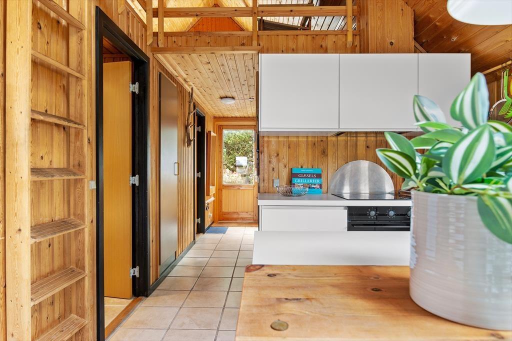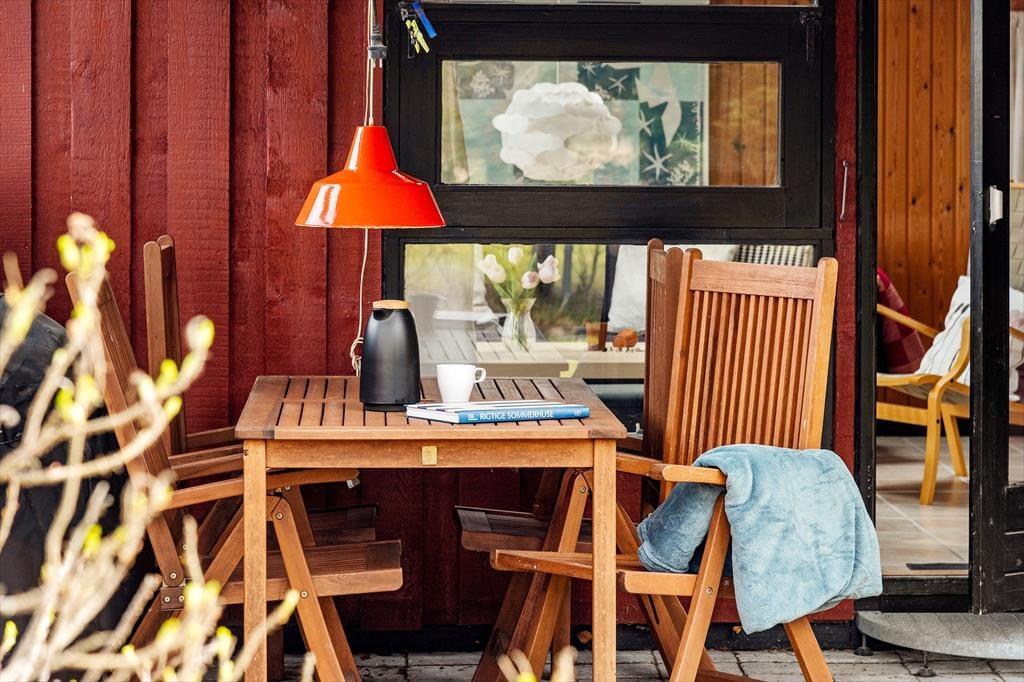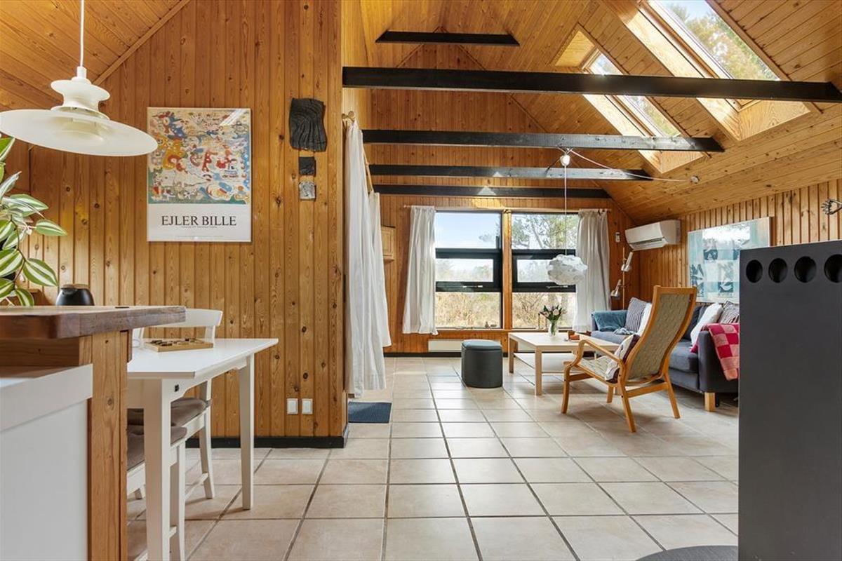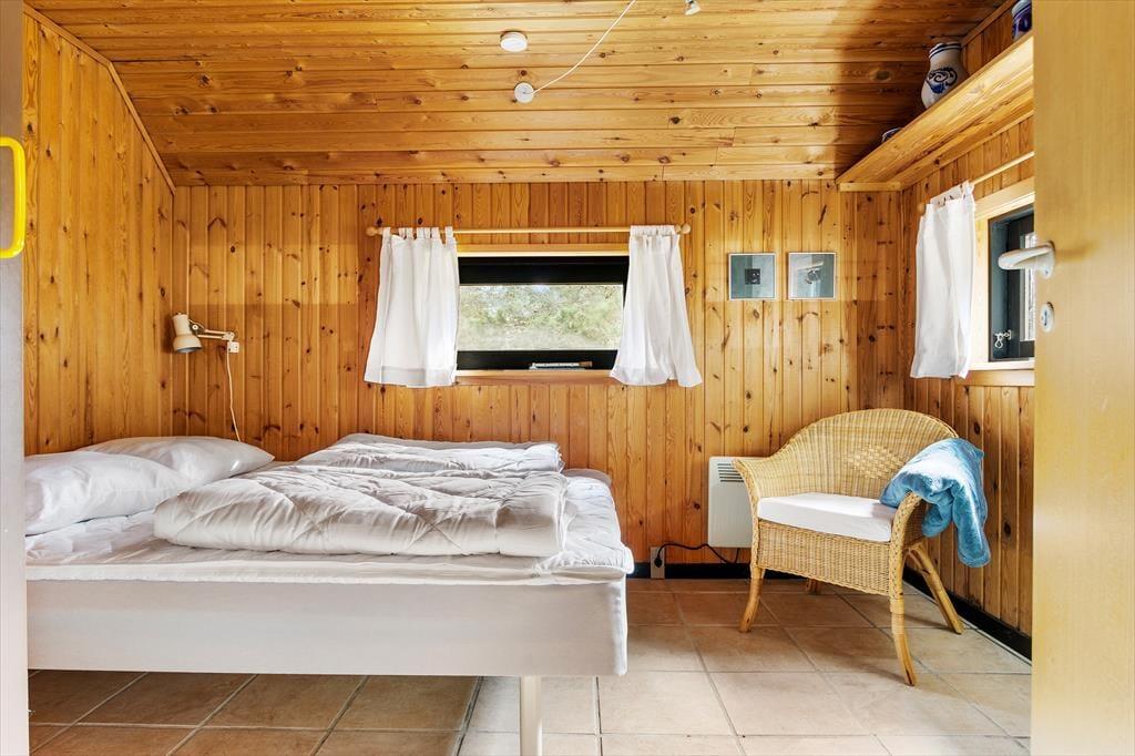 Hinter der roten Holzfassade des Hauses begrüßen dich gemütliche und stimmungsvolle Räumlichkeiten. In klassischer Ferienhausmanier triffst du auf hohe Decken und rustikal mit Holz vertäfelte Wände. Vom Wohnraum führt eine Leiter hinauf auf den offenen Schlafboden unter dem Dach. Während du dich in der Polstersitzgruppe im Wohnraum entspannst oder in der offenen Küche die Mahlzeiten zubereitest, werden deine Kinder sich garantiert gern auf den Schlafboden zurückziehen, um dort zu spielen, zu lesen oder mit den Freunden daheim zu chatten. Der neben dem Kaminofen platzierte Lehnstuhl ist ein ideales Plätzchen, um an kühlen Abenden in Ruhe zu lesen oder zu stricken. Der Rest der Wohnfläche ist zwei Schlafräumen und einem Duschbadezimmer überlassen.
