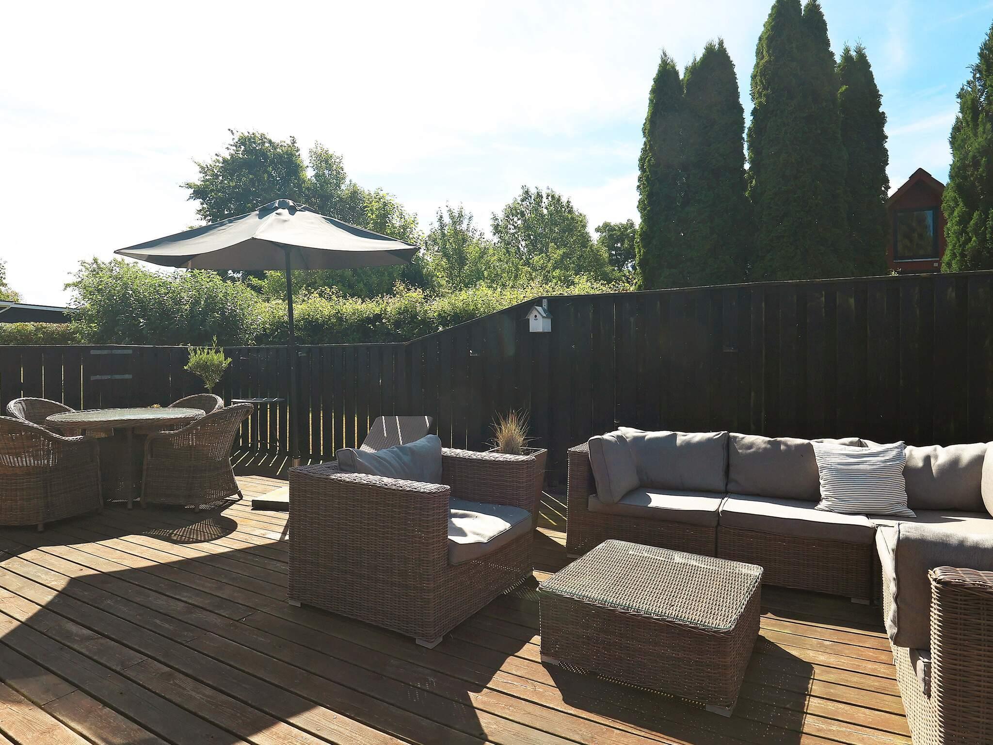Im Außenbereich schön abgeschirmte Holzterrasse für Sonnentage. Es sind nur etwa 8 Minuten Fußweg hinunter zum Badesteg.