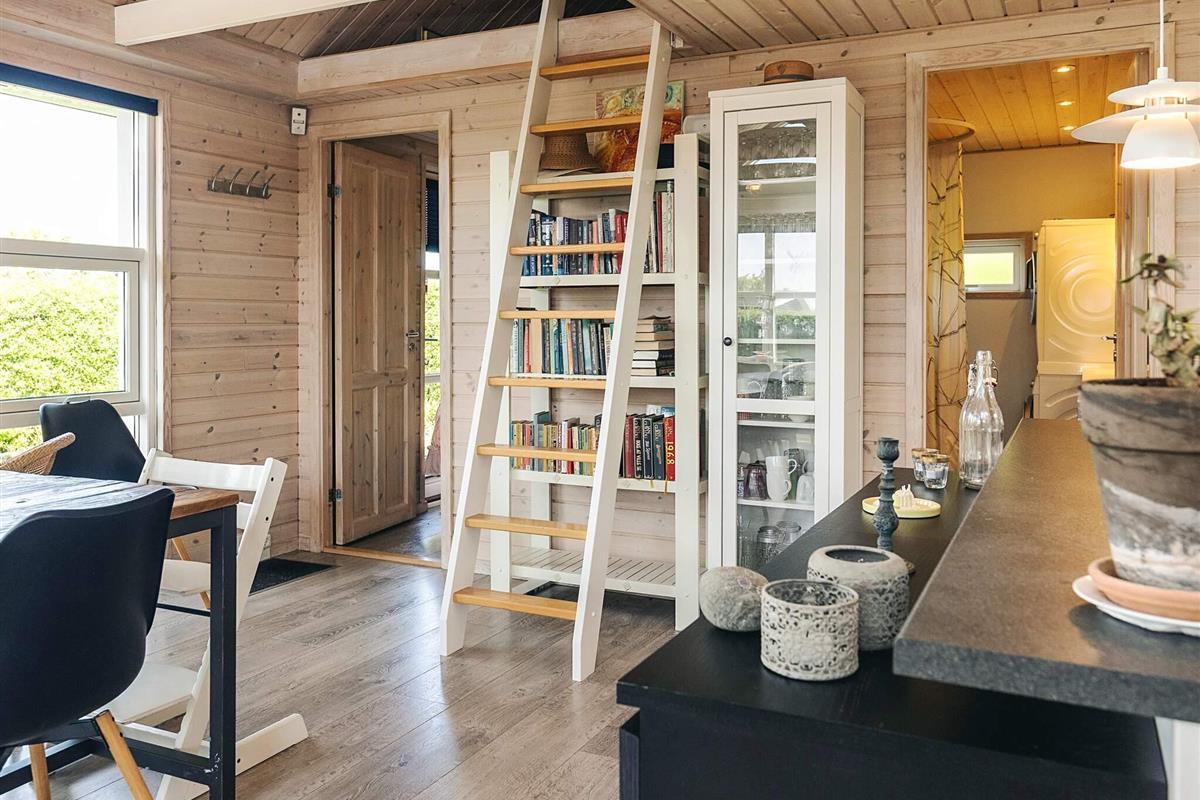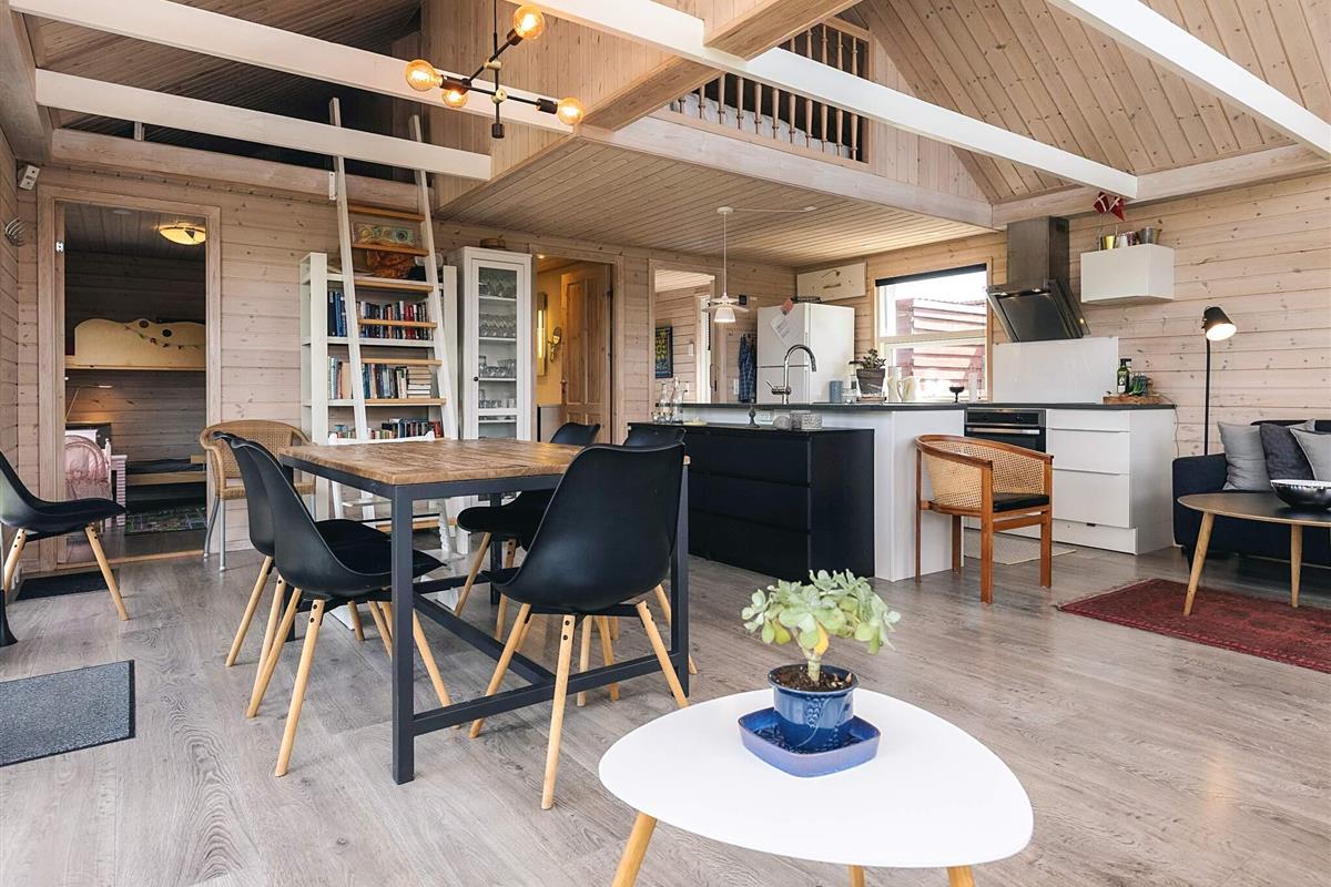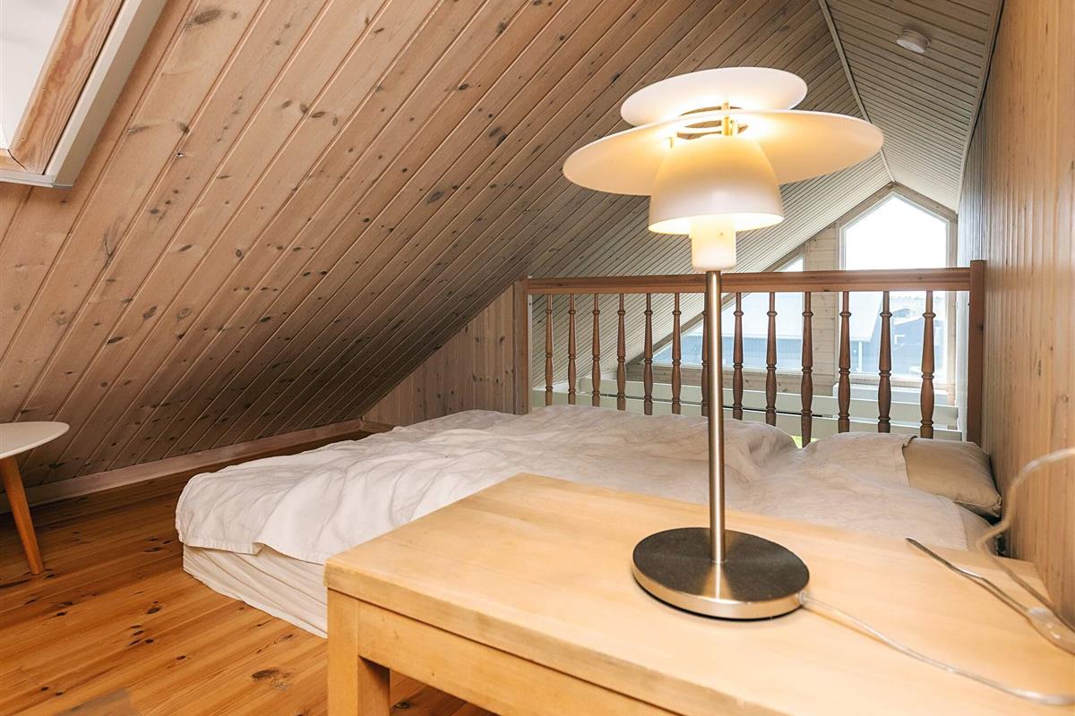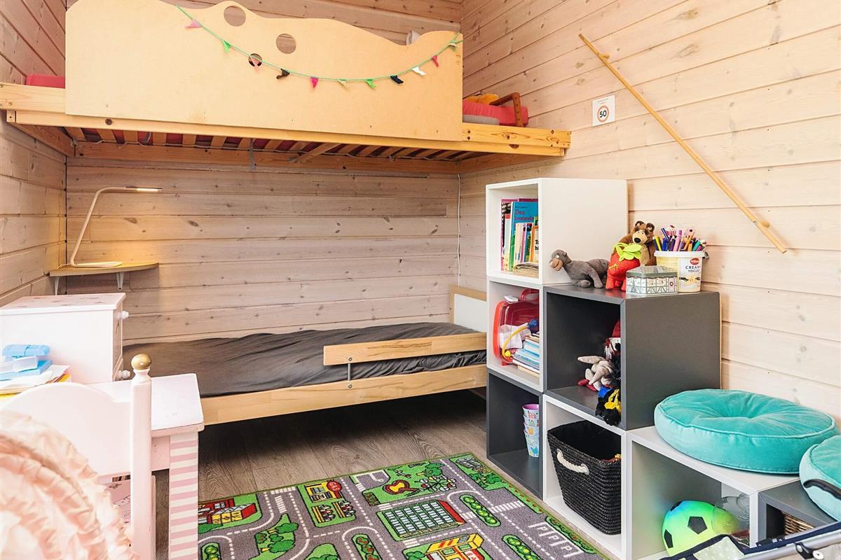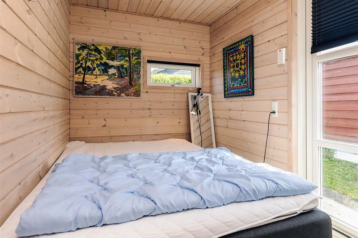 Der Eingangsbereich dient als Schlafzimmer mit einem bequemen Doppelbett (140 x 200 cm). Im Obergeschoss bietet ein geräumiger Dachboden mit voller Stehhöhe zwei Doppelschlafplätze mit 140 x 200 cm großen Matratzen – ideal für Kinder oder zusätzliche Gäste. Ein weiteres Schlafzimmer verfügt über Etagenbetten (70 x 160 cm und 90 x 180 cm), ideal für kleinere Kinder. Das Haus verfügt über ein helles, modernes Badezimmer mit Dusche, WC, Waschmaschine und Trockner für einen angenehmen Aufenthalt.