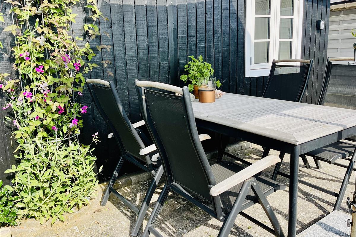 Outside, there is both an open and a covered terrace, as well as a small garden with garden furniture and a grill. The property is fenced.