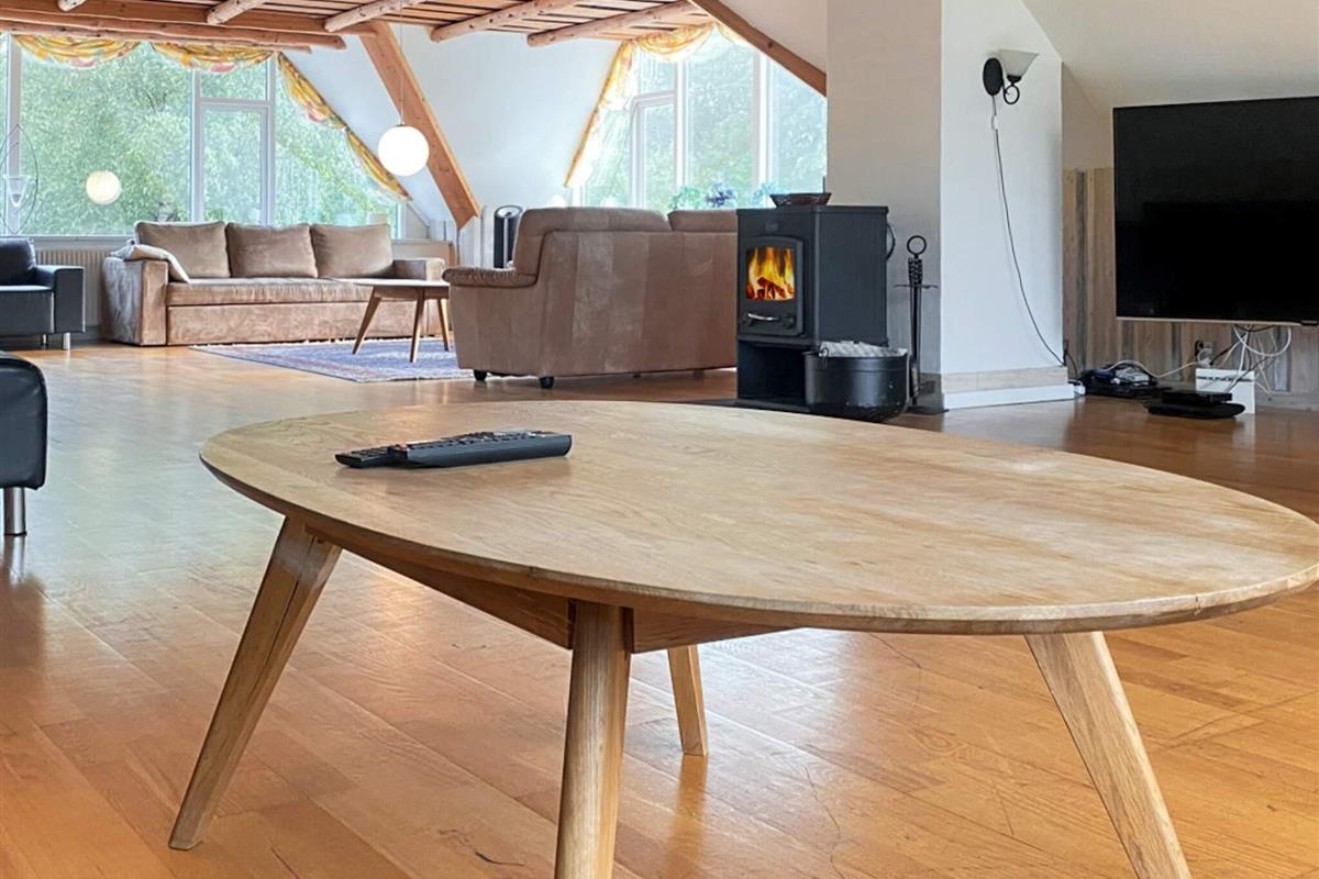 Vom 95 m² großen Wohnzimmer im 1. Stock aus haben Sie das Glück, die Hirsche beobachten zu können. Alternativ dazu versammeln Síe sich mit der Familie um den 65-Zoll-Fernseher. Neben dem 20 m² großen Pool mit Wasserrutsche lädt auch der 7-Personen-Whirlpool, der sich neben dem Pool befindet, zum Badespaß ein. Oben im 1. Stock befindet sich zudem die Sauna mit Zugang vom Badezimmer aus.