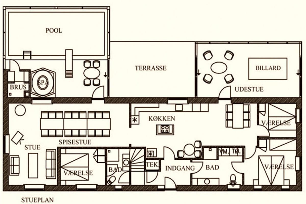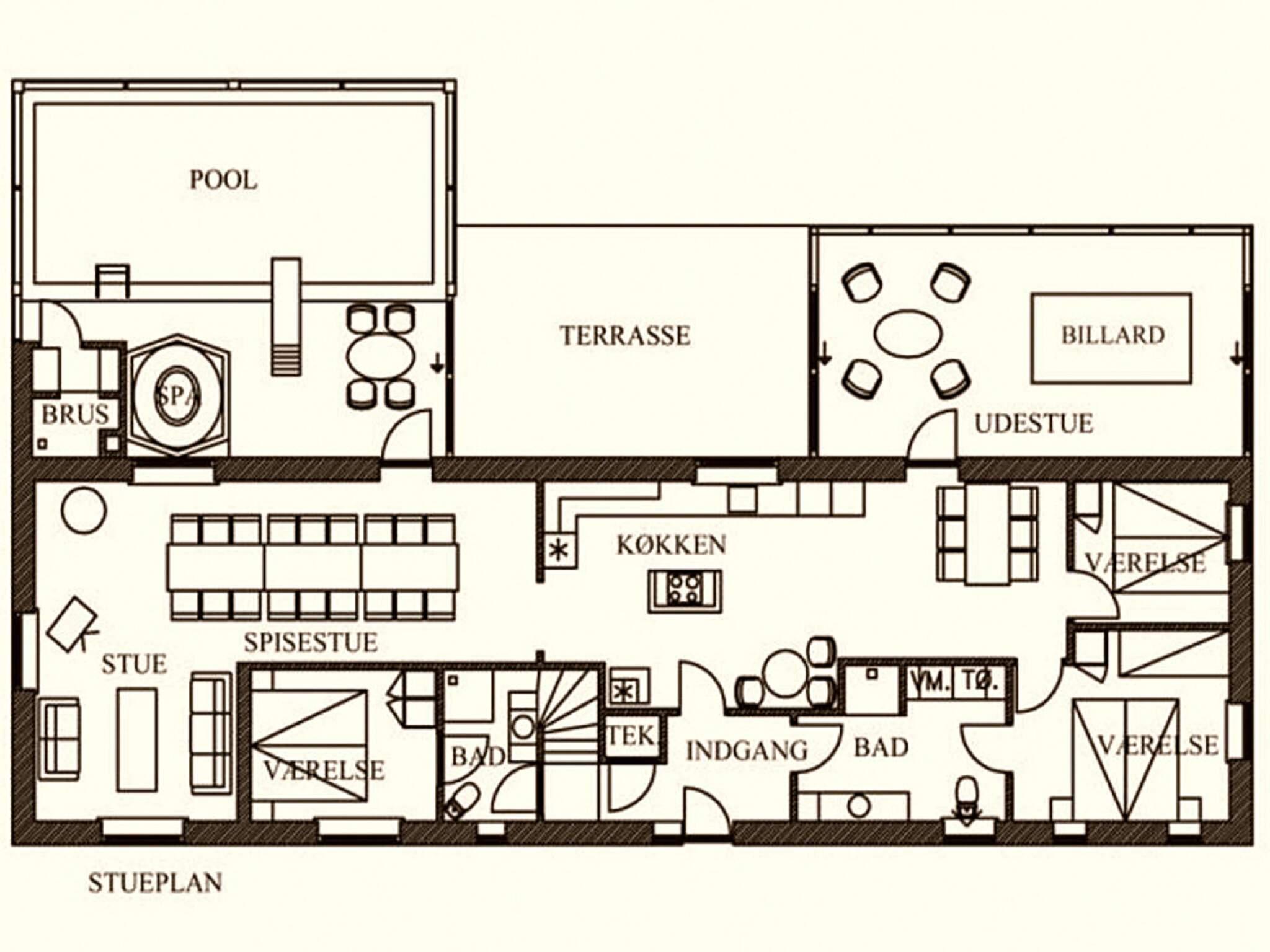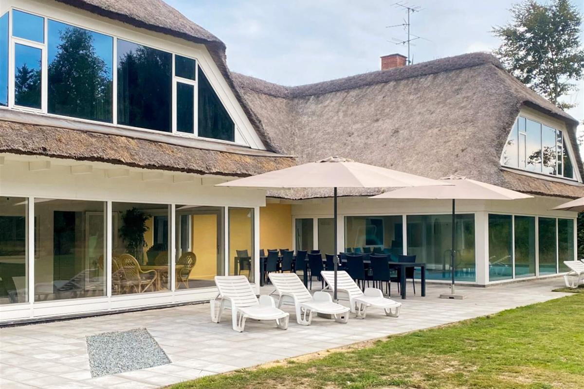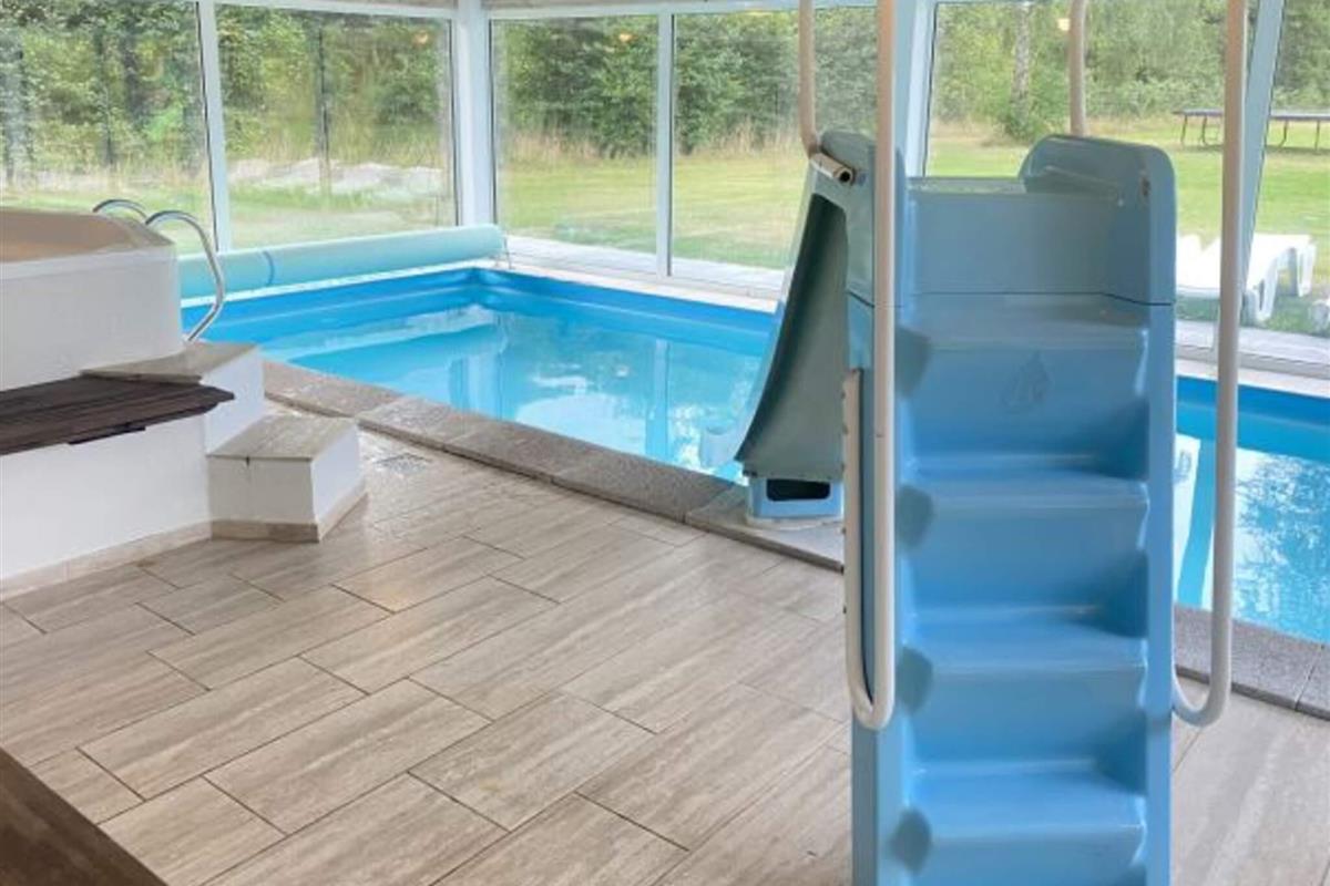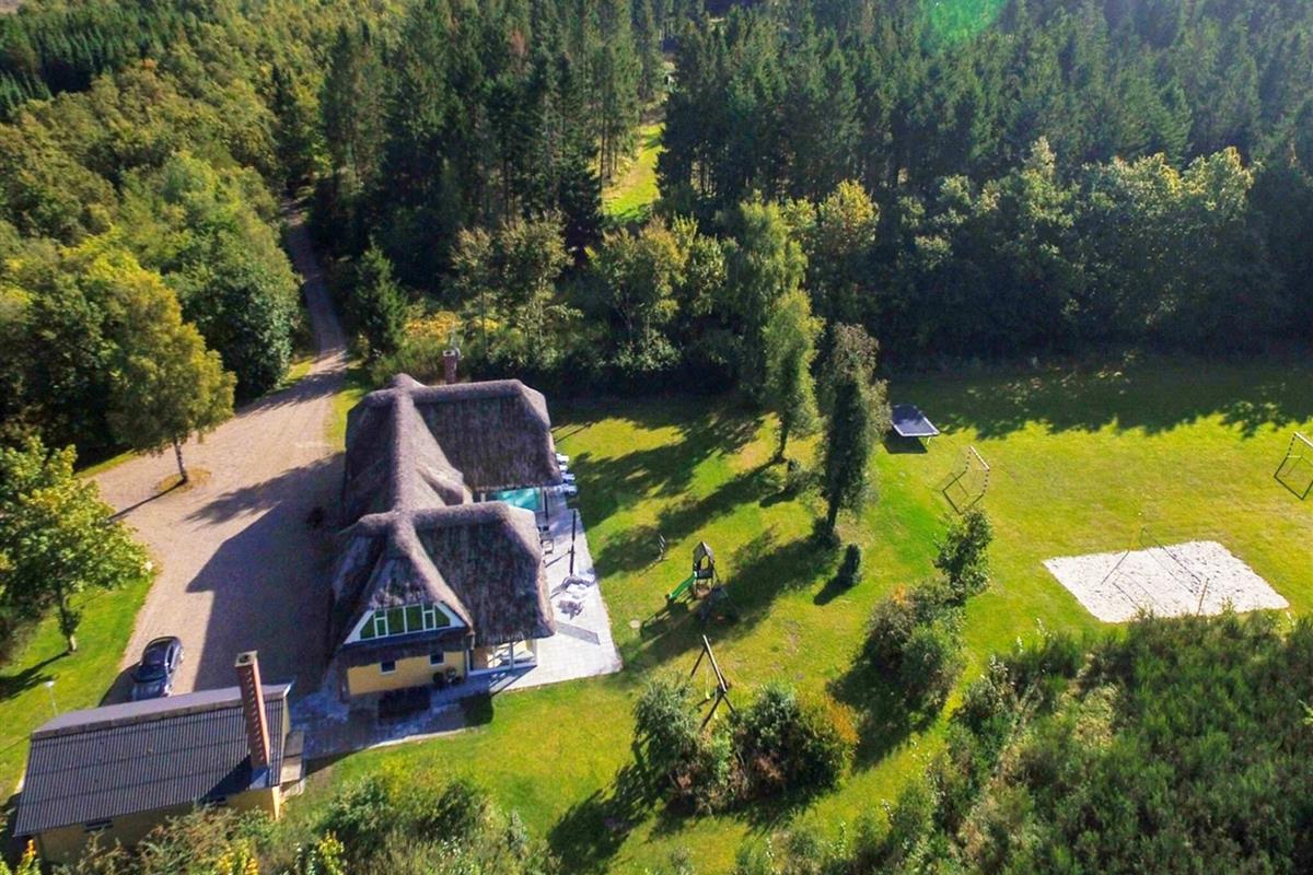 Das Ferienhaus hat 3 Badezimmer mit Toilette, Waschbecken und Dusche im Poolraum. Es wurde 1998 gebaut und 2022 teilweise renoviert. Es wird mit einem Pelletofen und einem Holzofen auf beiden Etagen beheizt. Das Anwesen bietet 24 Schlafplätze: 5 Zimmer mit Doppelbett, 3 Zimmer mit Doppelbett und 2 Kojen im Etagenbett sowie 1 Schlafsofa im Wohnzimmer für 2 Personen. Max. 2 Haustiere sind erlaubt. Im Haus gibt es kein Pay TV.