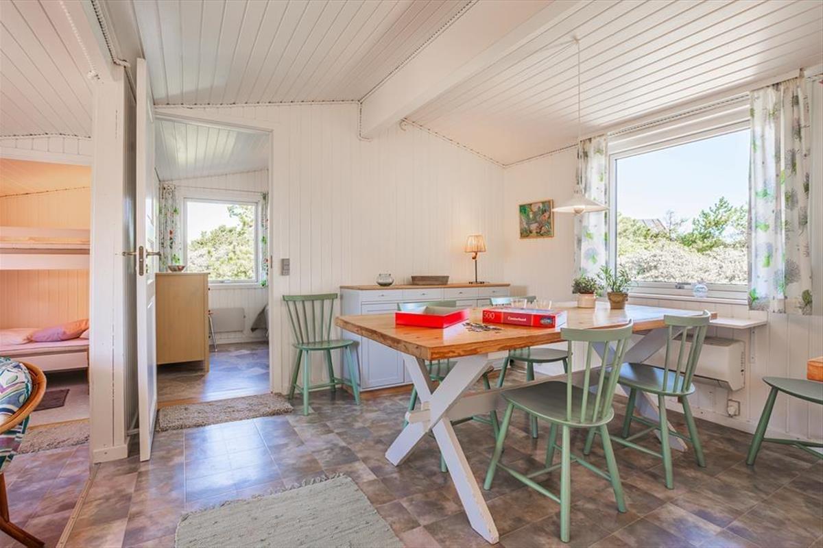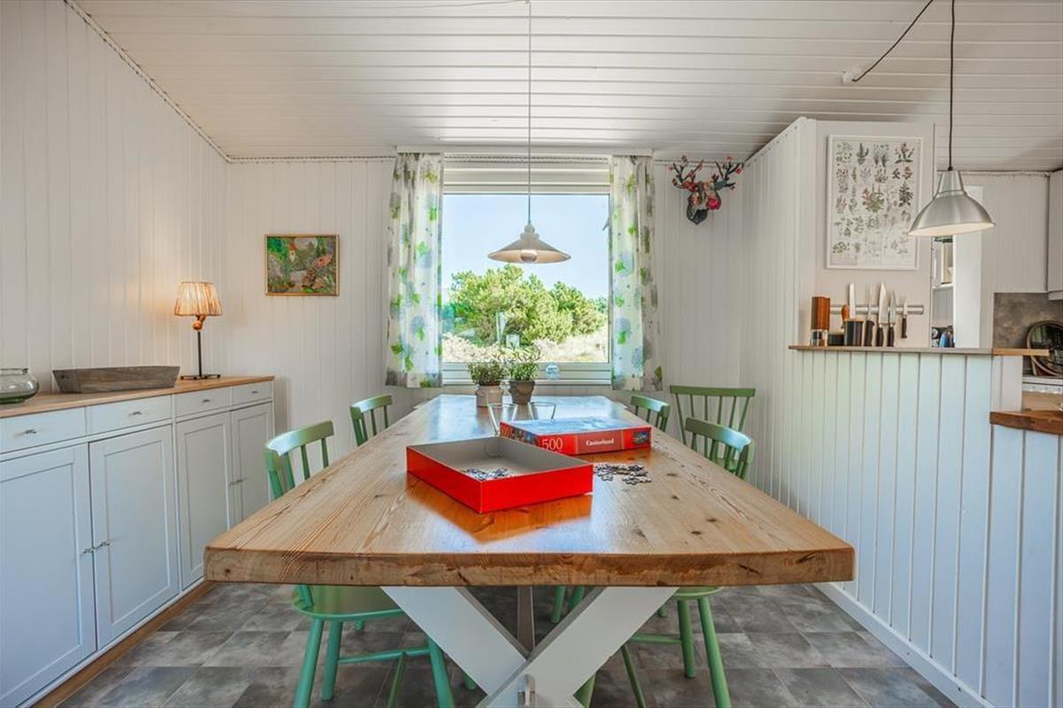 Auch wenn die nordjütische Natur mit ihrer Schönheit lockt, ist es verführerisch, in den gemütlichen Räumen des Hauses zu bleiben. Stellt euch vor, ihr habt alle Zeit der Welt zum Lesen, Puzzeln, Stricken oder Filme schauen – genau dazu laden das Wohnzimmer und der offene Küchen- und Essbereich ein. Hier gibt es einen Esstisch, einen Kaminofen und zwei Sofaecken, die dazu einladen, die Ferientage in angenehmem Tempo zu verbringen. In der Mitte befindet sich eine Küche, ausgestattet mit allem, was ihr für die Zubereitung leckerer Mahlzeiten braucht. Ein Badezimmer mit Dusche und zwei Schlafzimmer runden die Einrichtung ab, und im Annex gibt es weitere Schlafplätze für alle, die diesen bevorzugen.