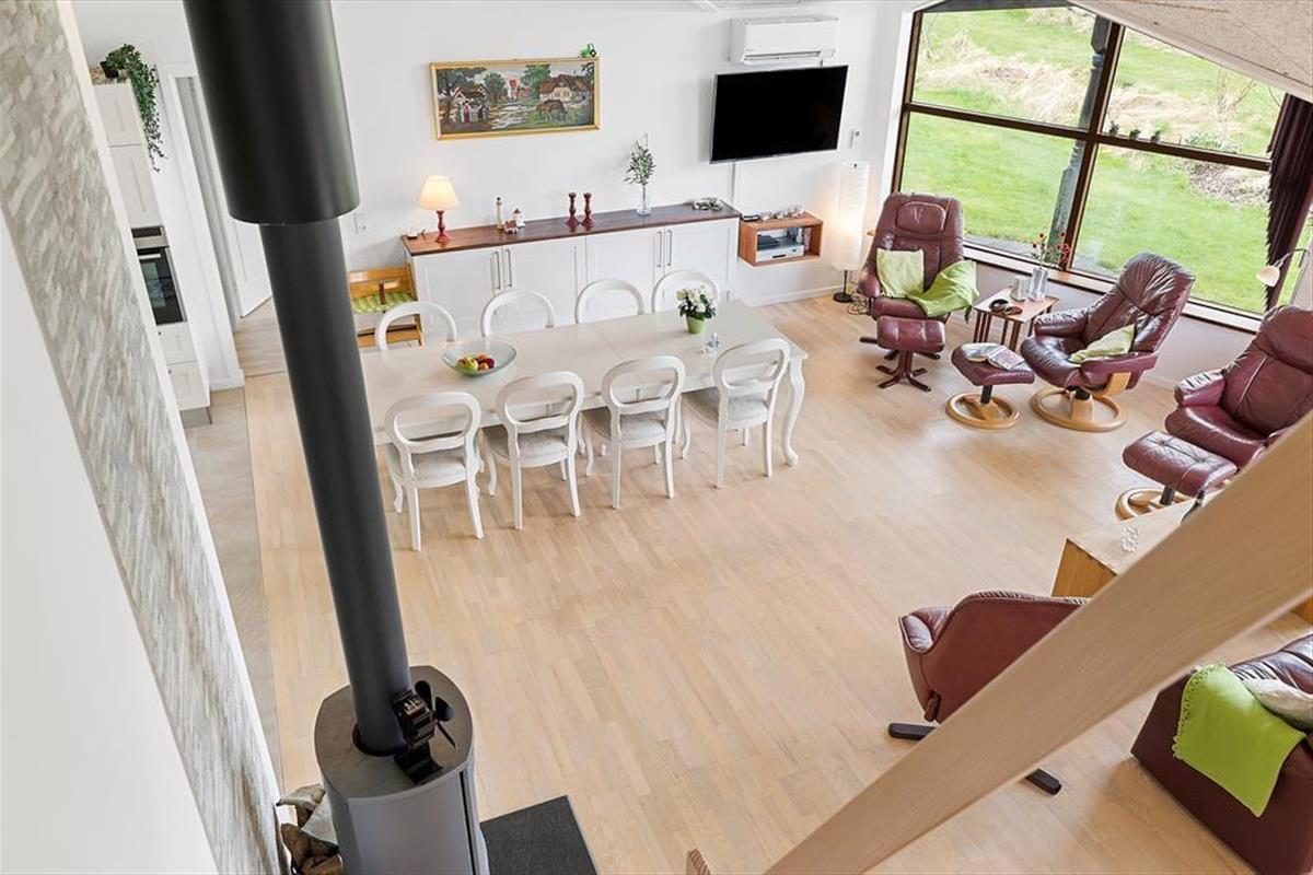 Innen erwartet dich eine helle und freundliche Atmosphäre mit viel Platz für Entspannung und gemütliches Beisammensein. Das Wohnzimmer ist offen bis unter den Giebel und große Fenster lassen das Tageslicht hereinströmen, wodurch ein luftiges Raumgefühl entsteht. Wenn der Abend hereinbricht, könnt ihr den Kaminofen anzünden und die wohlige Wärme genießen, während ihr es euch auf dem Sofa mit einer Tasse Tee und einem Kartenspiel gemütlich macht. Es ist etwas ganz Besonderes, sich in Ruhe zurückziehen zu können – und genau das ist hier möglich. Wenn die Energie hoch ist, könnt ihr euch in den Aktivitätsraum des Hauses begeben – dort stehen Tischtennis, Billard, Airhockey und Darts bereit, um Familienwettkämpfe auszutragen. Und nach einem aktiven Tag lockt die Sauna mit wohliger Wärme und Entspannung als das Tüpfelchen auf dem i.