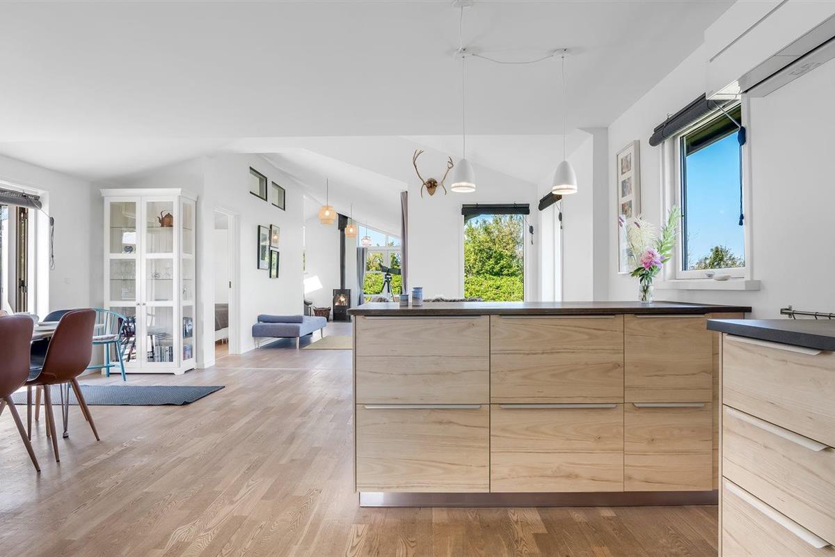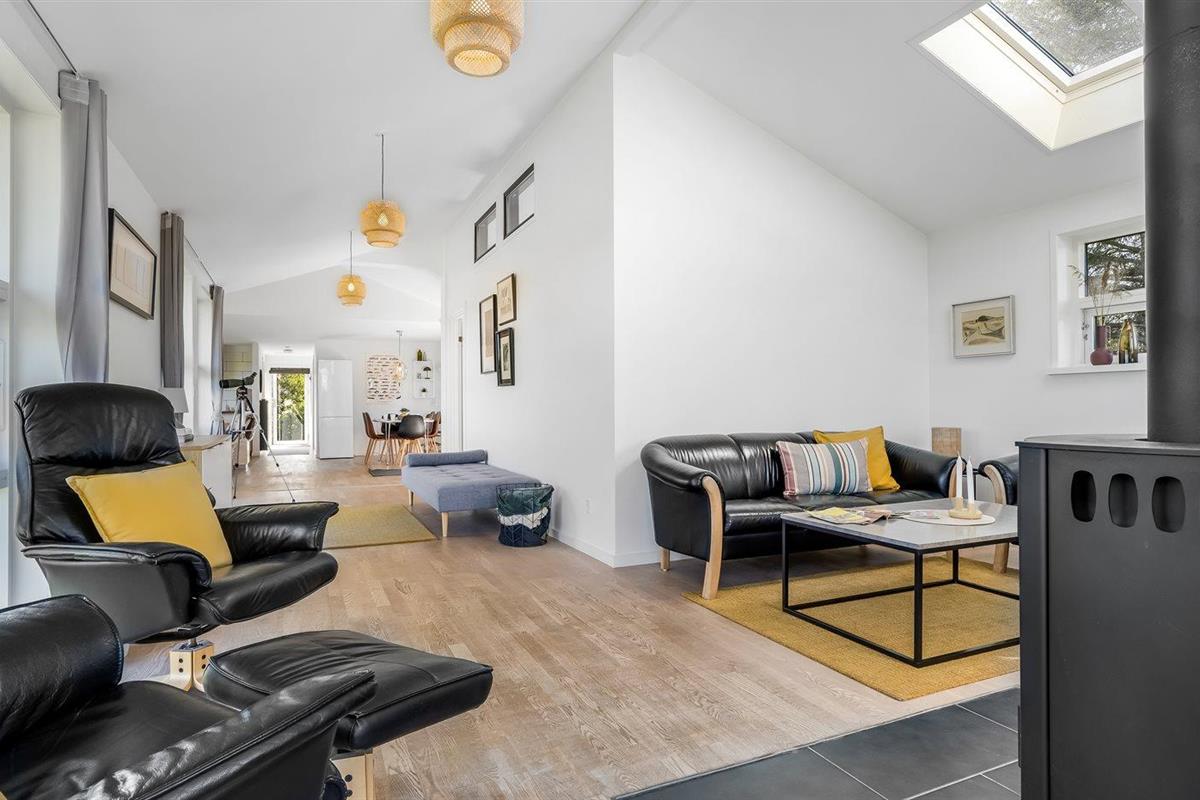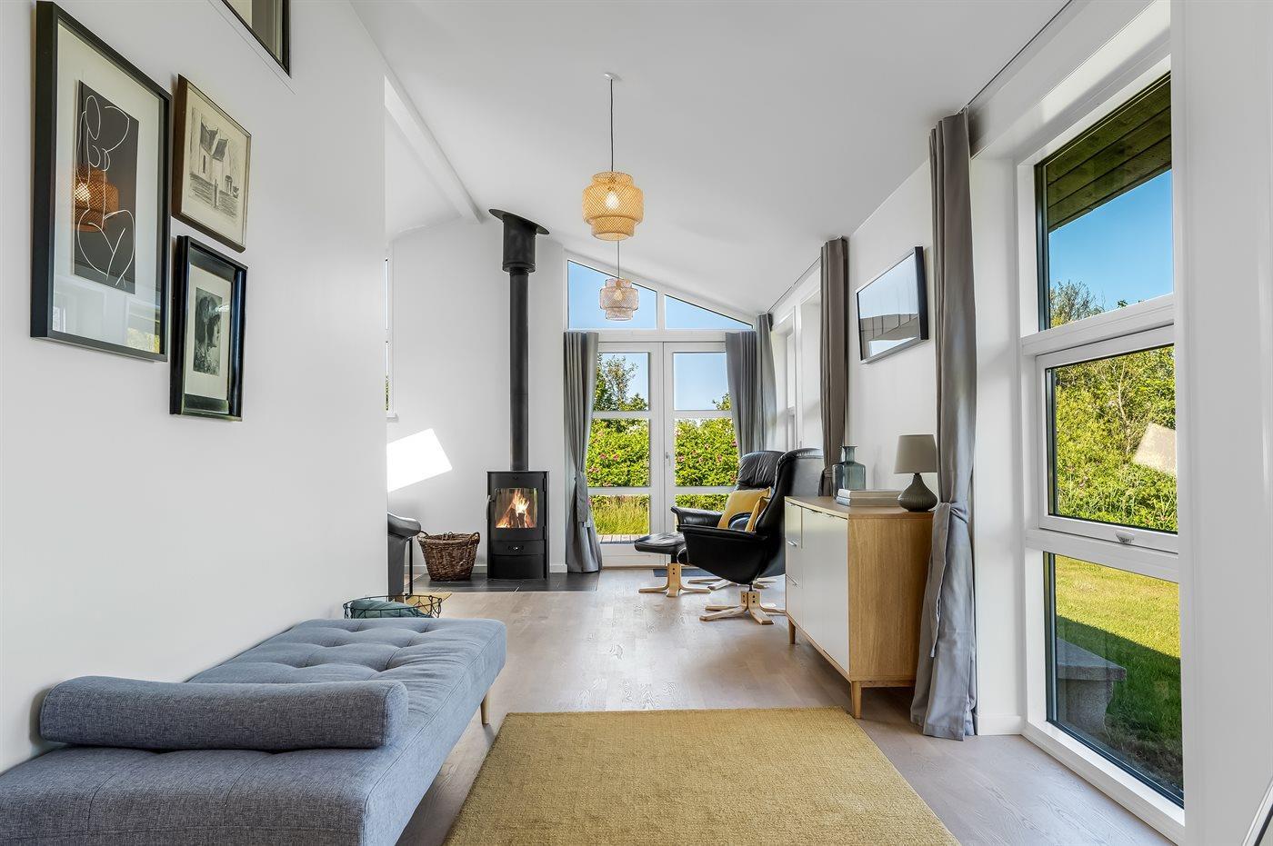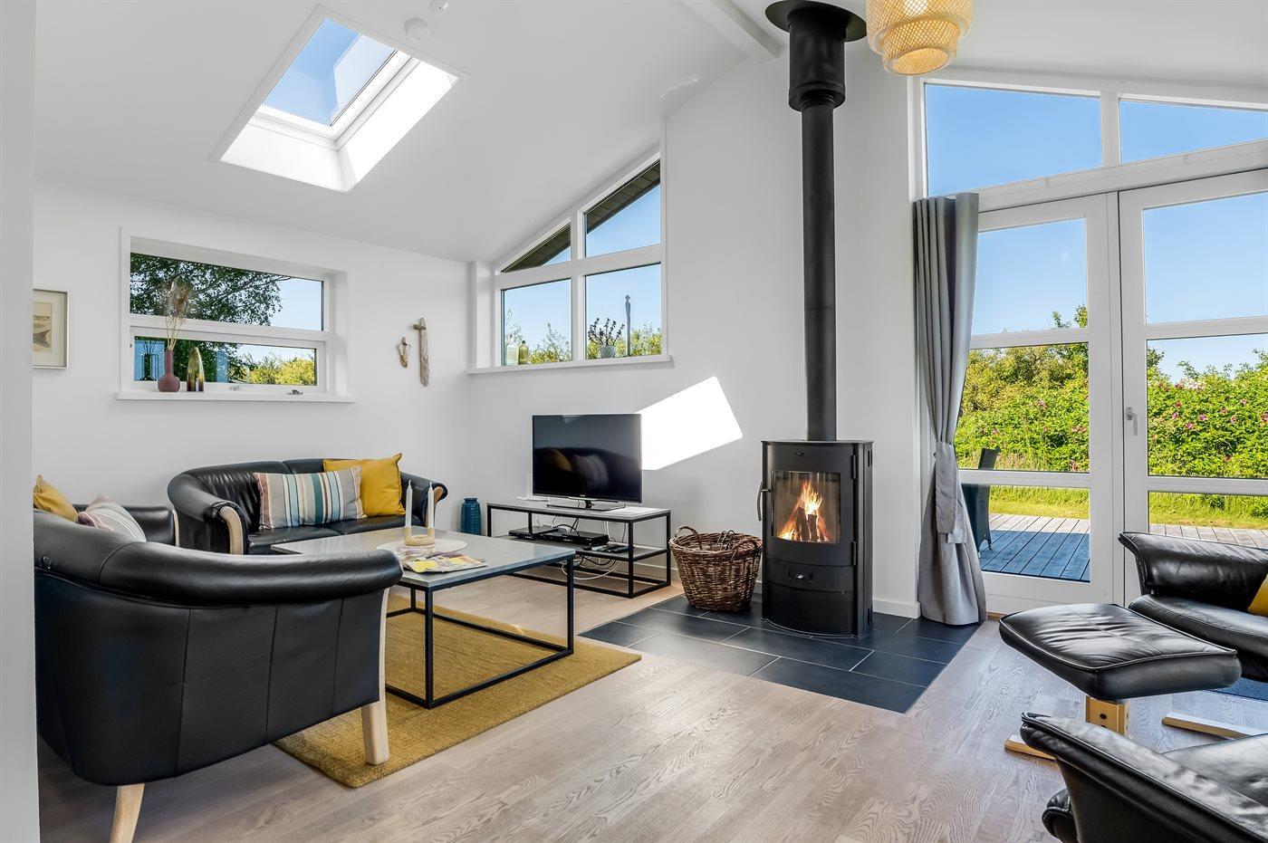 Modern vakantiehuis nabij zee met terras, houtkachel en warmtepomp, geschikt voor 6 personen en huisdieren.