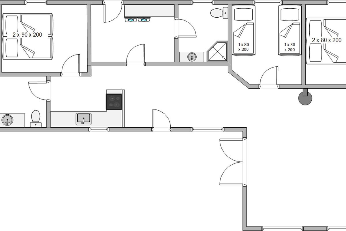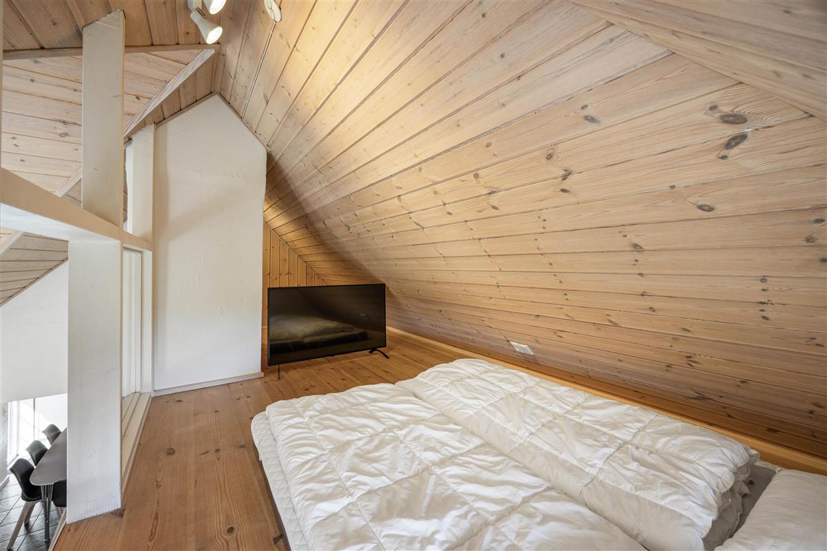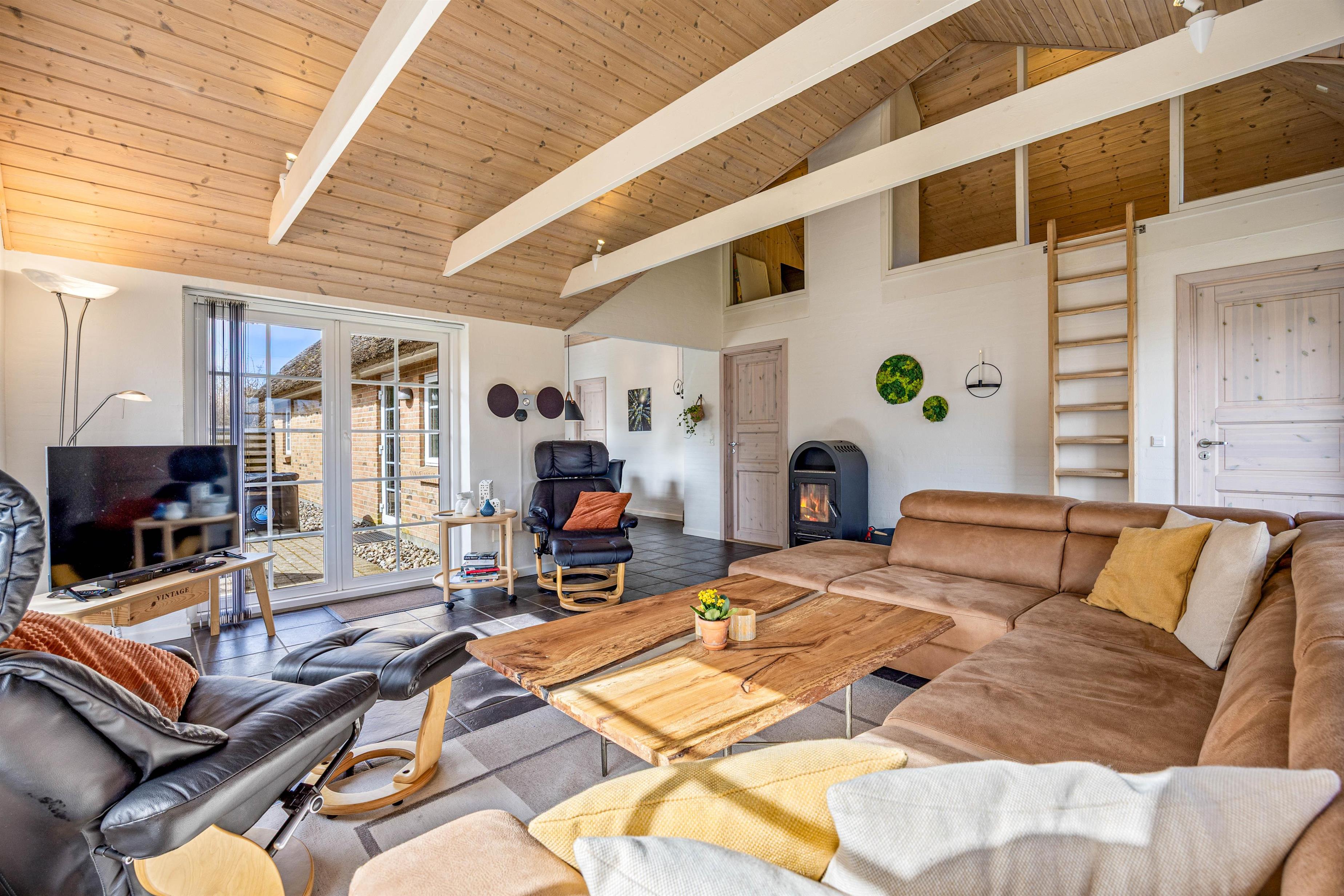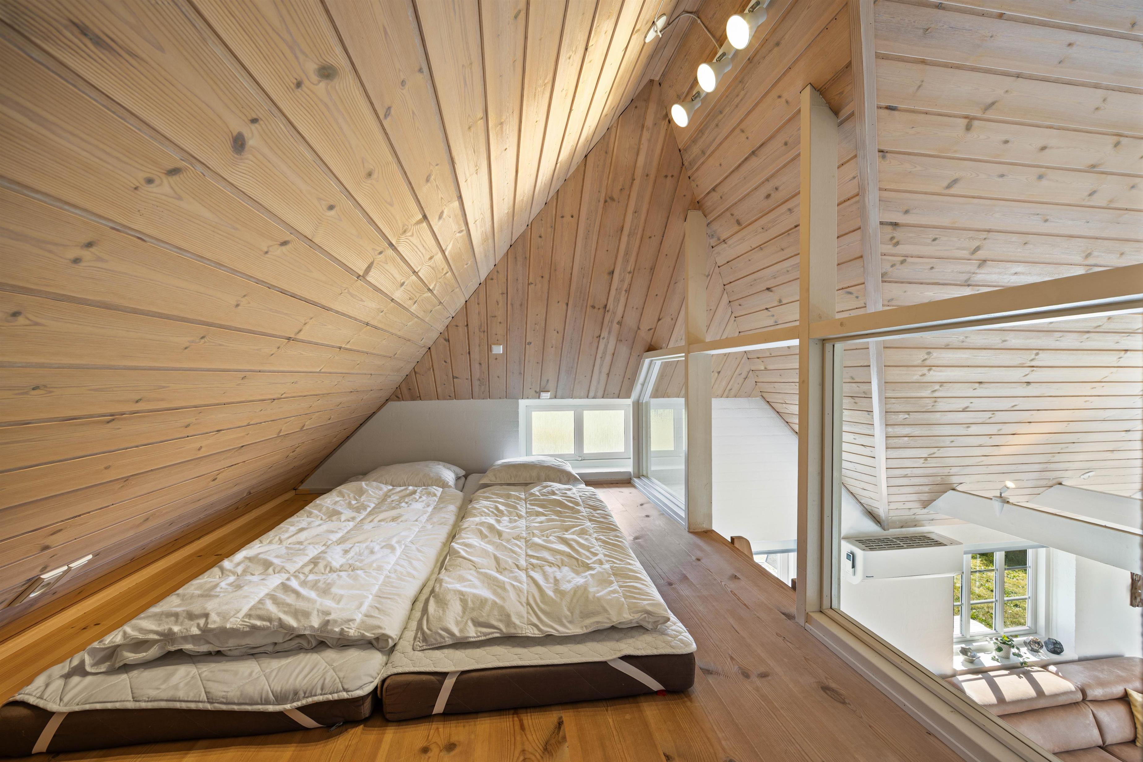 The holiday home features an energy-efficient heat pump for economical heating. Alternatively, there's a wood-burning stove, perfect for cosy evenings by the fire while creating a relaxed holiday atmosphere. There are three bedrooms in total, two with double beds and one with twin beds. The mezzanine level offers two additional mattresses.