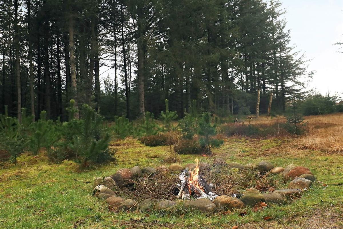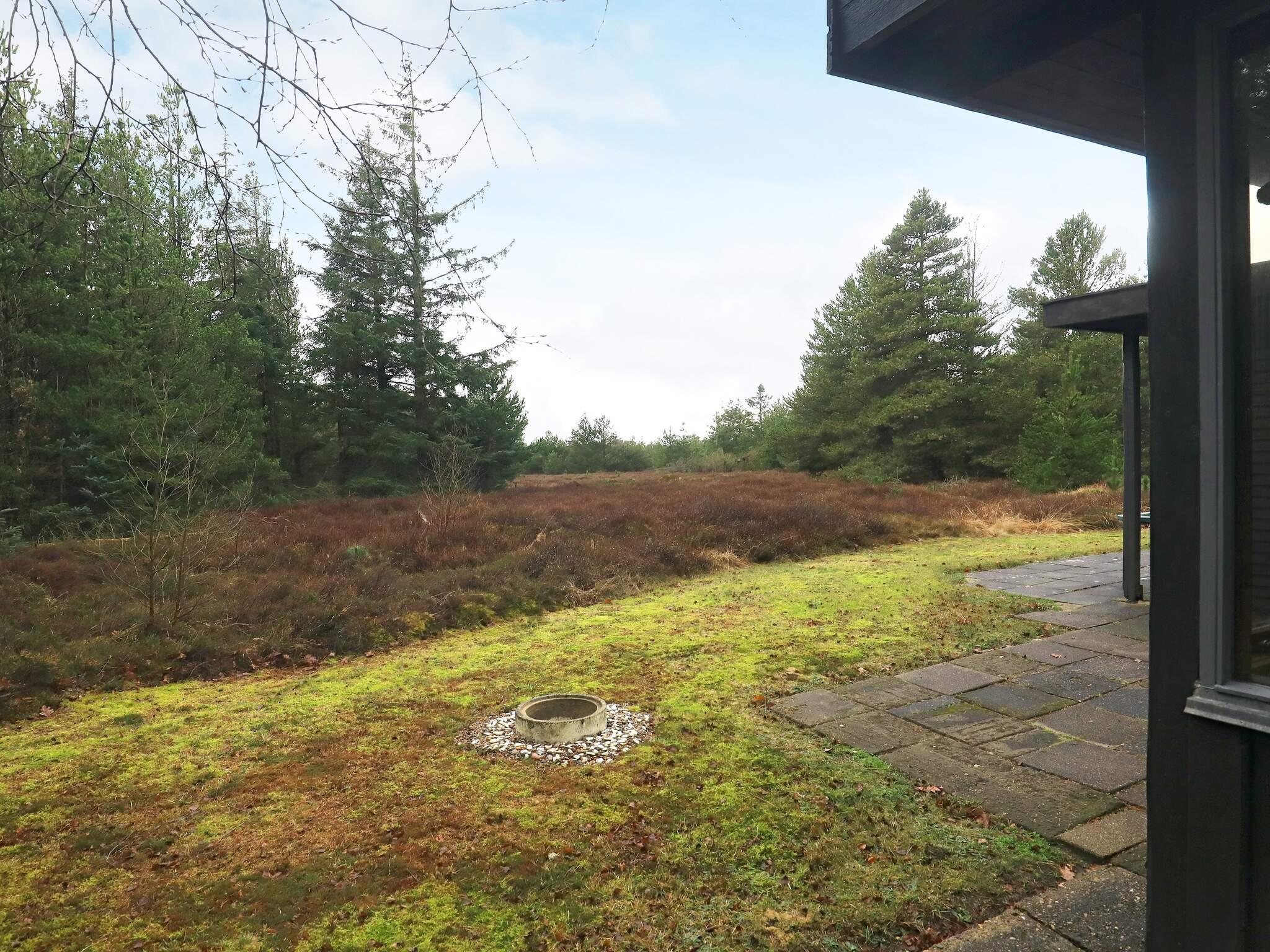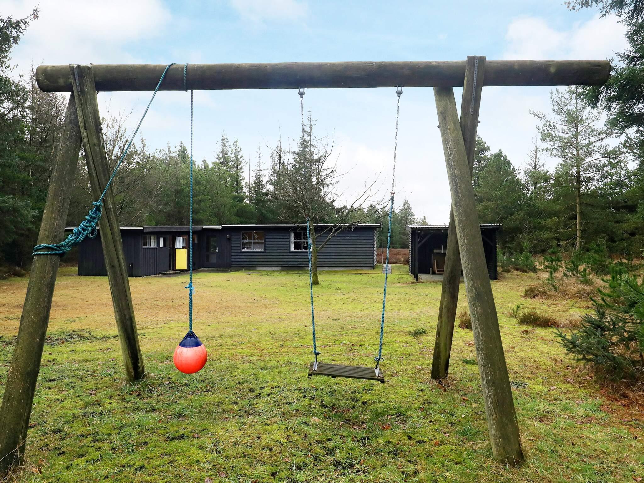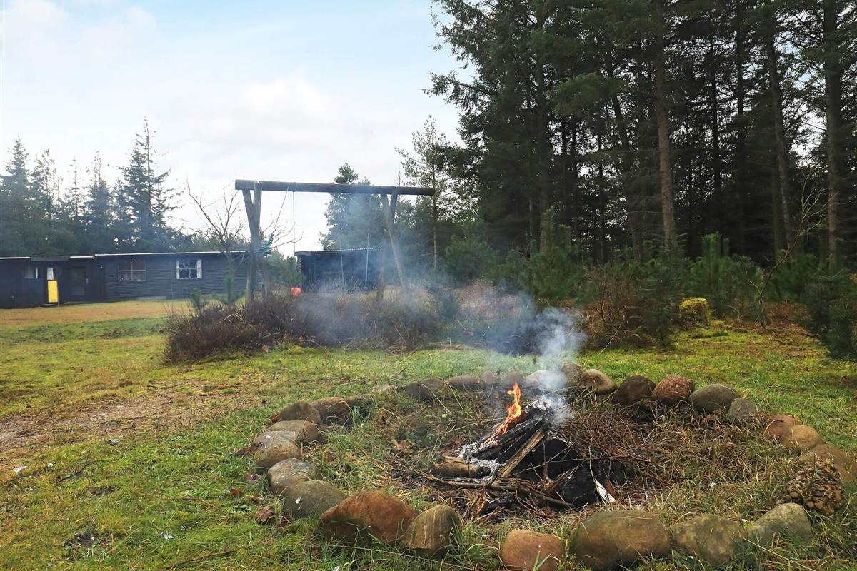 Im Garten gibt es eine Schaukel und eine große Feuerstelle. Das Haus steht auf einem naturbelassenen Grundstück, das teilweise mit Fichten, Moos und Büschen bewachsen ist.