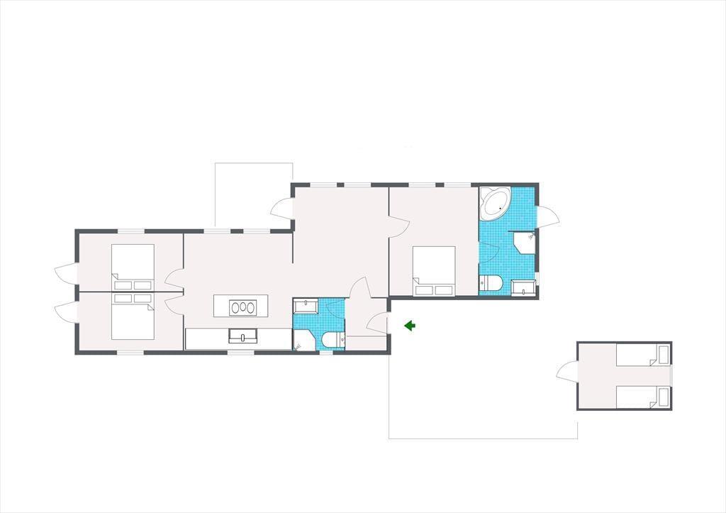 Das Ferienhaus ist mit einem räumlichen und schönen Wohnraum eingerichtet, perfekt für Entspannung und Gemütlichkeit. Hier können Sie Yatzy spielen, oder Sie können sich in ein gutes Buch vertiefen. Es gibt eine fantastische tolle und offene Küche mit allen modernen Bequemlichkeiten. In Verbindung mit der Küche haben Sie ein wirklich schönes Essbereich, wovon Sie den Blick gegen das Meer genießen können. Sie haben drei schöne Schlafzimmer mit Doppelbetten und gutem Schrankplatz sowie zwei gute Badezimmer mit Dusche. In dem einen haben Sie sogar die Möglichkeit, das Spa des Hauses zu benutzen. In dem Nebengebäude gibt es zwei Schlafplätze. Alles steht sehr hell und einladend, und hier haben Sie wirklich die Möglichkeit das Leben zu genießen mit Entspannung und Wellness. Auf der tollen Terrasse können Sie ab Morgen bis Abend die Sonne genießen.