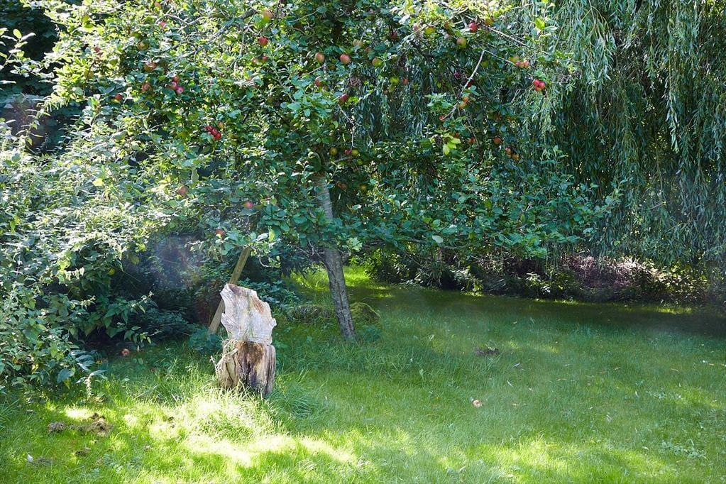 Der dicht bewachsene Garten wird durch hohe Bäume, Büsche und Farne geprägt. Teile der Rasenfläche und mehrere kleine Terrassen sind angenehm sonnig, sodass du es dir hier wunderbar mit einem frischen Becher Kaffee und einem spannenden Buch gemütlich machen kannst. Die Kinder werden das verwunschen anmutende Grundstück lieben und stundenlang Fangen spielen oder auf Entdeckungstour im Grünen gehen.