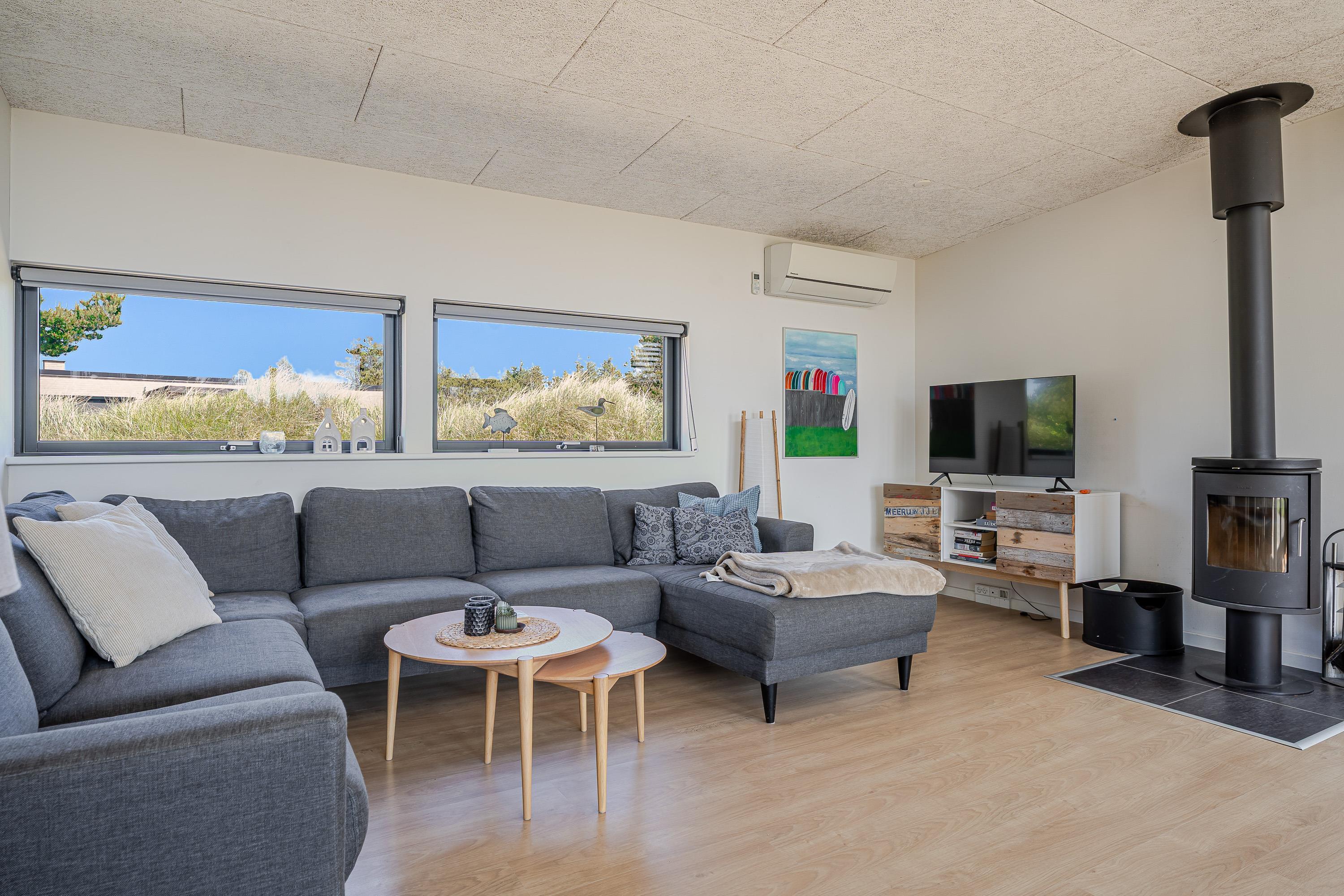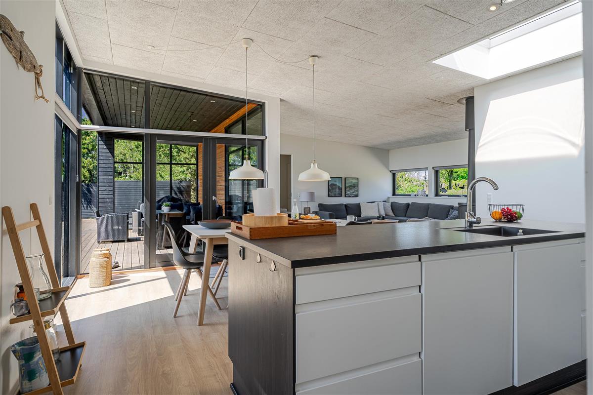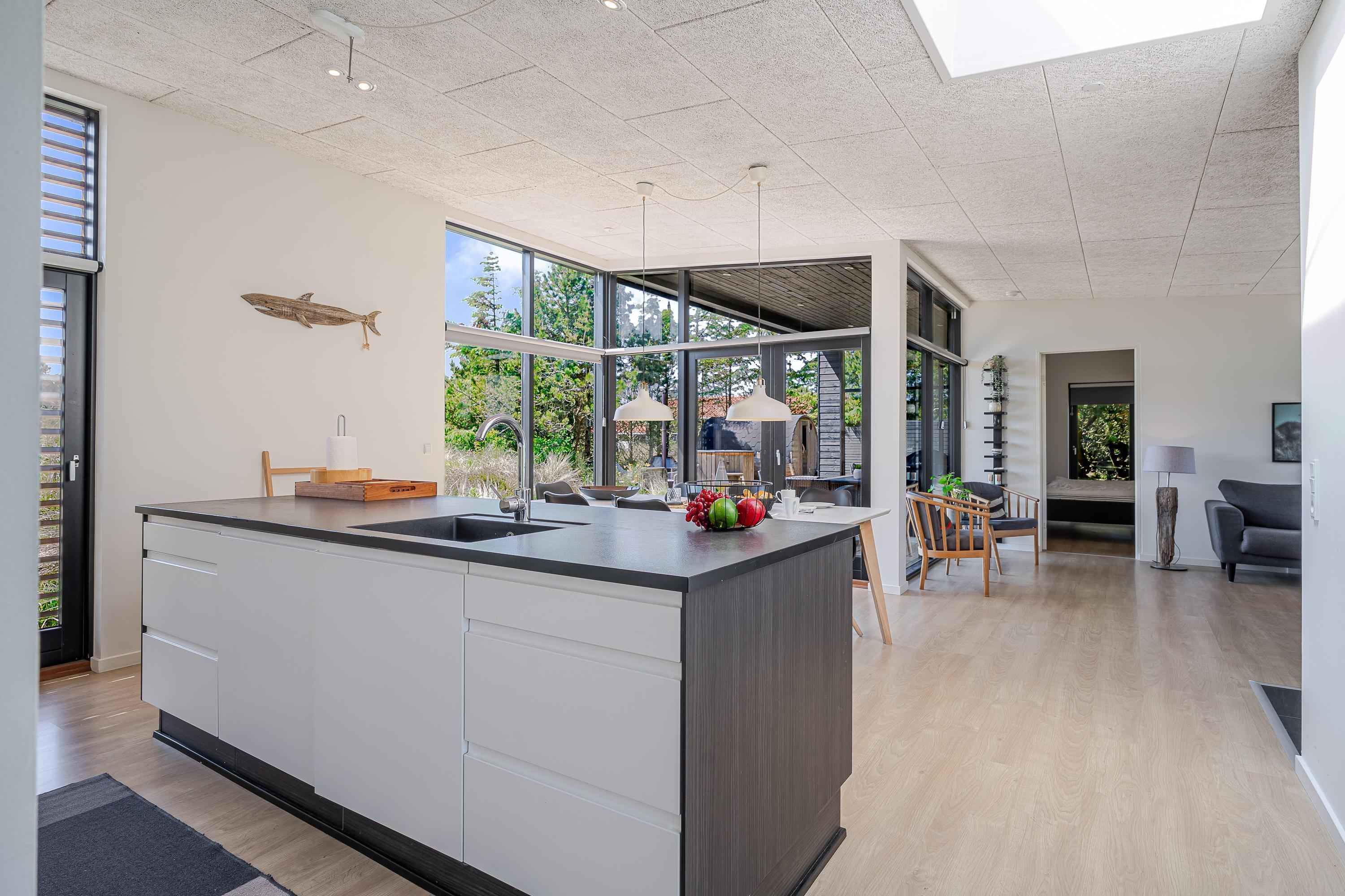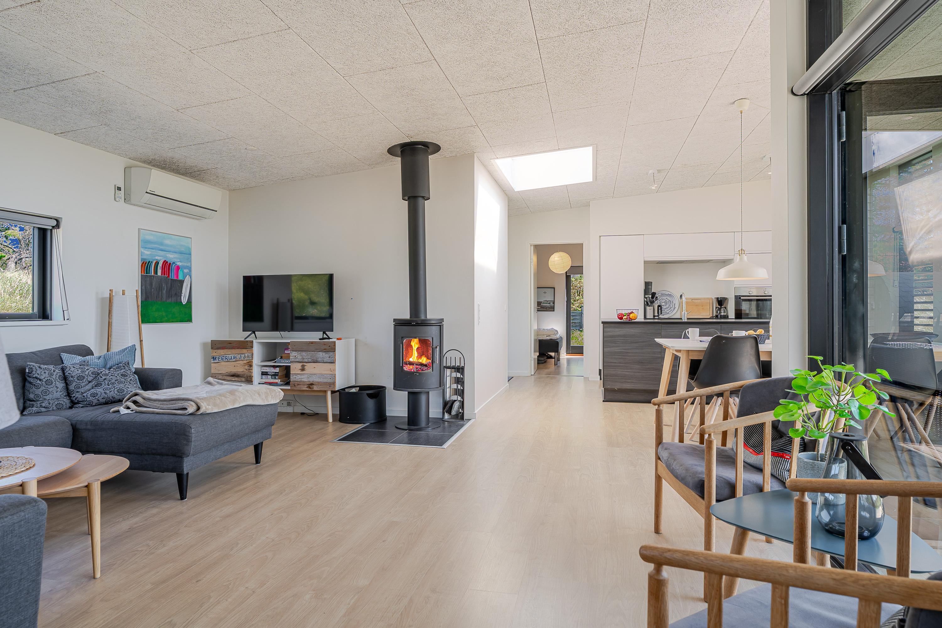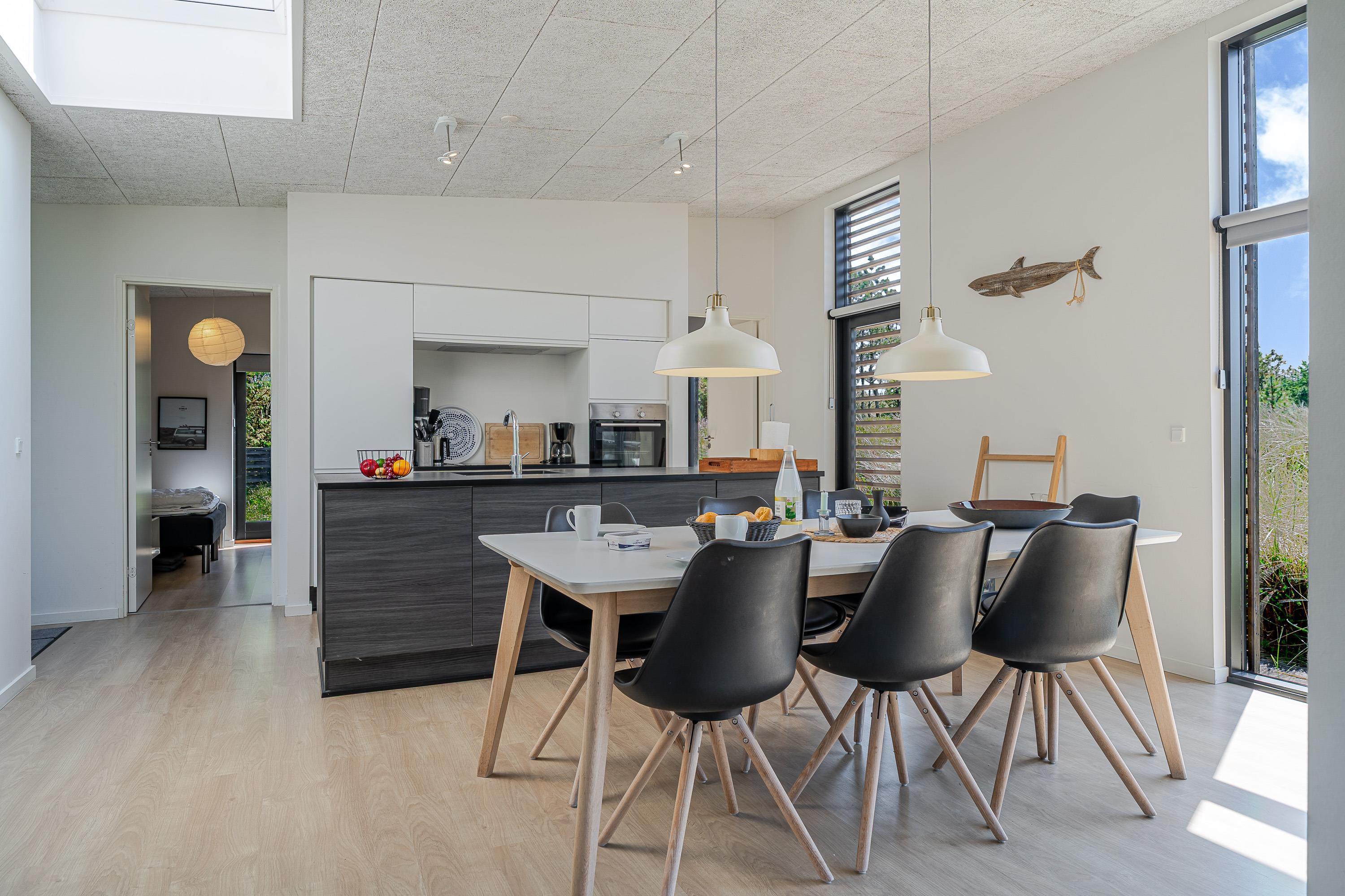 When you enter the house, you are greeted by a bright and welcoming atmosphere created by the open spaces and modern decor. The living room is equipped with a wood-burning stove, which not only adds warmth, but also a cozy atmosphere on cold evenings. Here you can relax in front of the house's TV, where you can use Chromecast to stream your favorite programs. The wireless internet ensures that you are always connected if you need it.