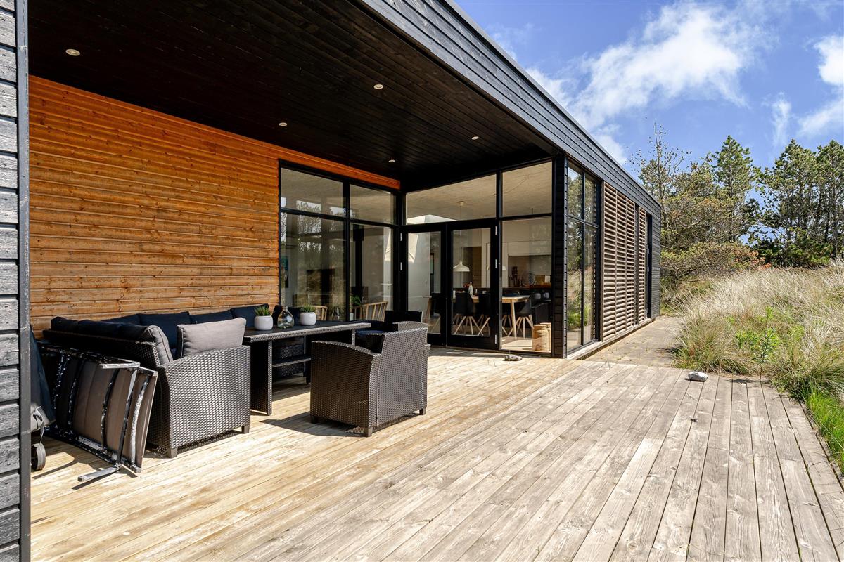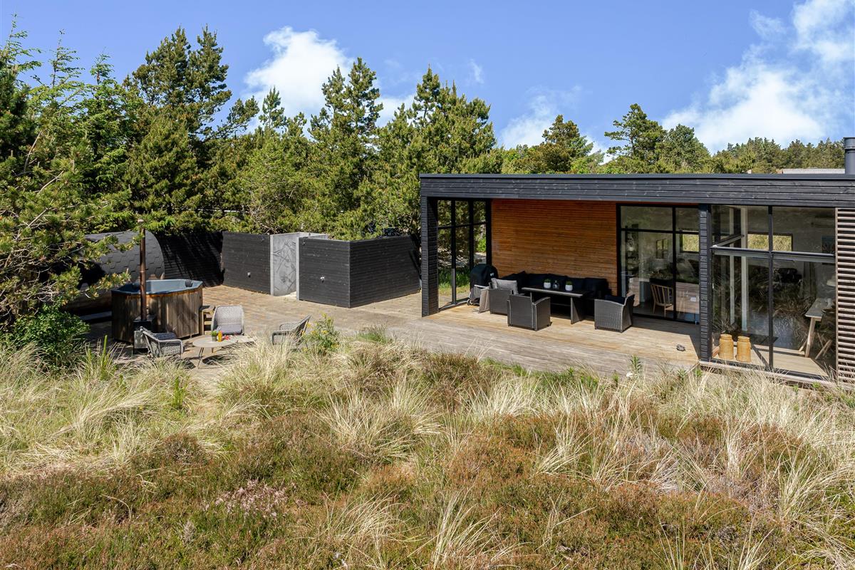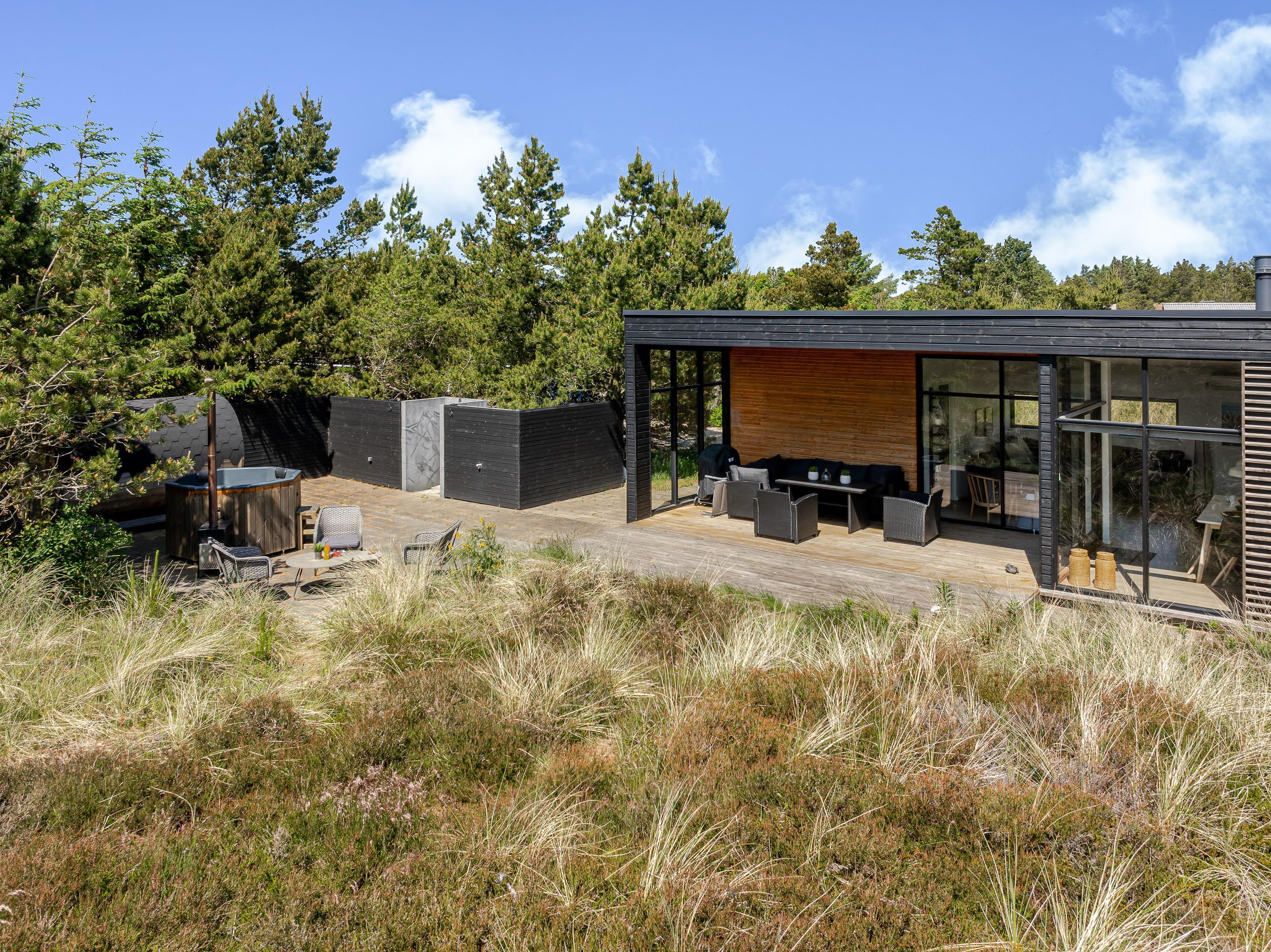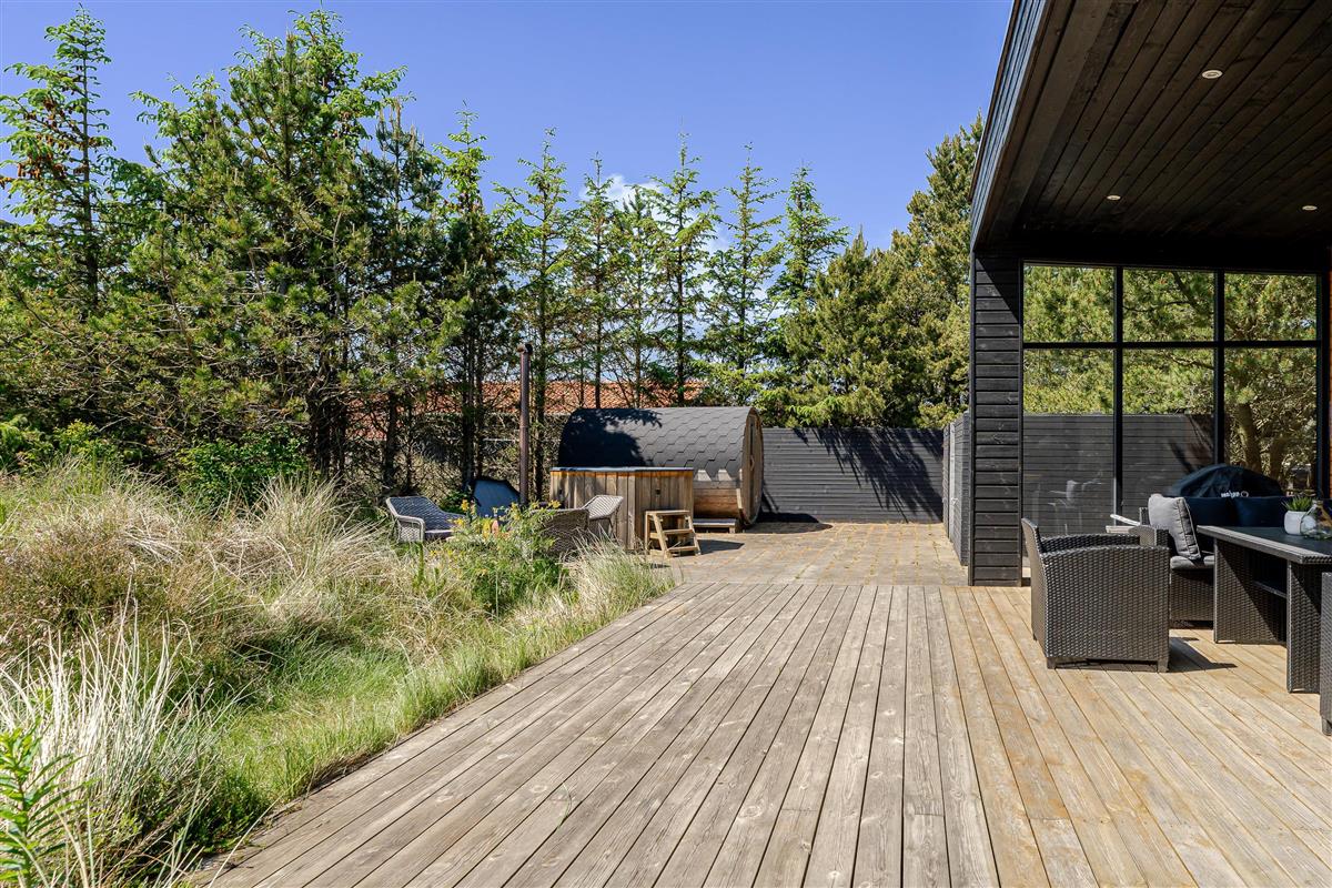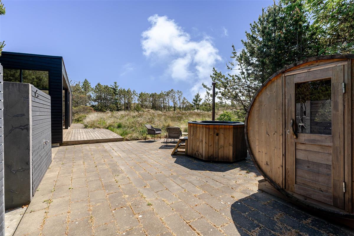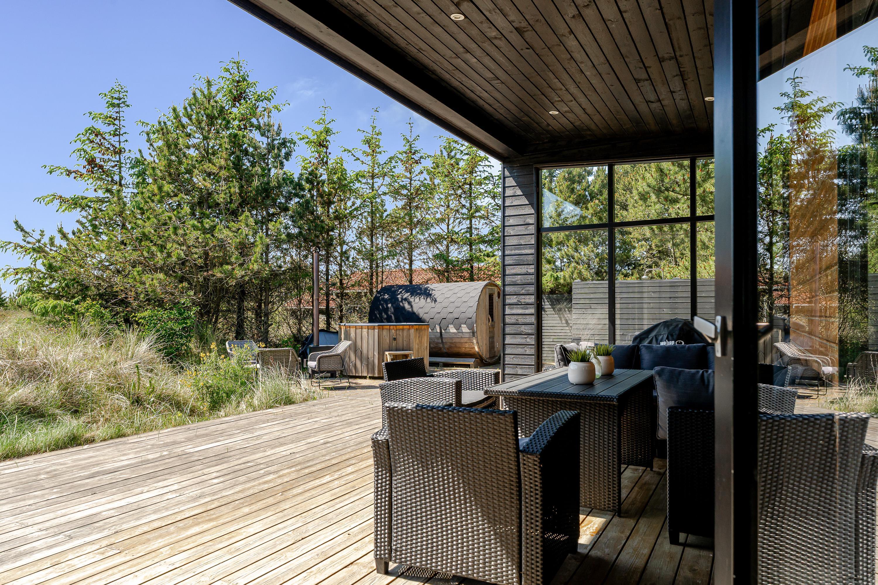 The outdoor area is just as impressive as the indoor one. Enjoy the covered terrace, where you can sit and relax with a good book, or enjoy a cup of coffee in the morning. Relax in the 6-person wilderness bath, which can accommodate up to 5 people, or treat yourself to a relaxing moment in the outdoor sauna. The outdoor shower is perfect for hot days, and the large garden provides plenty of space for outdoor play and activities.