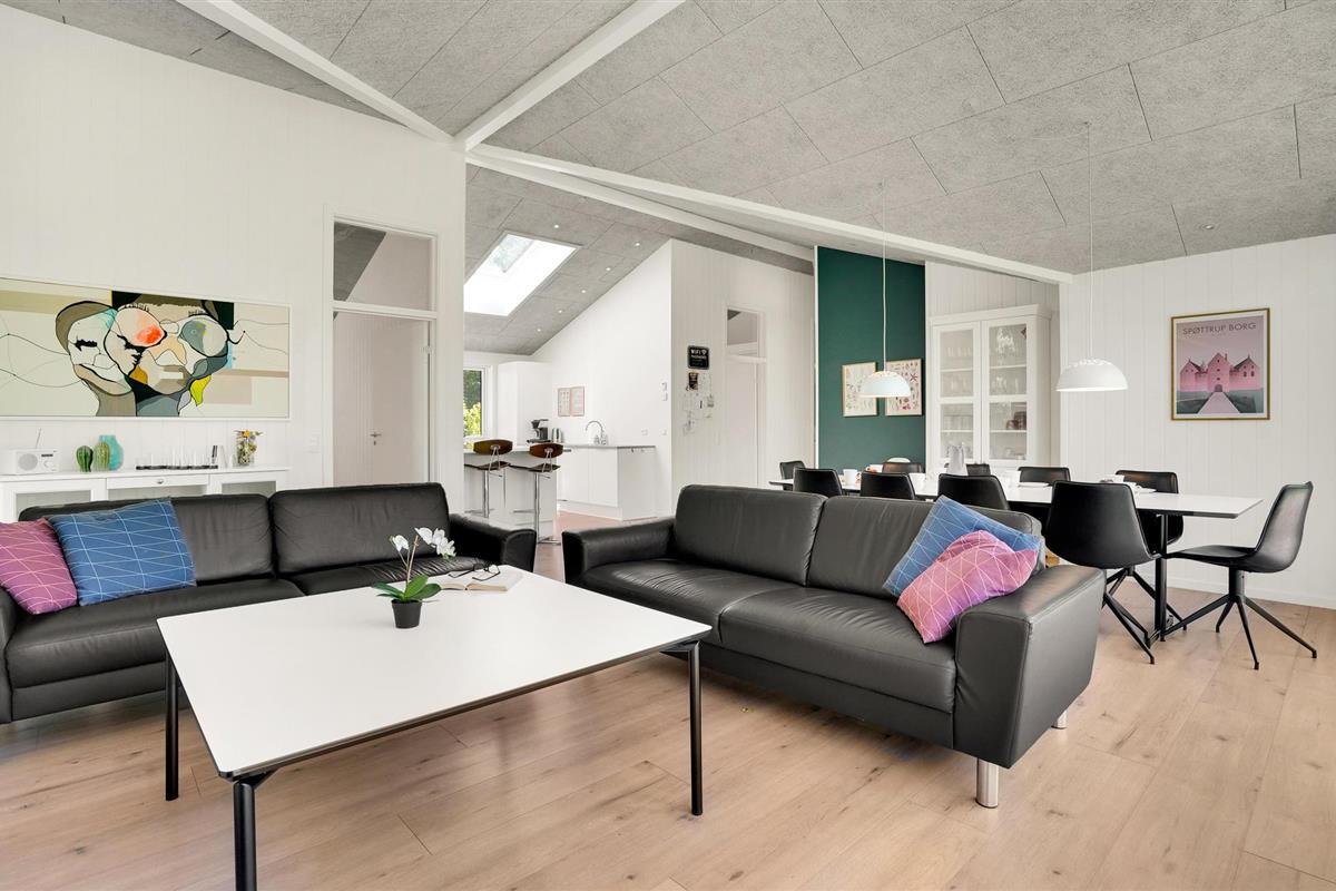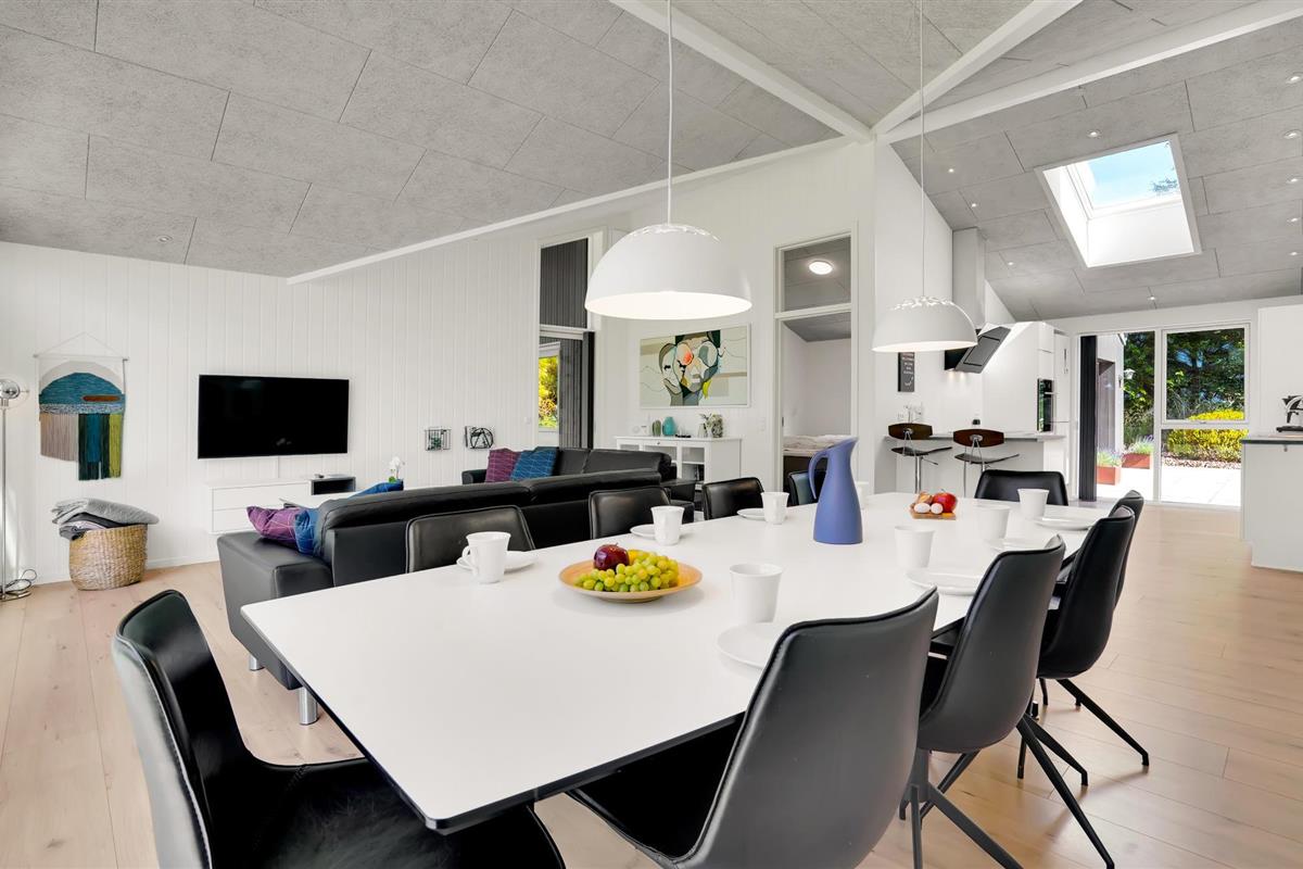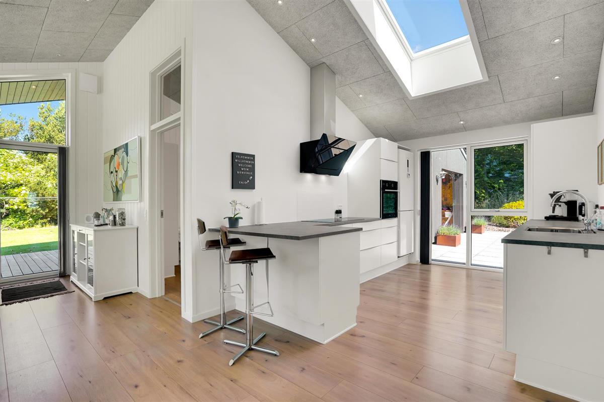 Hier vindt u een ruime woonkamer met veel licht en hoge plafonds. De grote ramen geven u het gevoel heel dicht bij de natuur te zijn. U kunt op de bank liggen of u verzamelen rond de eettafel terwijl u geniet van het prachtige uitzicht op de groene tuin en het fjord. De keuken is open en modern en nodigt u uit om te koken en plezier te maken met het hele gezin. Het huis heeft 4 slaapkamers en 2 badkamers en is ideaal voor een grote familie of een groep vrienden tot 10 personen.