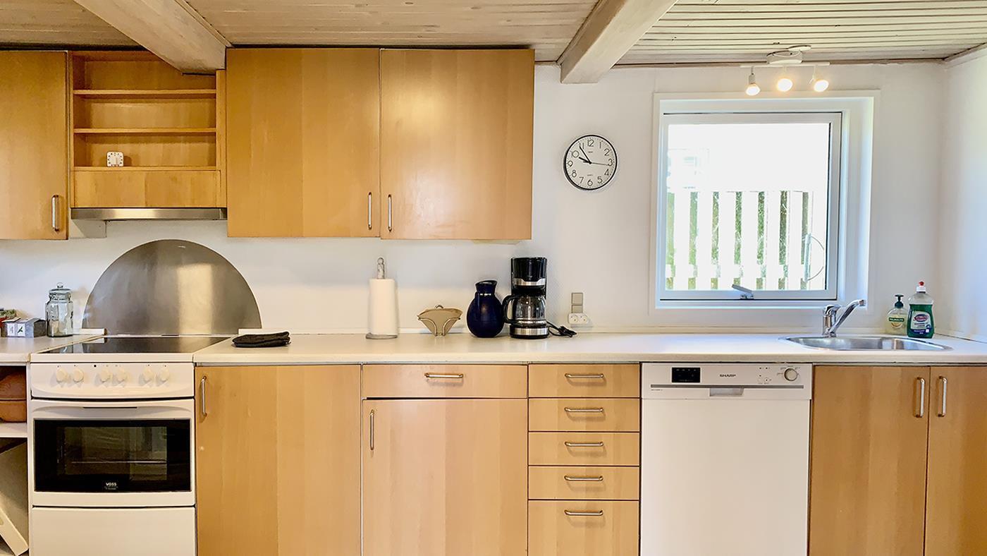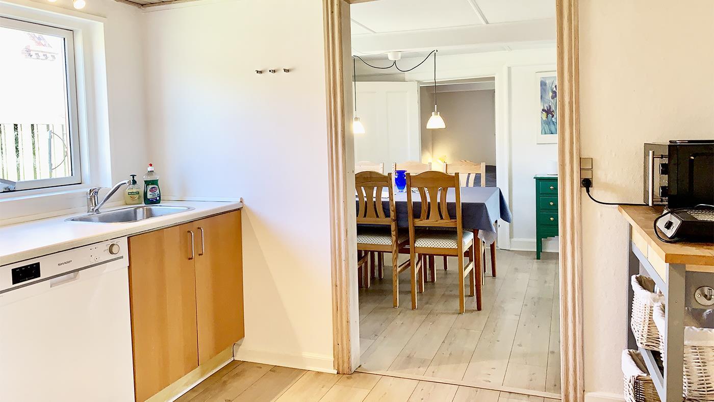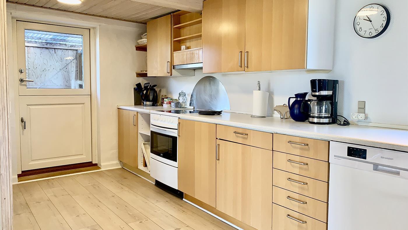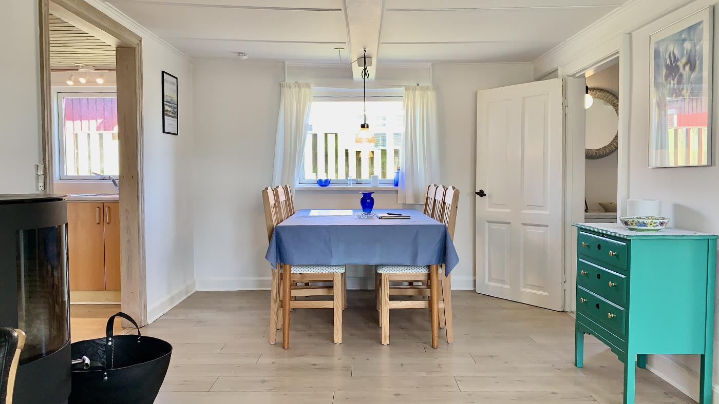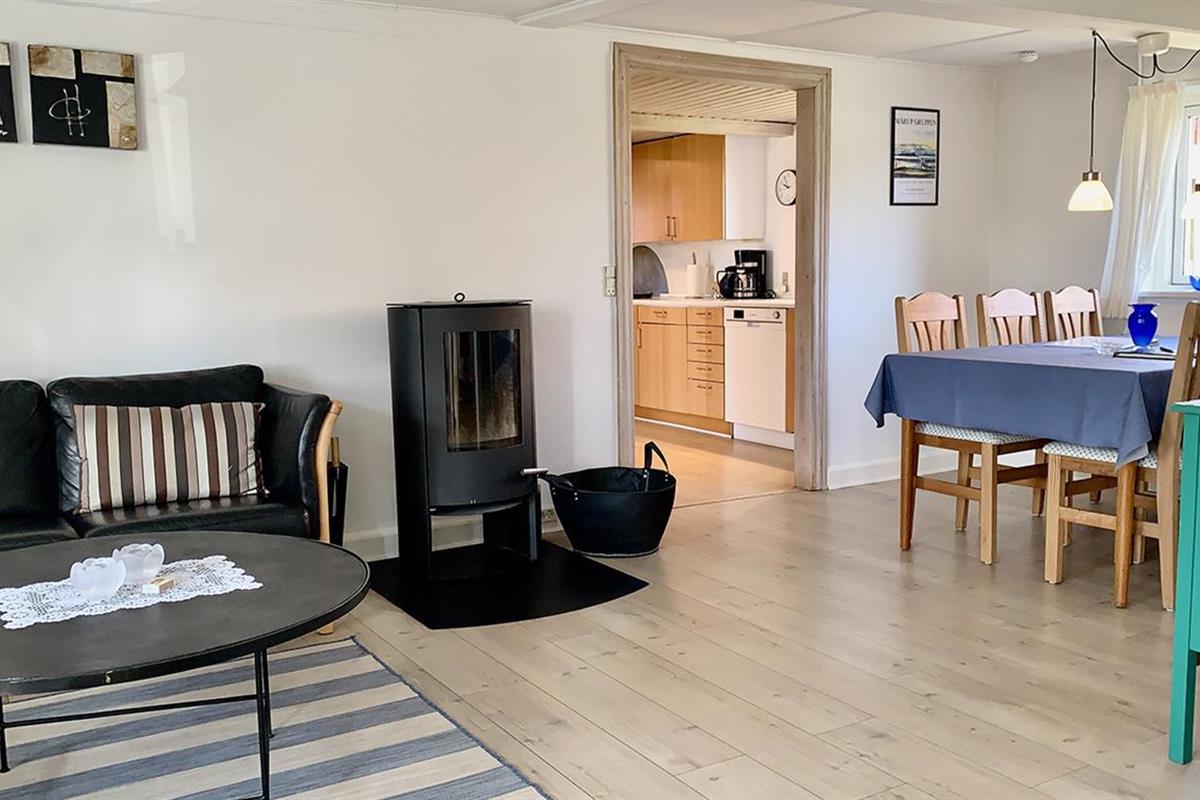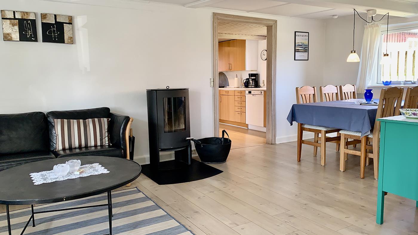 The holiday home is bright and invitingly furnished and has everything you need for a relaxing stay. The neat and functional kitchen is open to a large dining and living room, where the wood-burning stove spreads a lovely warmth and creates the perfect holiday atmosphere.