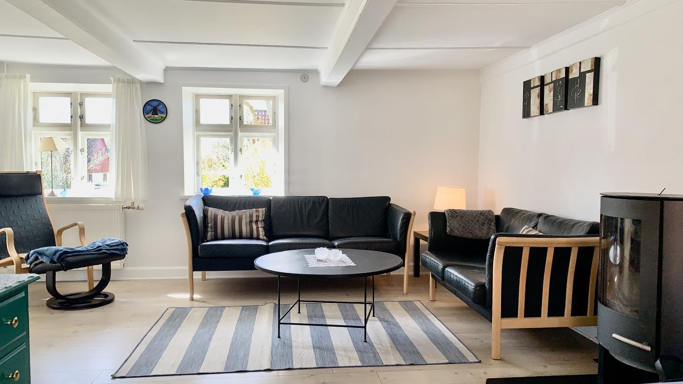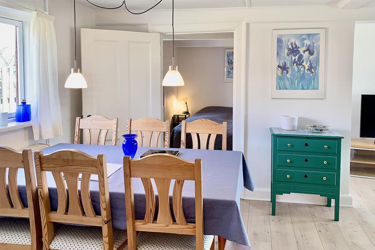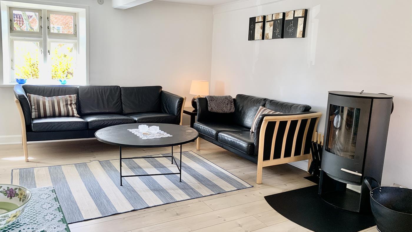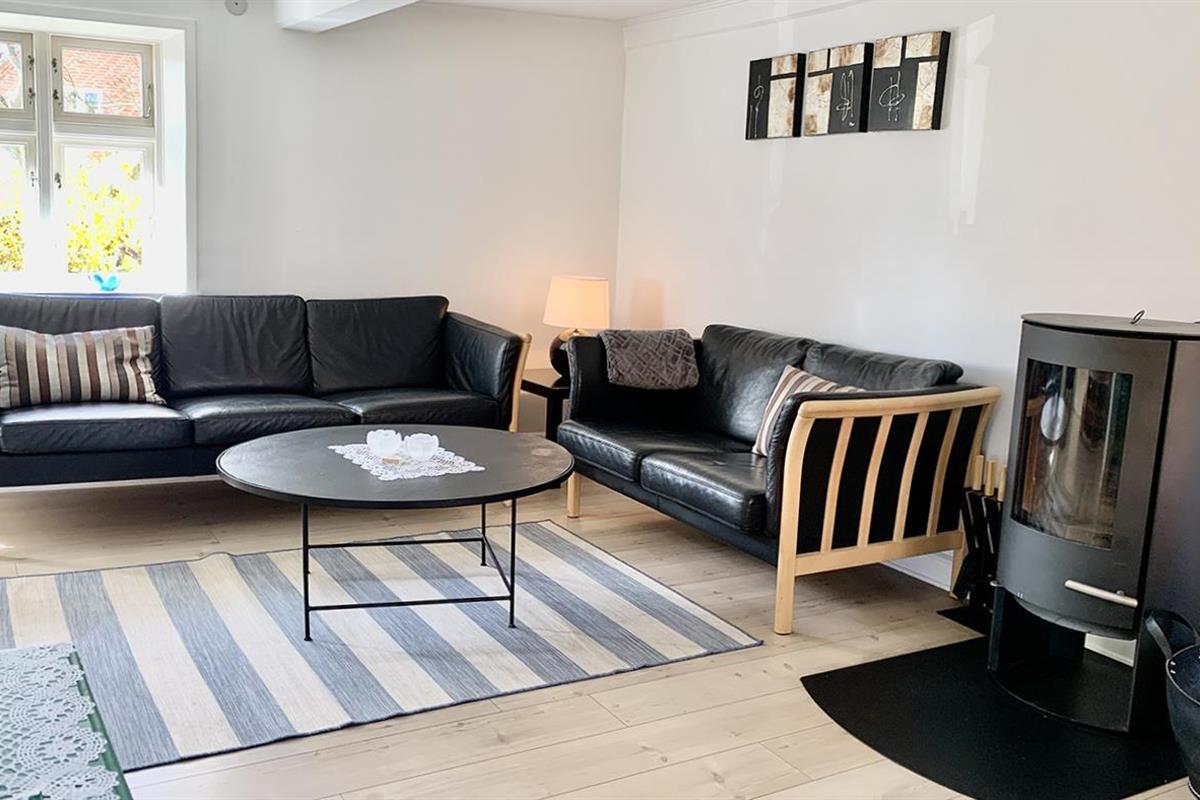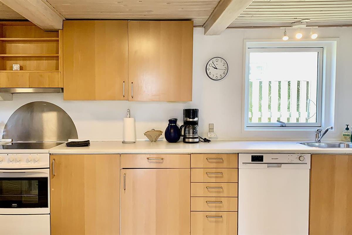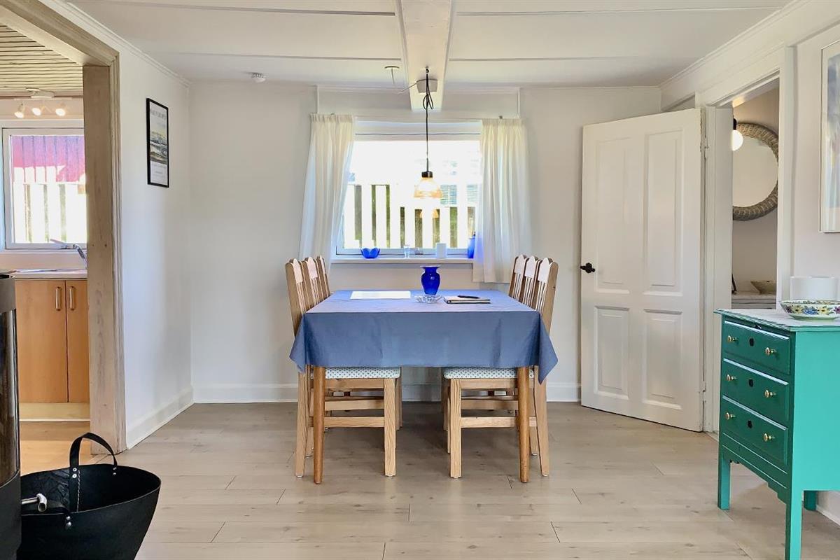 The holiday home is bright and invitingly furnished and has everything you need for a relaxing stay. The neat and functional kitchen is open to a large dining and living room, where the wood-burning stove spreads a lovely warmth and creates the perfect holiday atmosphere.