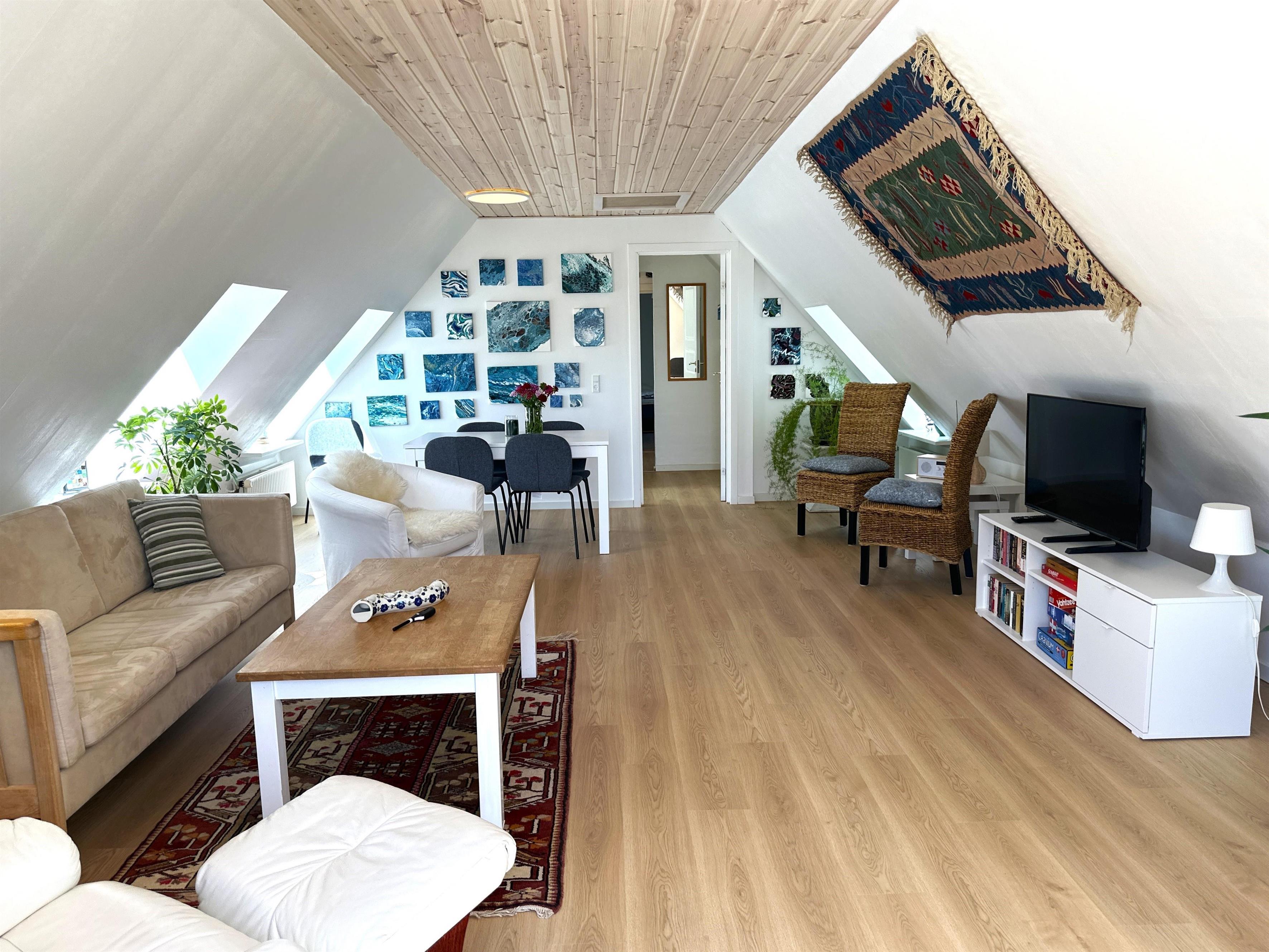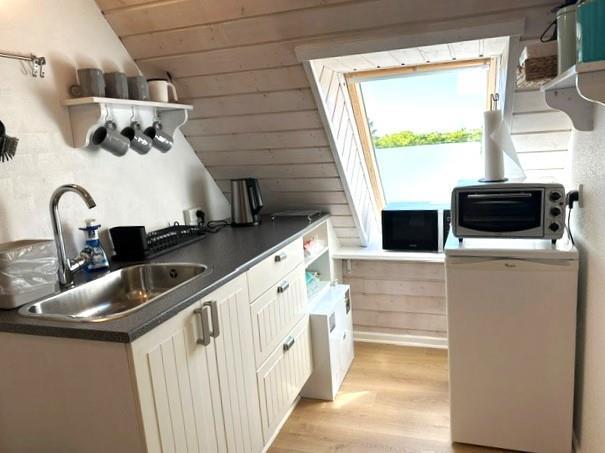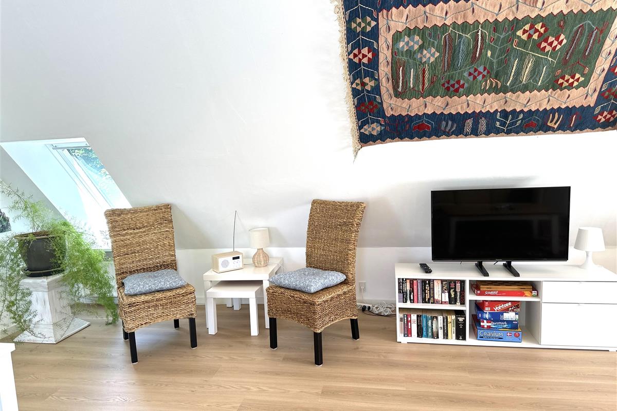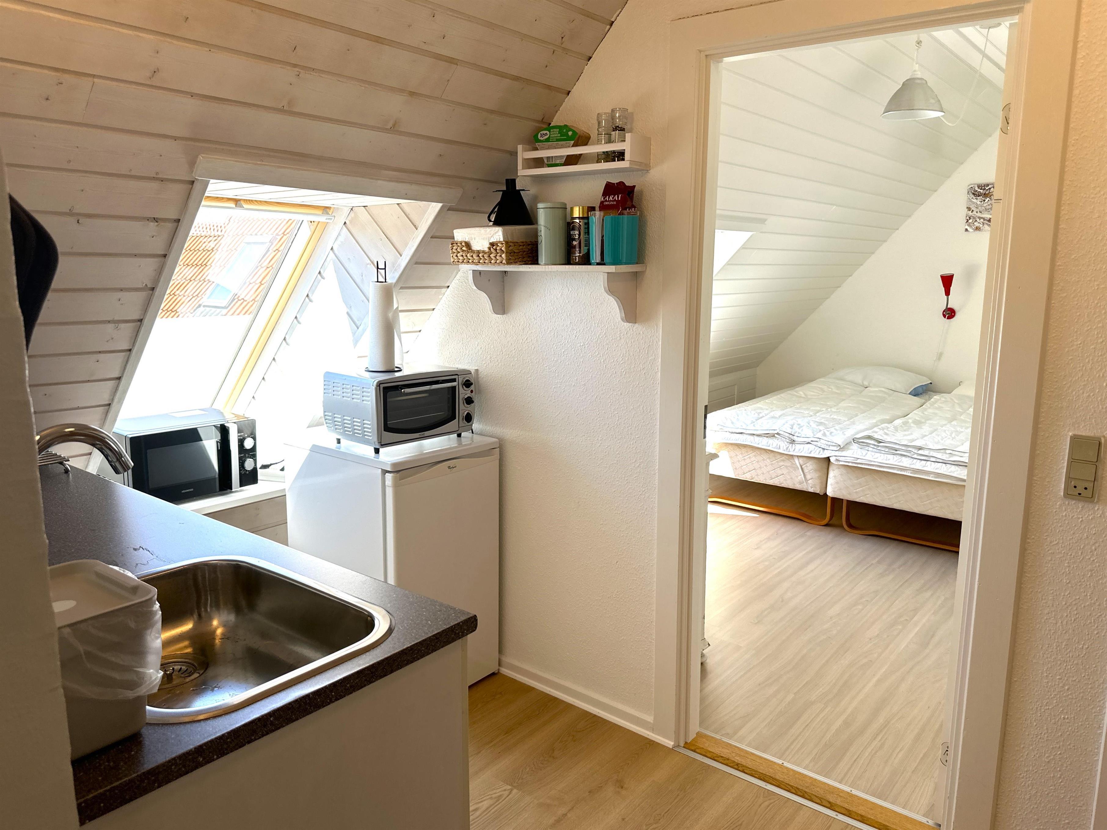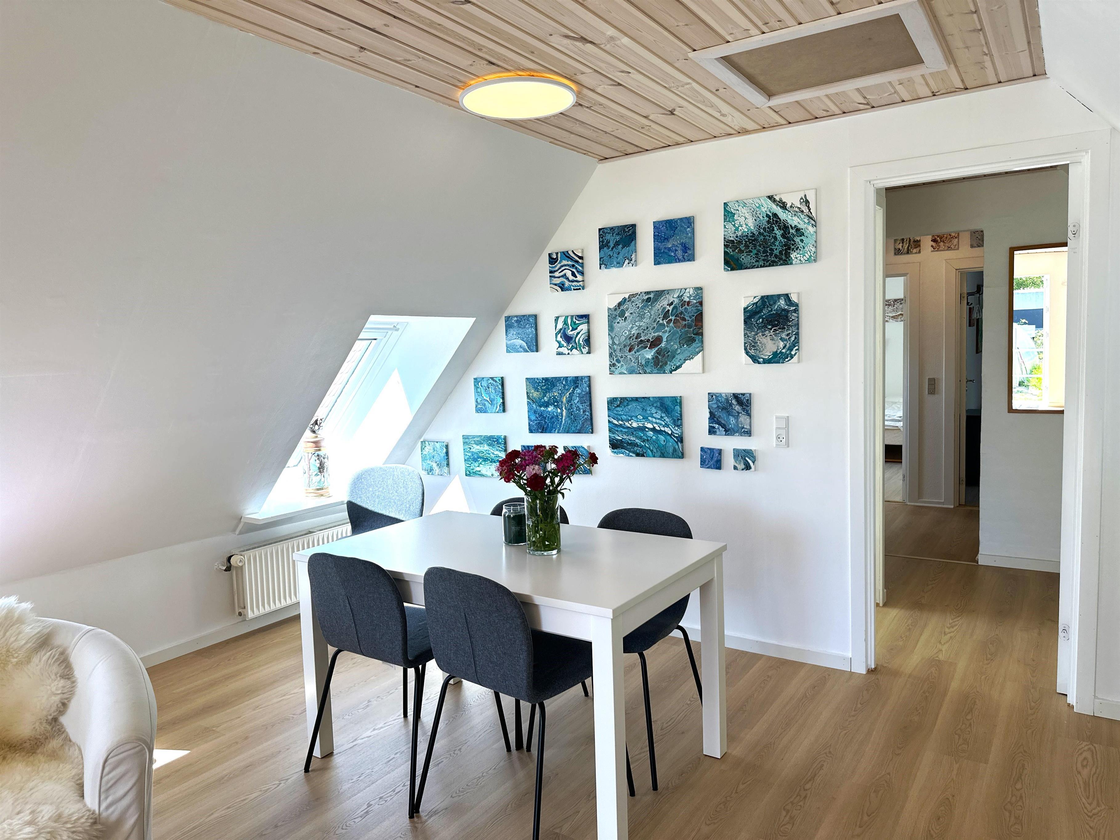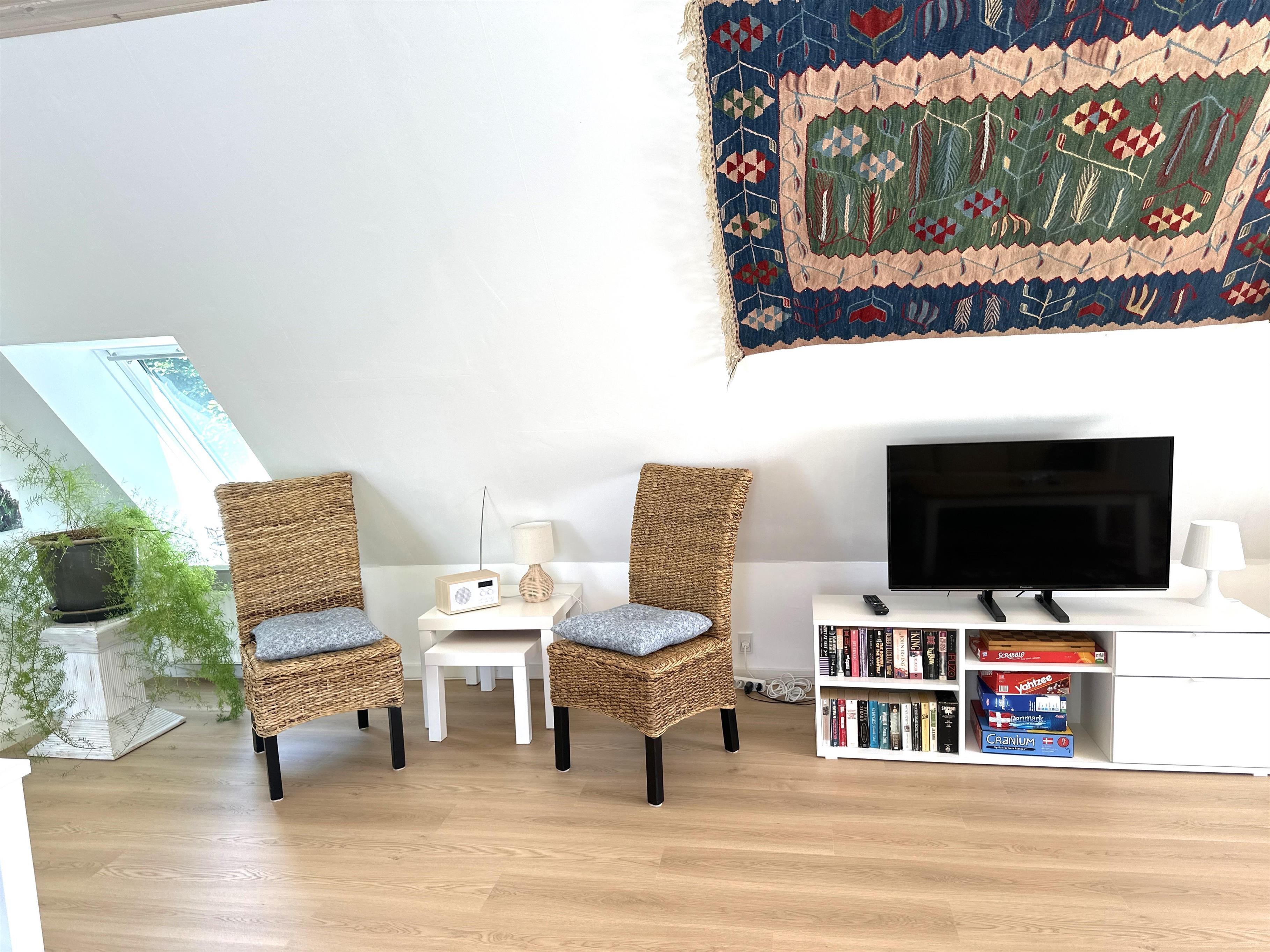 The apartment is bright, spacious and comfortably furnished with high ceilings, which gives a lovely feeling of openness and space. The living room combines a dining area and a cosy sofa corner, so you can gather the family for meals, fun games or quiet moments with a good book. The kitchenette, which is connected to the living room, makes it easy to prepare both small and large meals with local ingredients from Samsø.
