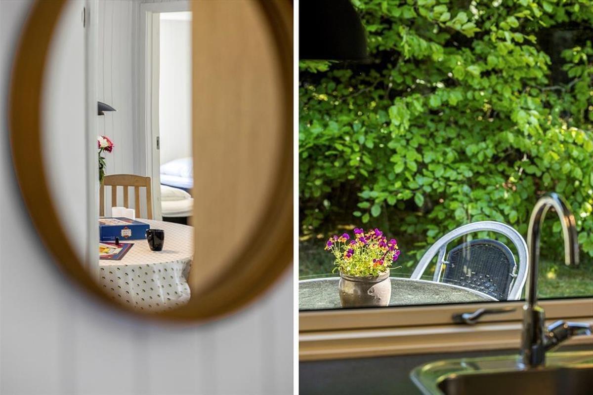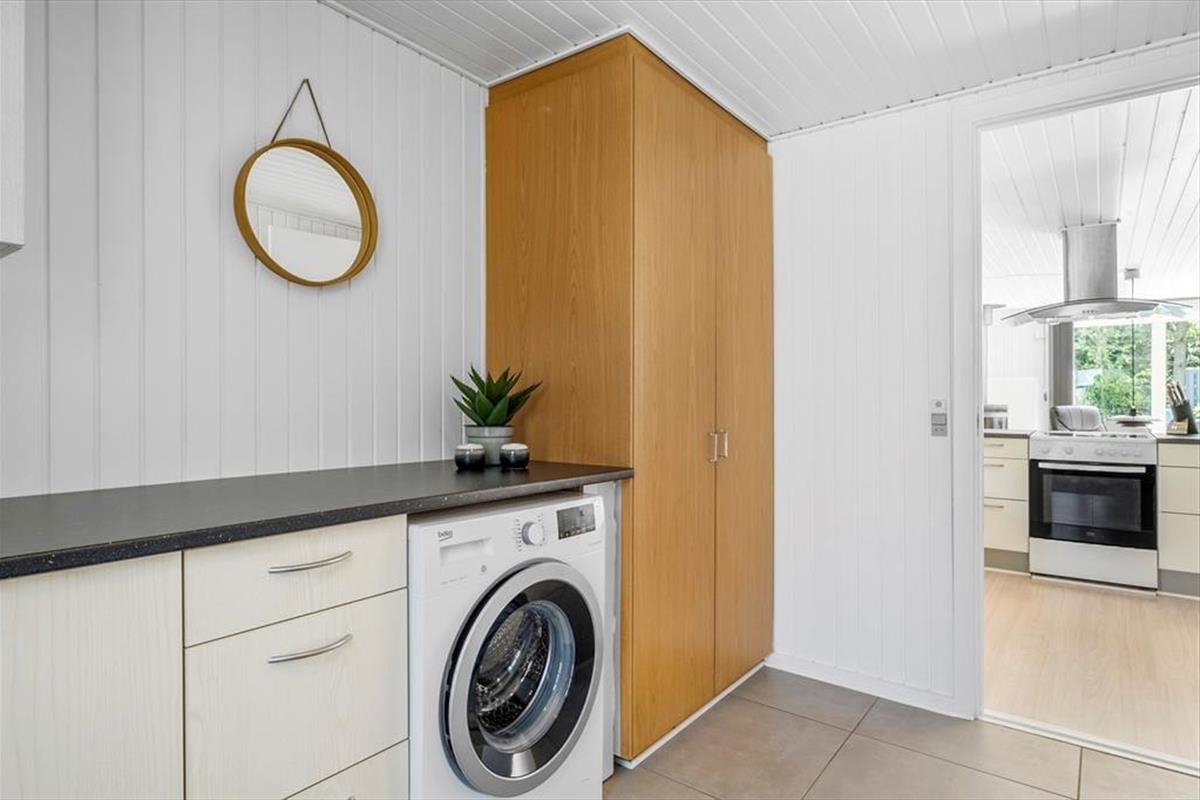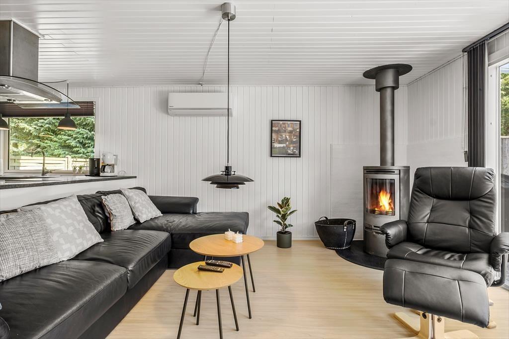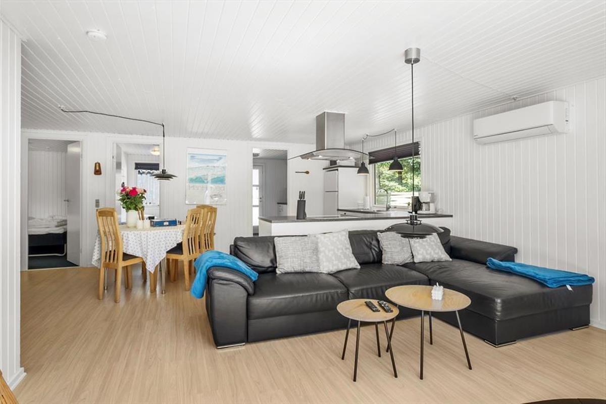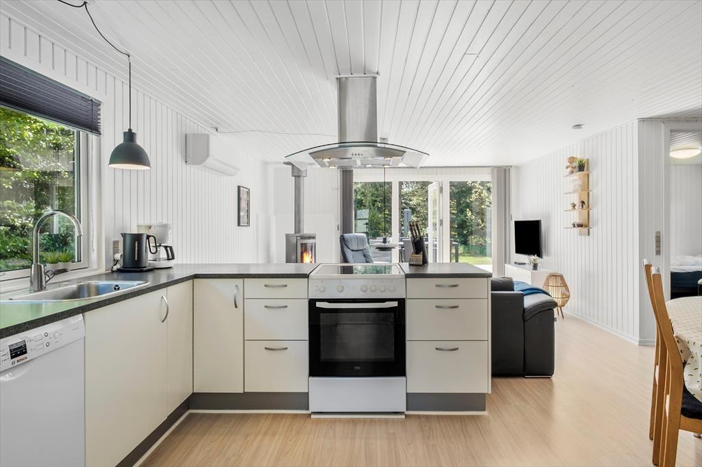 Das Haus ist ein klassisches Ferienhaus aus Holz, aus dem Jahr 1979. 40 Jahre nach dem Bau, 2019, ist es von Grund auf renoviert worden, so dass jetzt alle Räume hell, offen und einladend gestaltet sind. Die Raumaufteilung beinhaltet unter anderem drei Schlafzimmer und ein Badezimmer mit Sauna. Der eigentliche Sammlungspunkt ist aber das behagliche Wohnzimmer mit integrierter Küche. Die geräumige Küche bietet viel Platz zum Kochen, und der angrenzende Esstisch ist der perfekte Ort, um gemütlich beisammen zu sein, auch vor und nach den Mahlzeiten. Oder lehnen Sie sich entspannt zurück auf der Sofaecke, die beim Kaminofen und mit Blick auf den Flachbildfernseher platziert ist.