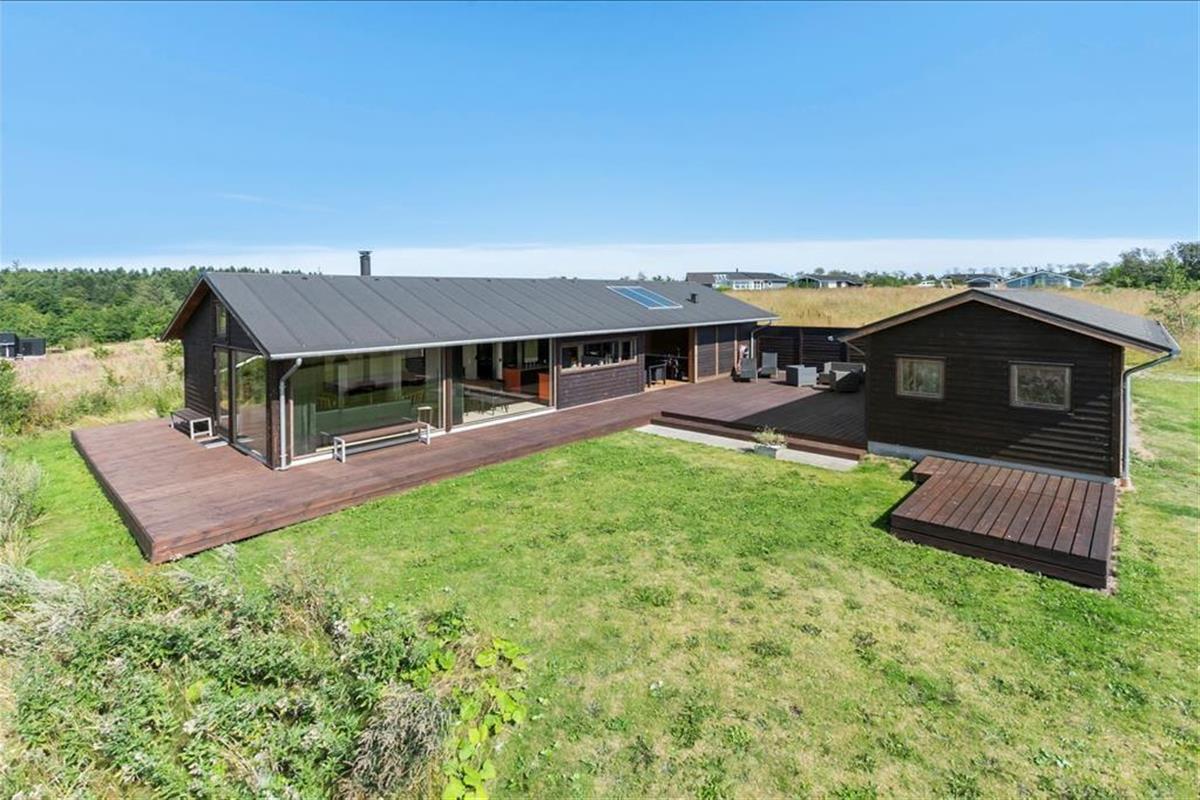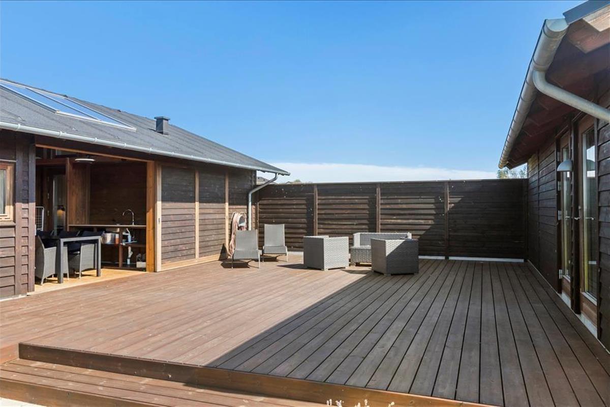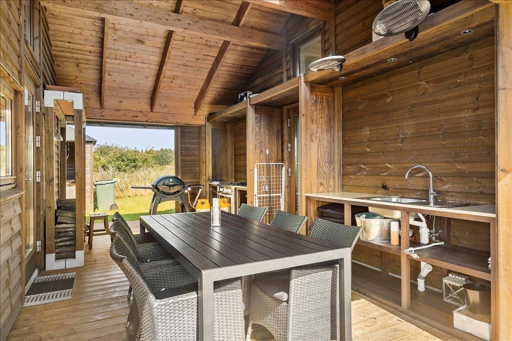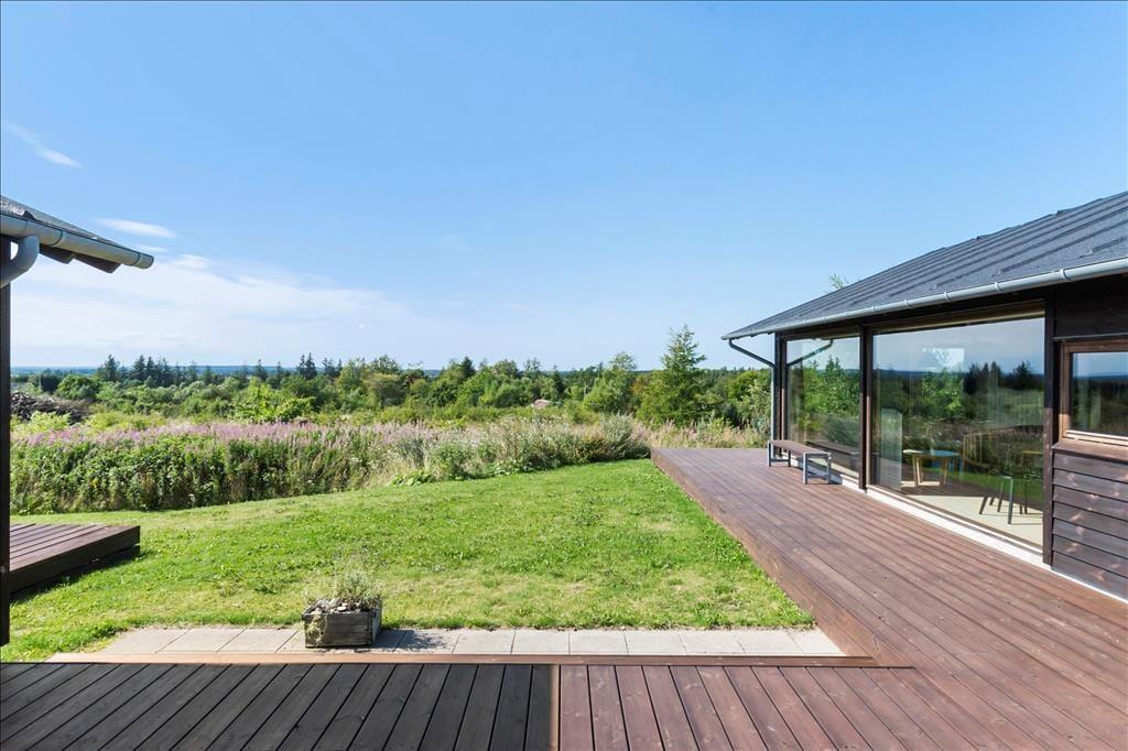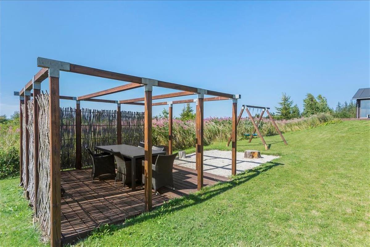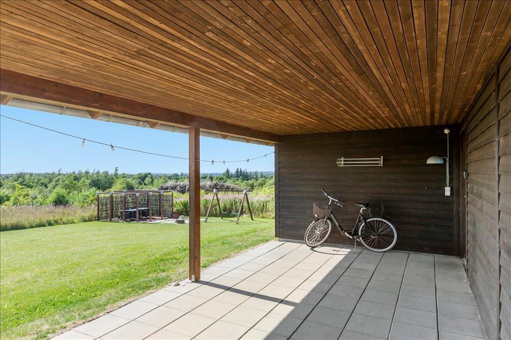 Dank der Außen Küche und des Grills haben Sie im Sommer eine perfekte Stelle zum Kochen – und so haben Sie direkten Ausgang zur Holzterrasse, wenn die Mahlzeit unter offenem Himmel eingenommen werden soll. Ein Teil des Terrassenmilieus liegt wie eine ungestörte Oase zwischen dem Haus und dem Carport, und obwohl diese abgeschirmt ist, ist die Aussicht über die offene Landschaft immer noch hervorragend. Auf dem 1279 m2 grossen Grundstück gibt es für die kleinen Gäste ein Schaukelstativ und es gibt viel Platz für Spiel und Spaß auf dem Rasen.