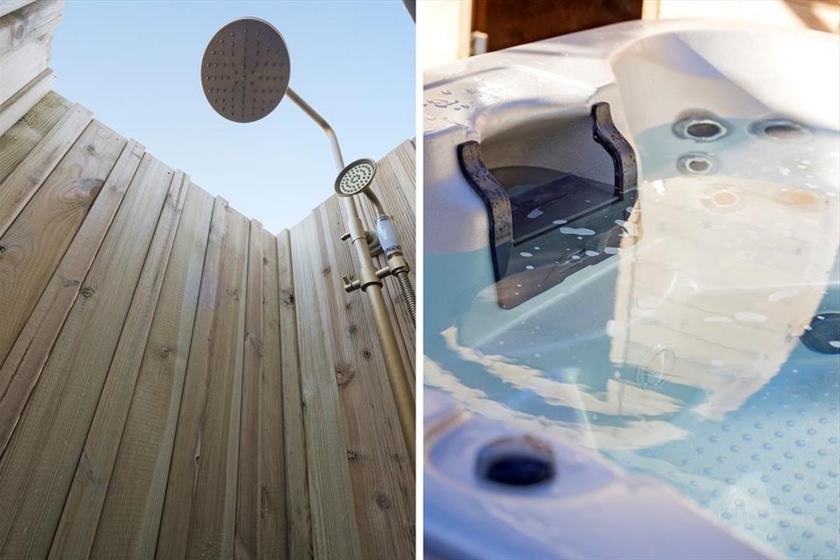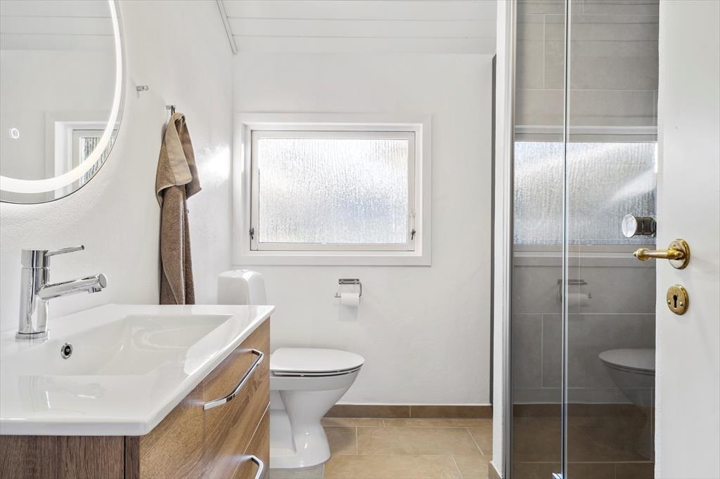 Eines der Badezimmer bietet direkten Zugang zur Holzterrasse, wo auch eine Außendusche bereitsteht – ideal für einen erfrischenden Start in den Tag. Direkt an die Terrasse grenzt das gemütliche Gästehaus, das zusätzliche Schlafmöglichkeiten bietet – perfekt für Teenager oder Freunde, die etwas mehr Privatsphäre wünschen.