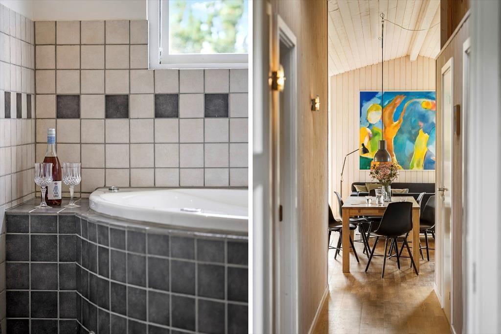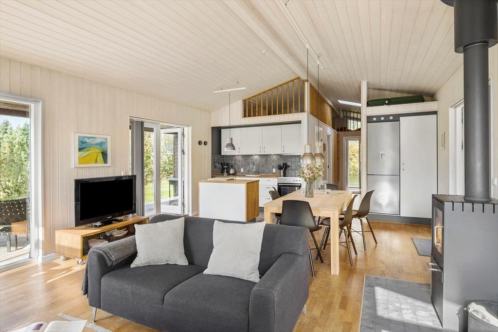 Im Inneren des Ferienhauses empfängt dich eine helle und freundliche Atmosphäre. Das Haus ist mit einem geräumigen Wohnzimmer ausgestattet, in dem die großen Fenster viel Licht hereinlassen und eine wunderbare Verbindung zwischen Innen und Außen schaffen. Hier kannst du dich mit deinen Liebsten um den Kaminofen versammeln, der an kühlen Tagen Wärme und Gemütlichkeit verbreitet, während die offene Küche den sozialen Austausch erleichtert, auch während des Kochens. Das große Badezimmer verfügt über ein schönes Whirlpool und eine Sauna, die nach einem langen Tag voller Outdoor-Erlebnisse für Entspannung sorgen. Mit drei Schlafzimmern bietet das Haus genügend Platz für die ganze Familie, und es gibt auch ein zusätzliches Gästetoilette für noch mehr Komfort.