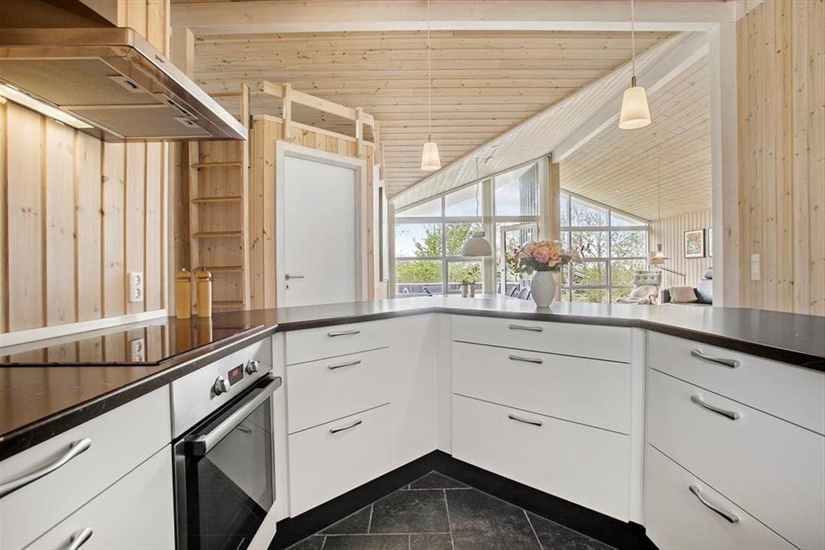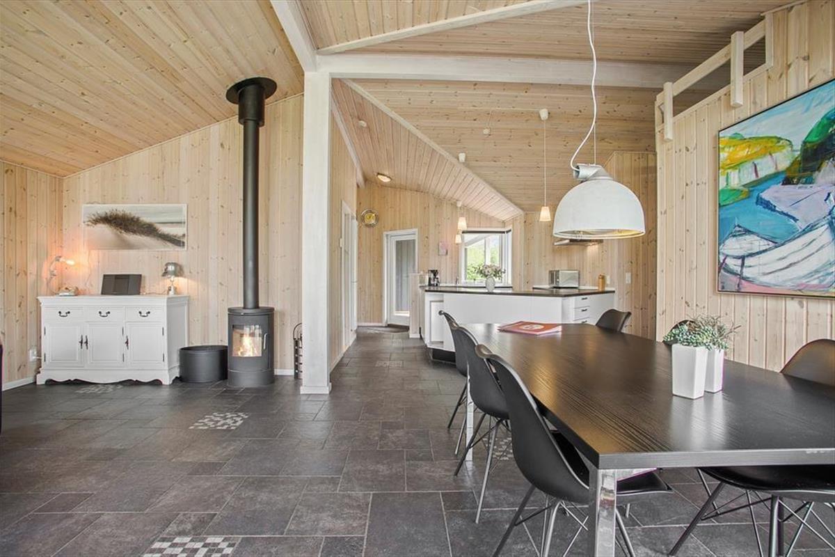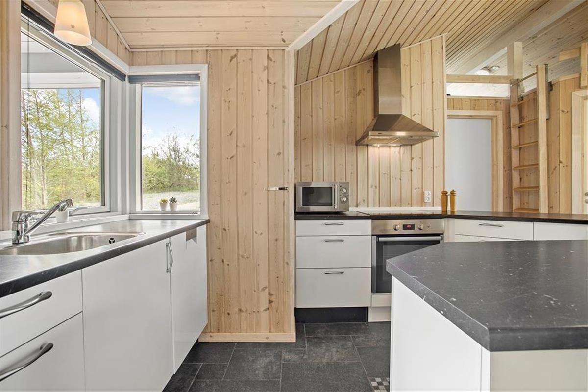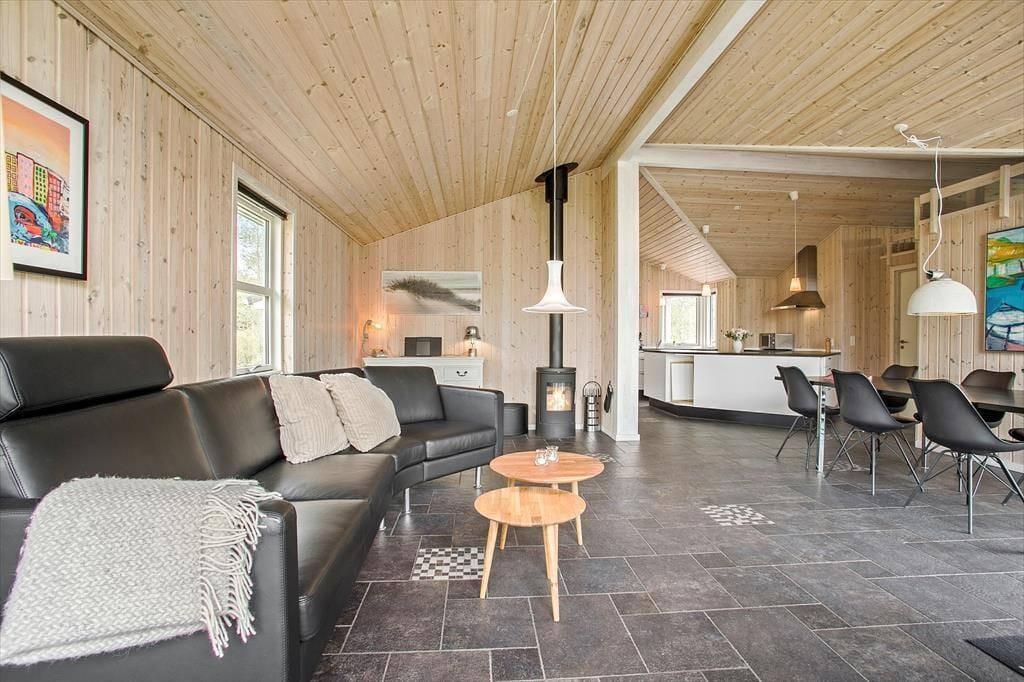 Dieses Ferienhaus ist modern und gediegen mit solidem Boden und großen Fenstern ausgestattet, die viel Licht in die Räume lassen. Die gesamte Einrichtung und die Möbel sind hochwertig und SAT-TV, kostenloses WLAN, Kamin und Whirlpool verleihen diesem Objekt Gemütlichkeit und Luxus. Gleichzeitig sorgt Erdwärme und Solarenergie für umweltfreundliche, kostensparende Verbrauchsskalen. Die offene Küche mit wunderbarer Arbeitsfläche bietet Ihnen einen guten Blick über den Rest des großen Wohnraums mit Esstisch und Sofagruppe vor dem TV, damit Sie immer die Möglichkeit haben, zusammen zu sein, auch wenn jeder etwas anderes macht. Desweiteren gibt es drei Schlafräume mit zwei Doppelbetten und zwei Einzelbetten und ein großes Badezimmer mit Glasduschkabine und einem Zwei-Personen-Whirlpool. Ein wirklich tolles Ferienaus mit gemütlichen wie auch funktionalen Bedingungen für den Urlaub in Familie oder zu zweit.