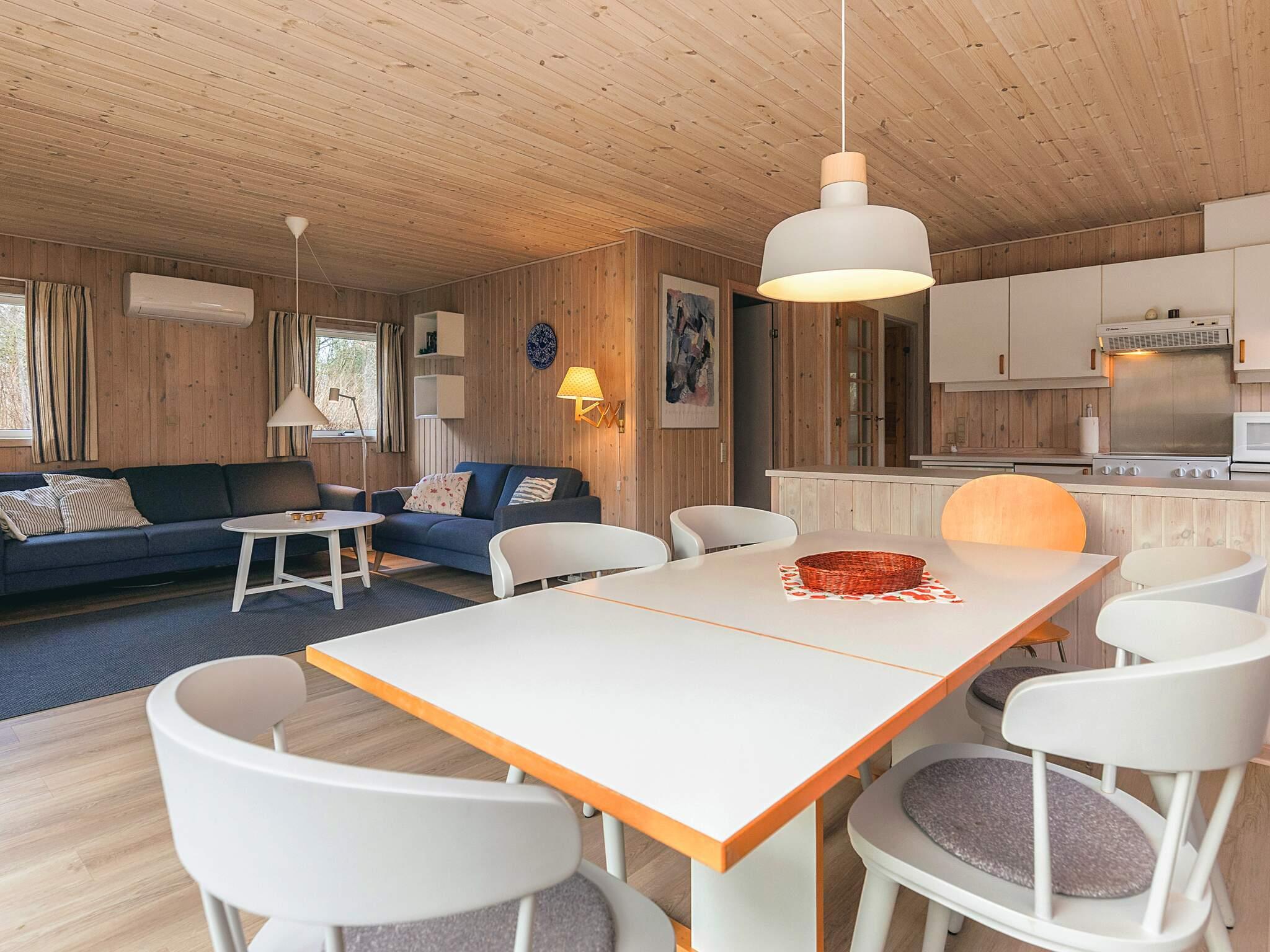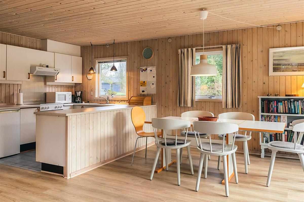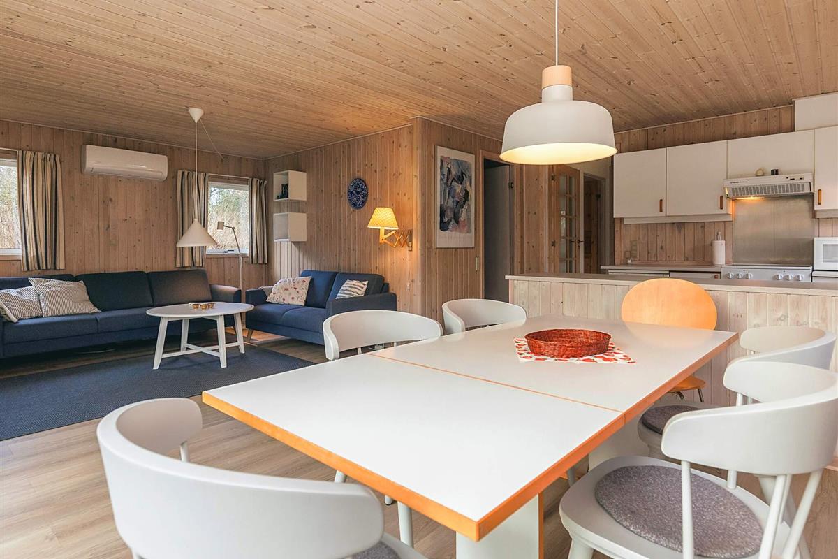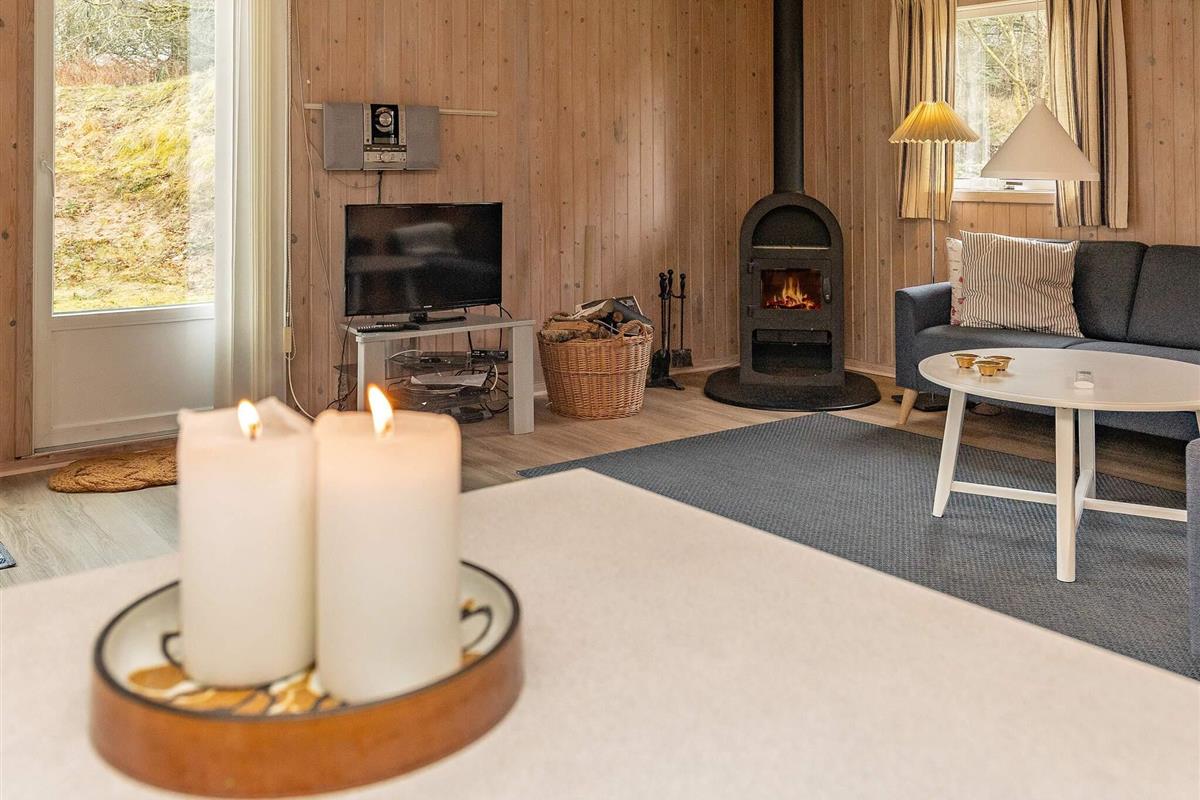 Das mit persönlicher Note eingerichtete Ferienhaus bietet einen familienfreundlichen Rahmen für einen erholsamen Familienurlaub. Für gemütliche Abendstunden steht im Wohnbereich ein Holzofen bereit, zudem TV mit einigen deutschen Sendern zur Auswahl. Die Küche ist offen in den Wohn-/Essbereich integriert.