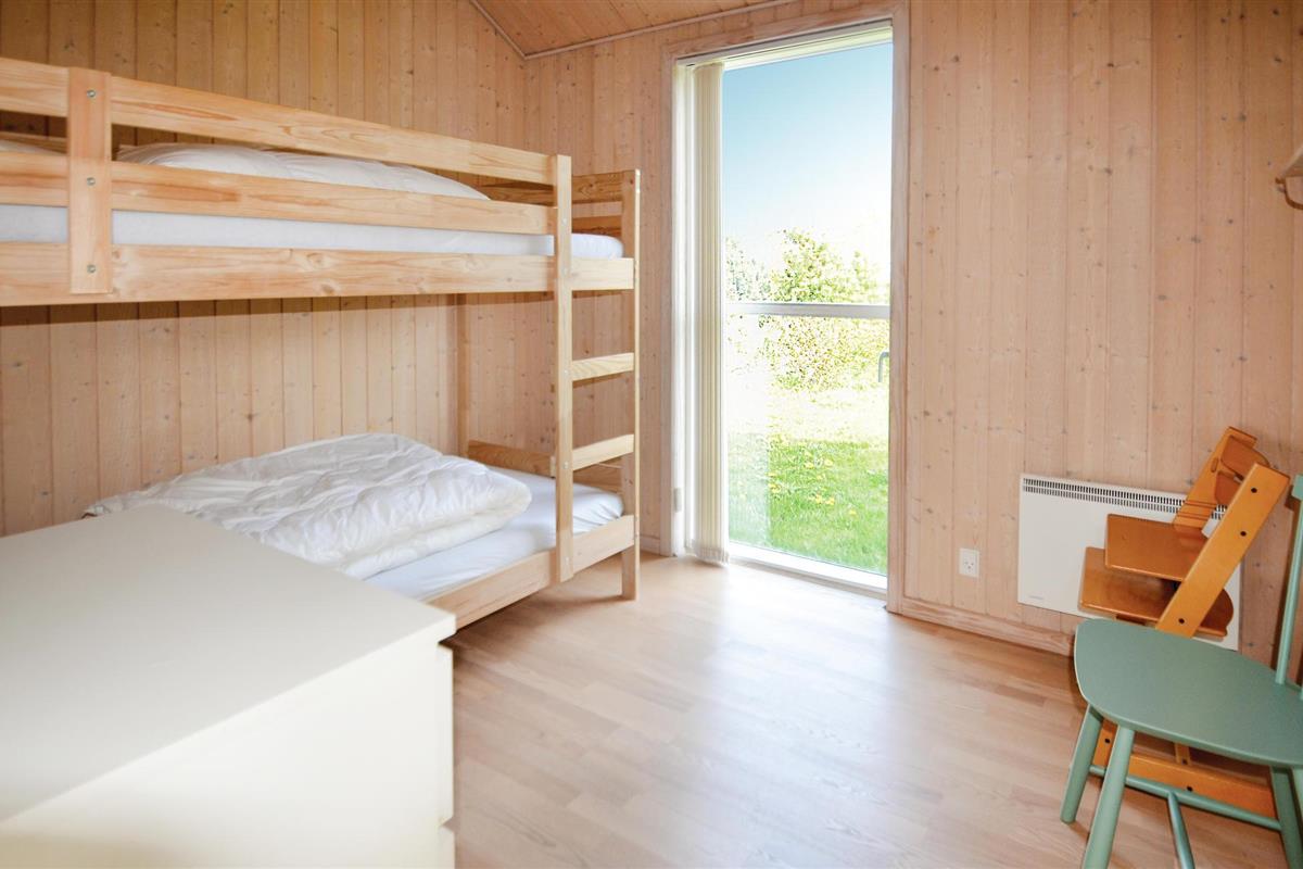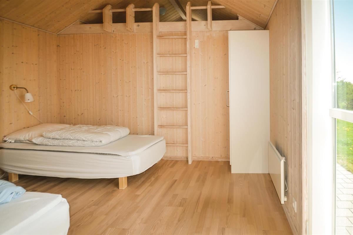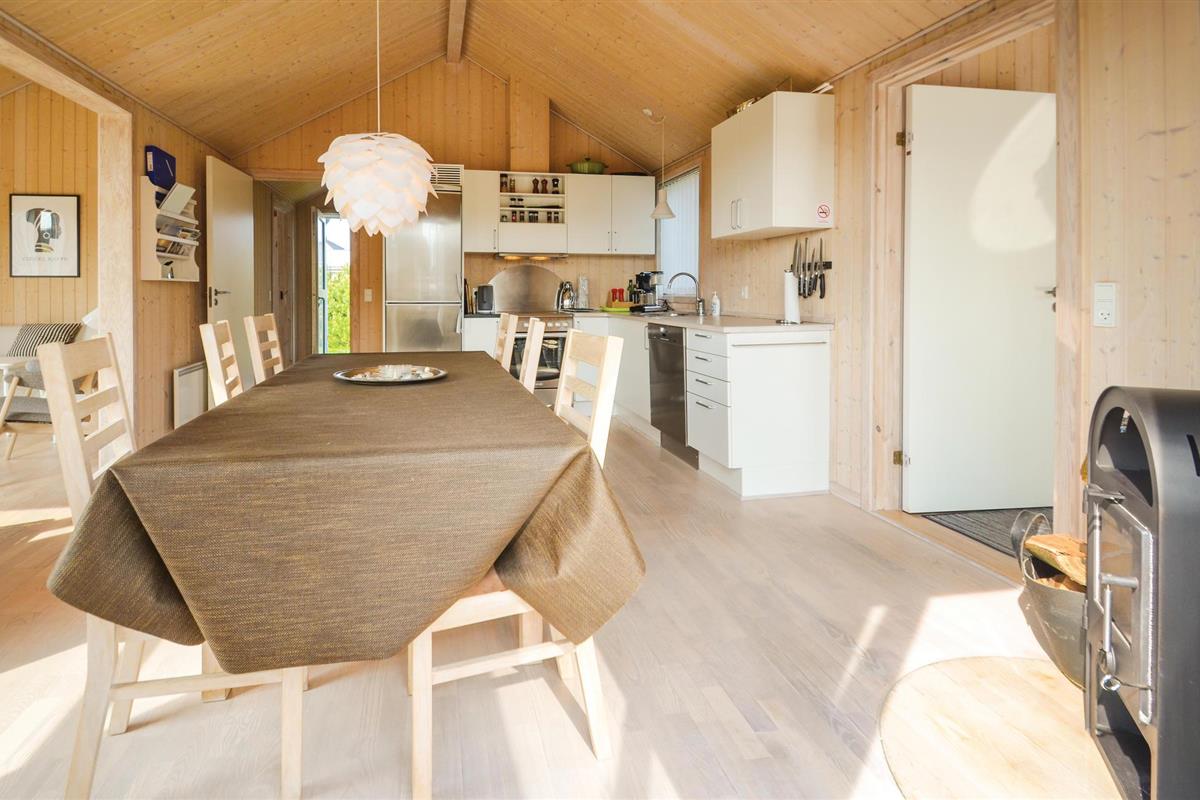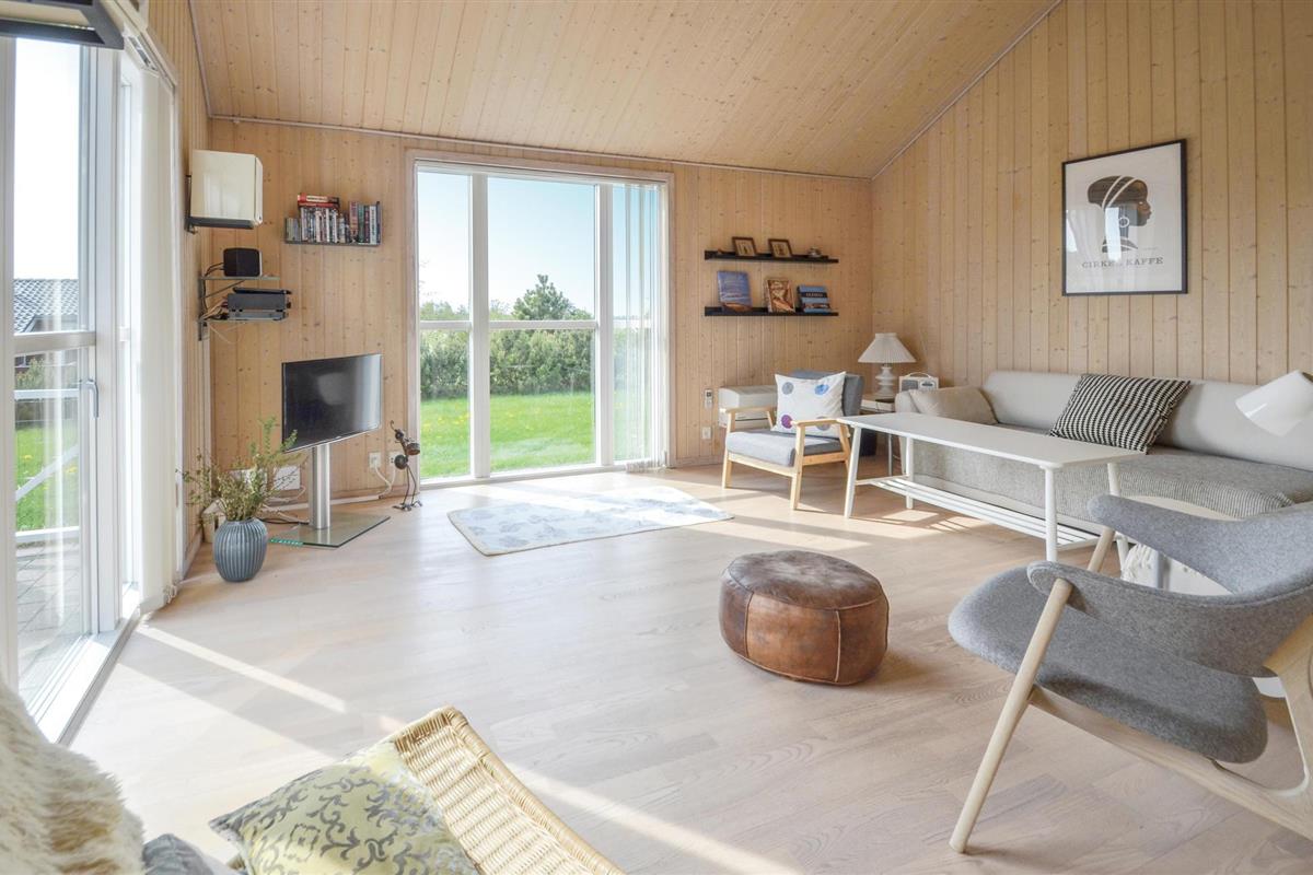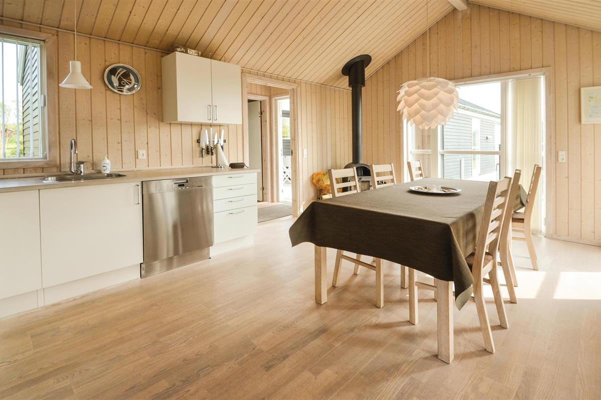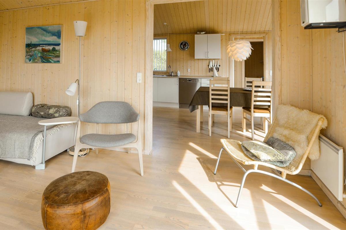 Vakantiehuis op groot, grasrijk natuurperceel. Zodra u aankomt, merkt u de goede sfeer die hier heerst. Het interieur bestaat uit goed meubilair, lichte vloeren en muren en de kamerindeling creëren een goede setting voor de vakantie. Er zijn twee slaapkamers in het huis, één in het bijgebouw naast het overdekte terras. Er is ook een badkamer in het bijgebouw. Het woongedeelte staat open voor de keuken, maar is daarvan afgeschermd. De woonkamer komt direct uit op het terras. Prachtige omgeving door het kustbos Kollerup en Slettestrand. Hier kunt u heerlijk wandelen en mountainbiken.