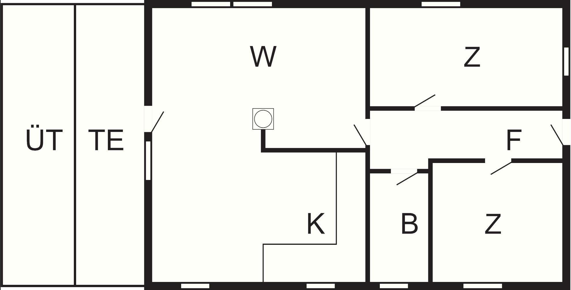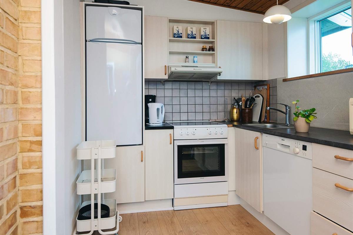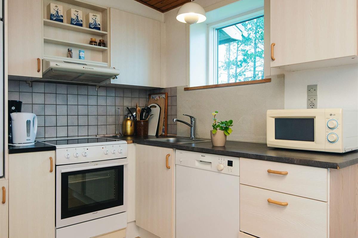 Im Ferienhaus erwarten Sie Flur, Abstellraum, zwei Schlafzimmer, ein Bad und ein kombinierter Küchen-/Wohnbereich. Ein Holzofen sorgt an kühleren Tagen für wohlige Wärme, während Sie Brettspiele spielen oder mal wieder ein gutes Buch lesen können.