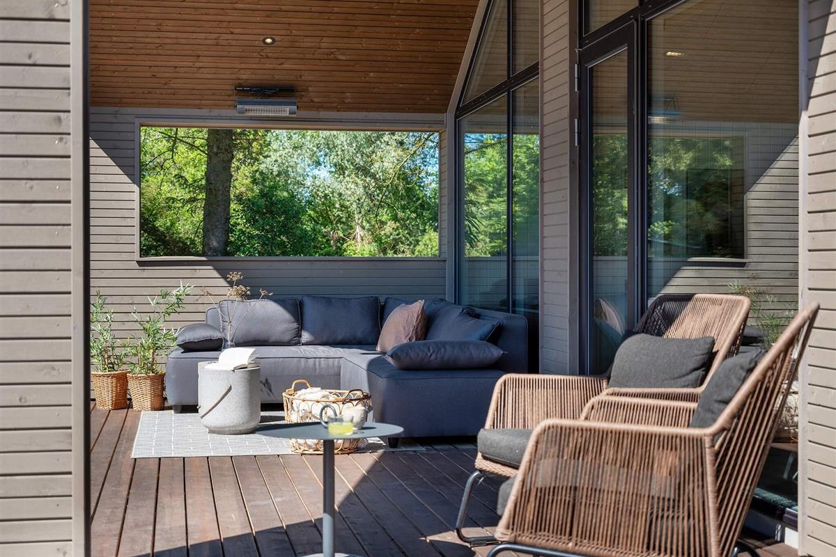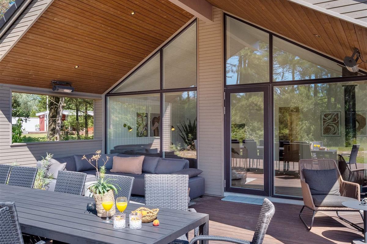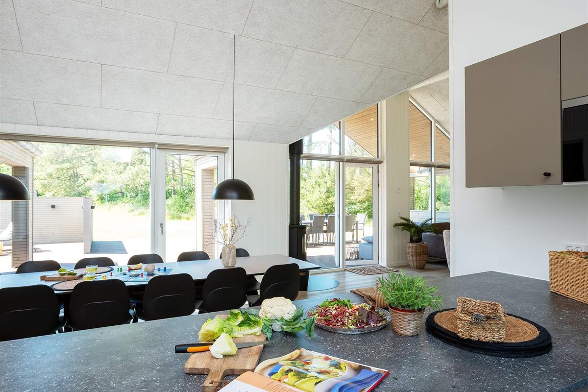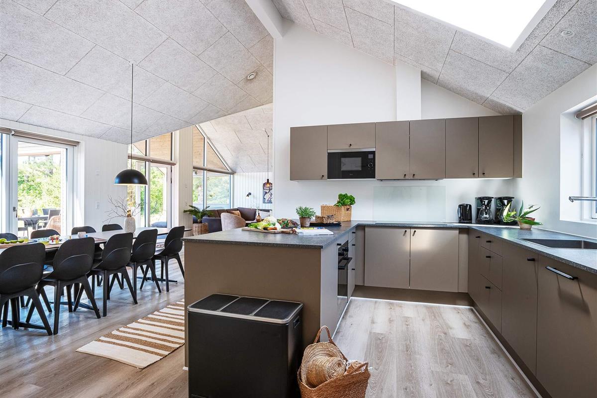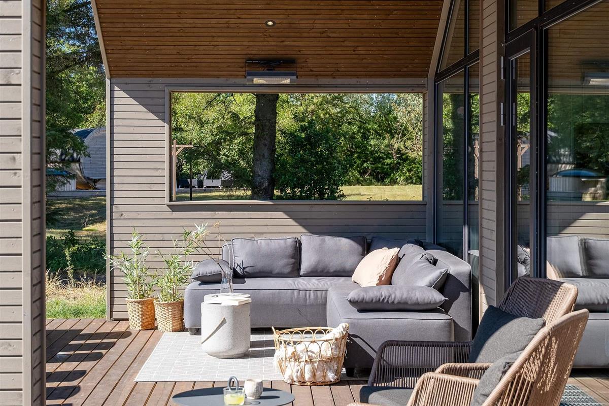 Die Küche ist komplett ausgestattet, sodass Sie köstliche Mahlzeiten für die ganze Gruppe zubereiten können. Für ein besonderes Erlebnis können Sie ein kühles Glas Wein aus dem Weinkühler genießen. Auf der schönen Holzterrasse können Sie unter freiem Himmel grillen und dabei den schönen, überdachten Loungebereich mit einem fantastischen Ecksofa genießen. Ob Sie lieber drinnen oder draußen essen, an den langen Esstischen ist ausreichend Platz für alle.