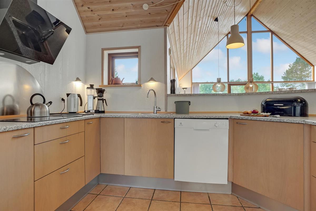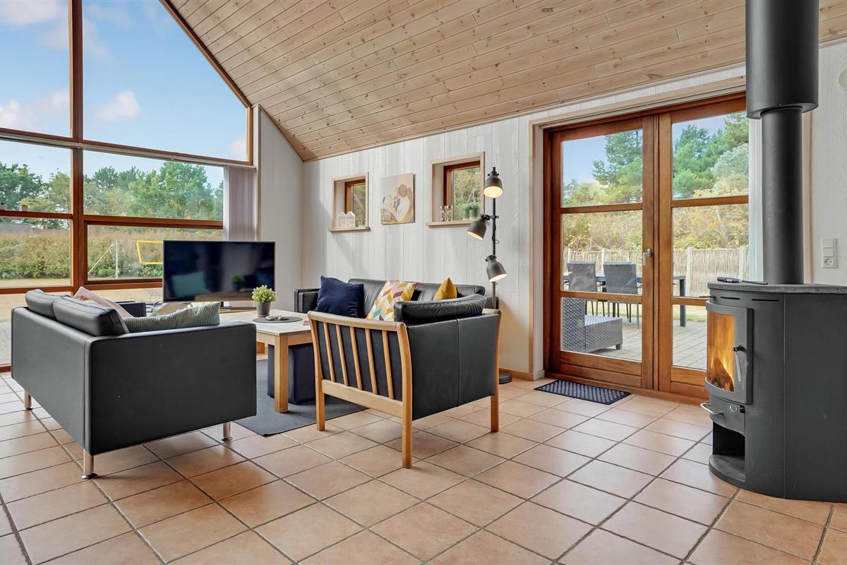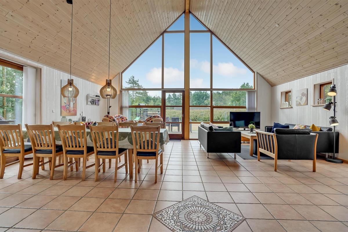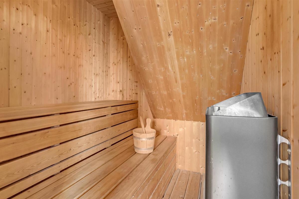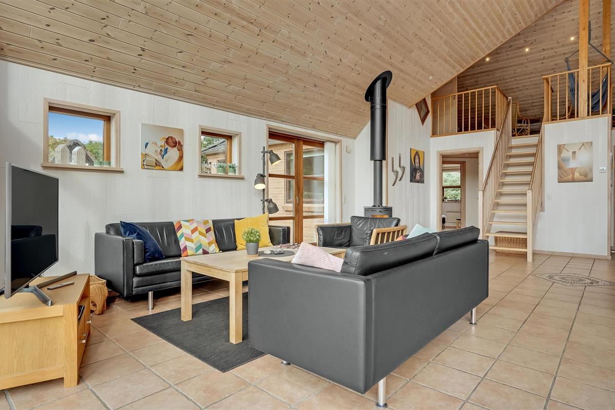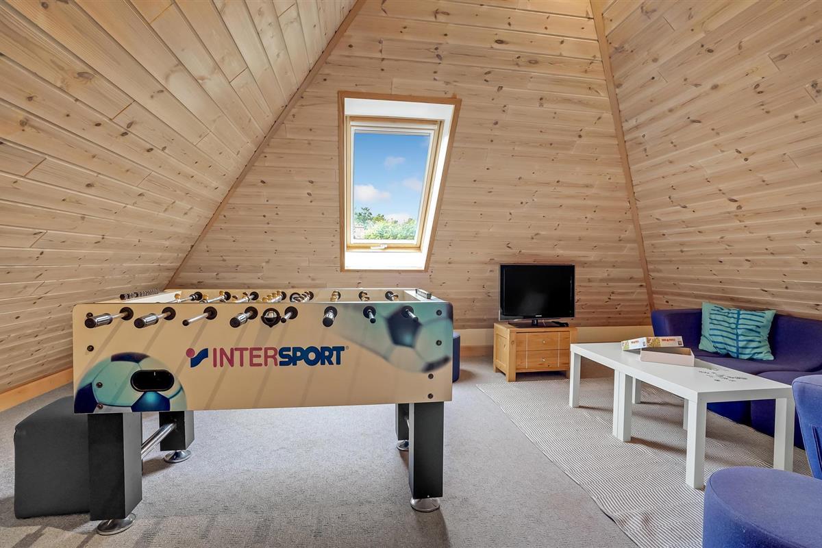Dit vakantiehuis maakt indruk met zijn interessante architectuur en praktische details. Het hoge plafond maakt het groot en luchtig. Op de begane grond hebben de 2 aparte slaapgedeeltes hun eigen badkamer, ideaal voor 2 gezinnen of meerdere generaties. Vanaf de repos op de 1e verdieping, bereikbaar via de trap, zijn er kamers aan beide kanten, de ene is een slaapkamer, de andere een activiteitenruimte met tafelvoetbal. Vanaf de vide is er uitzicht op de tuin. Vanaf de galerij met slaapruimtes en een ruimte die gebruikt wordt als speelkamer (darts), heb je een prachtig uitzicht op de woonkamer en het grote panoramische raam op het zuiden.