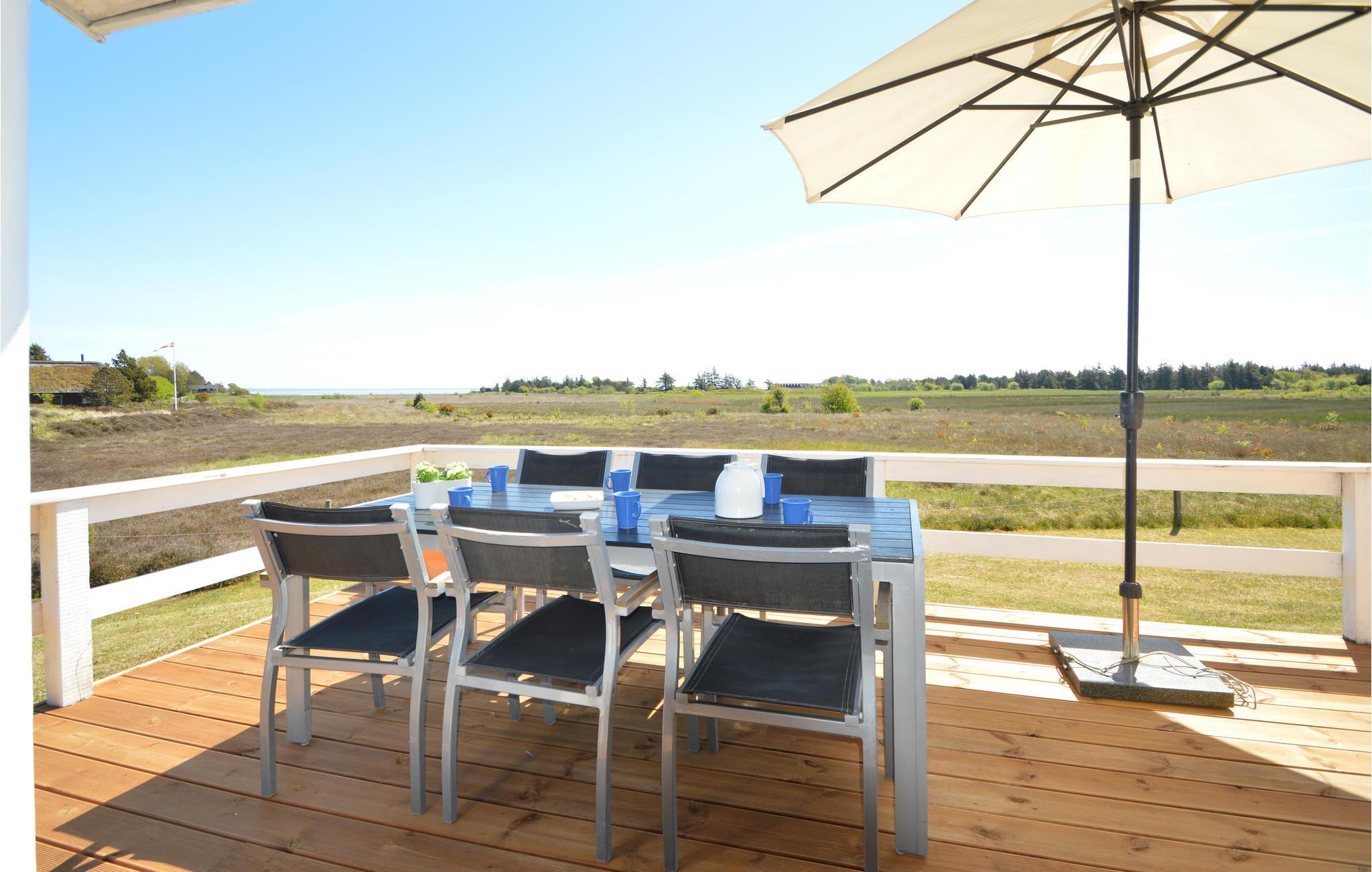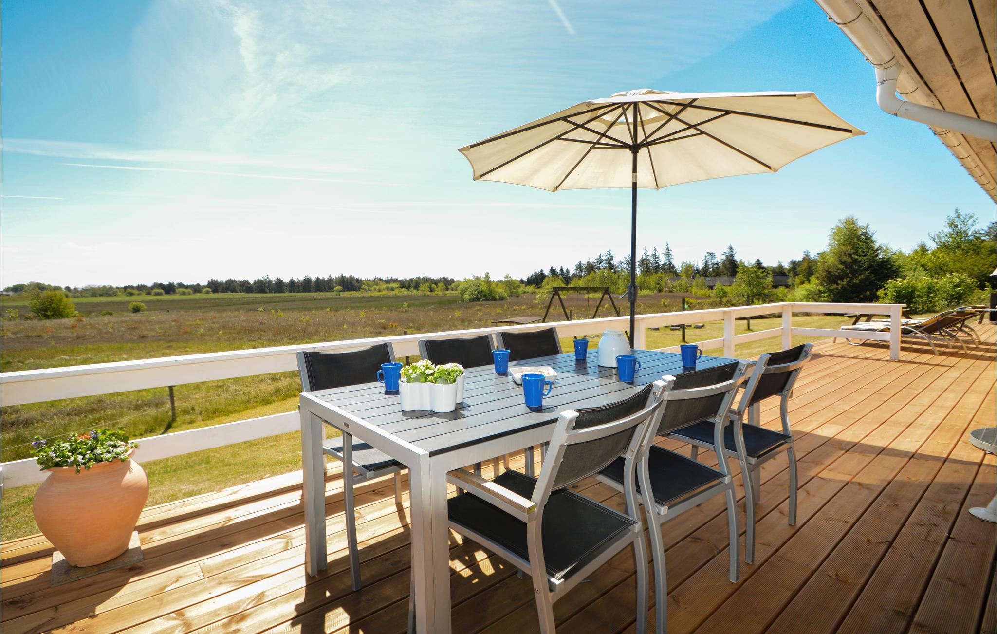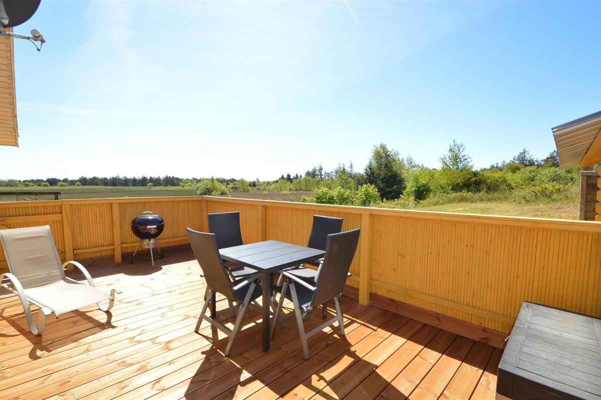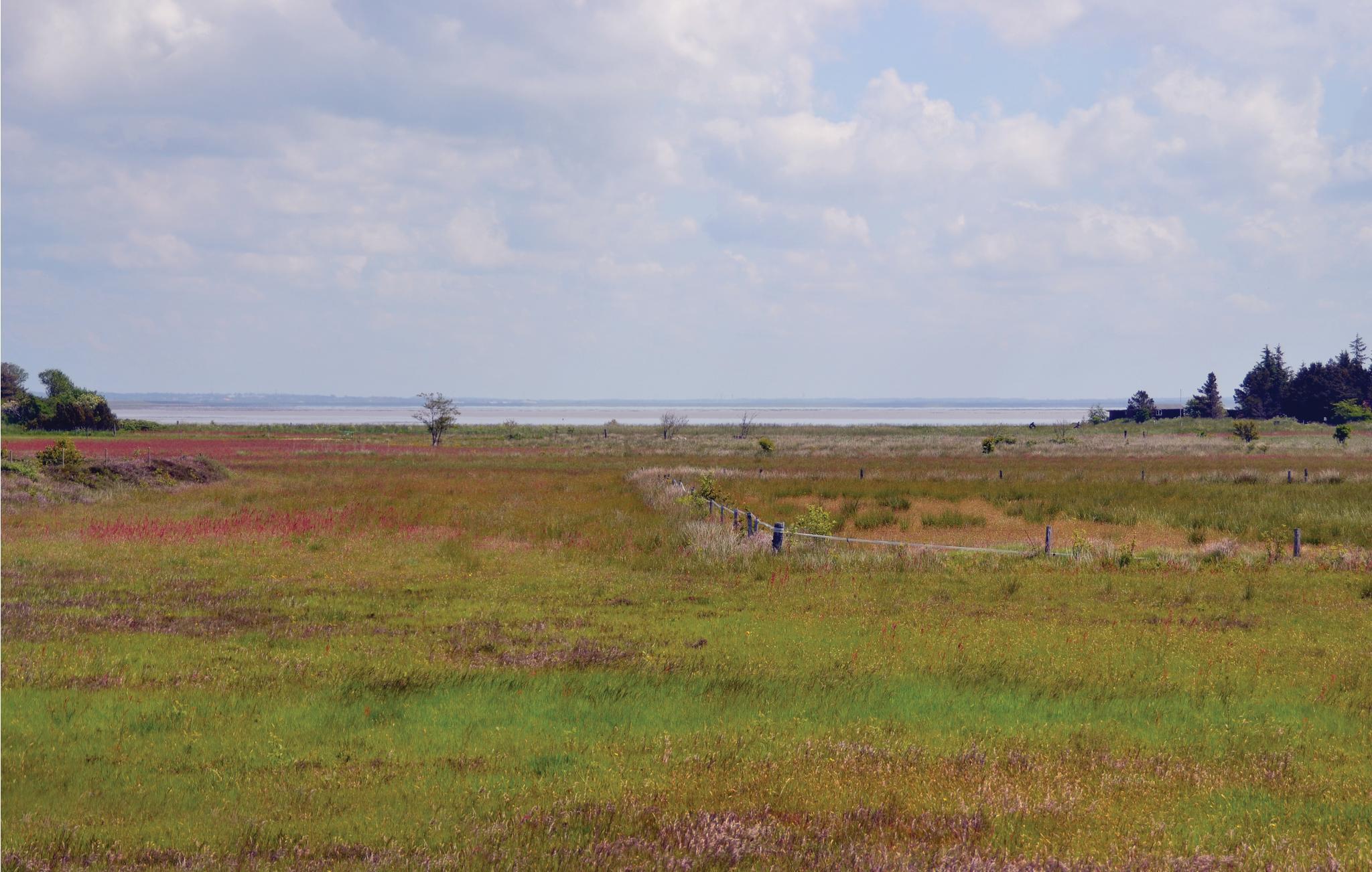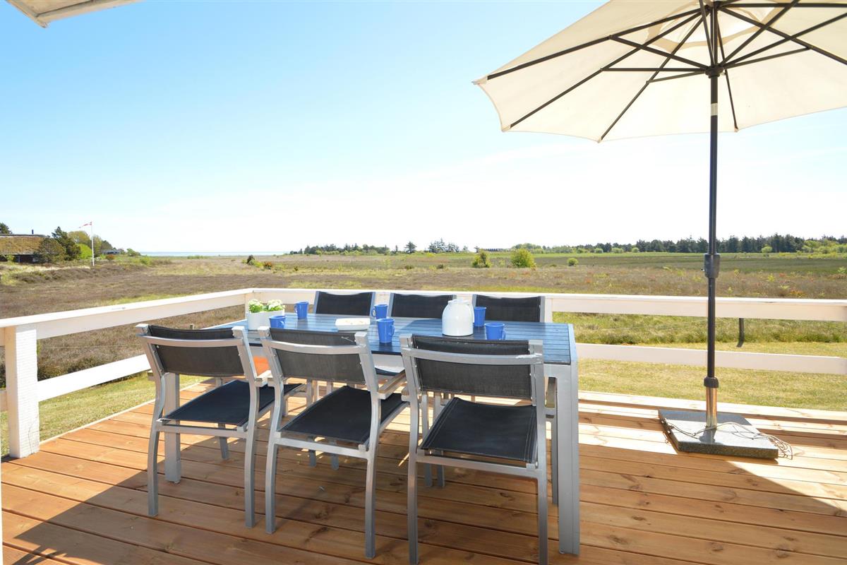 Dit grote houten vakantiehuis ligt hoog op een natuurgebied in het centrum van Rømø met een prachtig uitzicht over het open landschap van de Waddenzee.