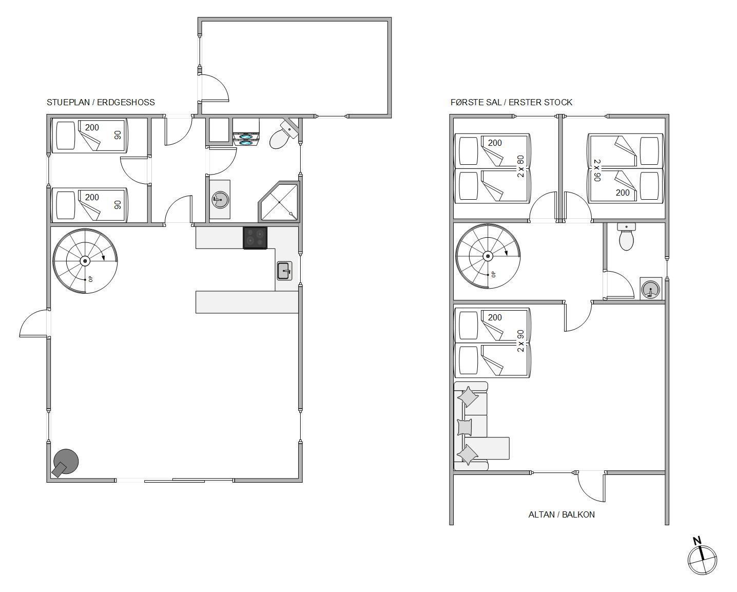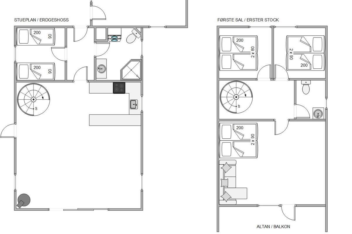 The summer house features 4 bedrooms, all with double beds. The sofa bed provides additional sleeping space for 2 people. The holiday home has 2 bathrooms, both with underfloor heating. The ground floor bathroom includes a shower.