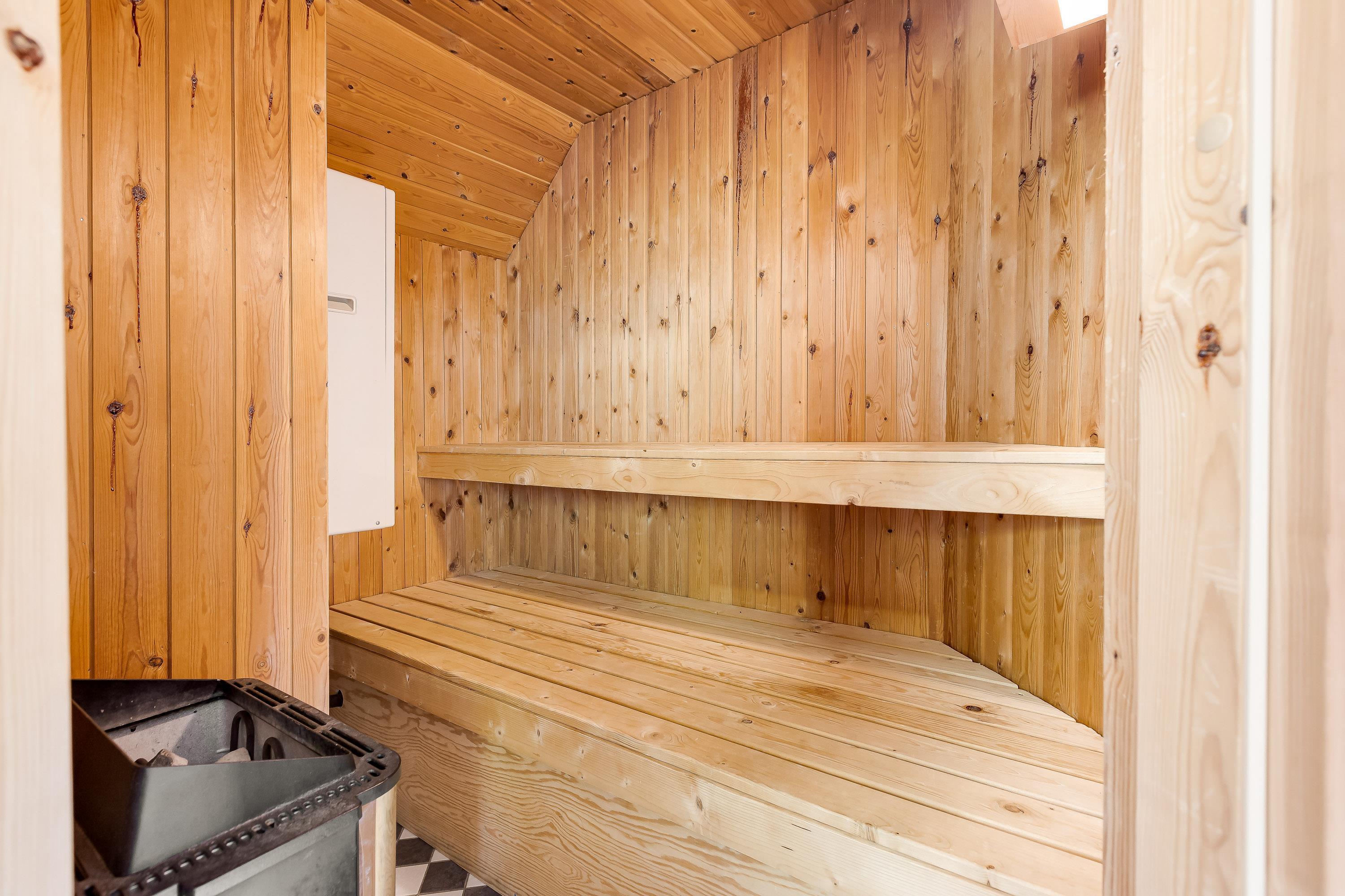 Two tiled bathrooms with underfloor heating. One bathroom features a wellness shower cabin with light and aromatherapy. The large bathroom includes a shower enclosure, a two-person whirlpool with adjustable air and water massage and light therapy, plus access to the sauna. A washing machine and tumble dryer are also provided.