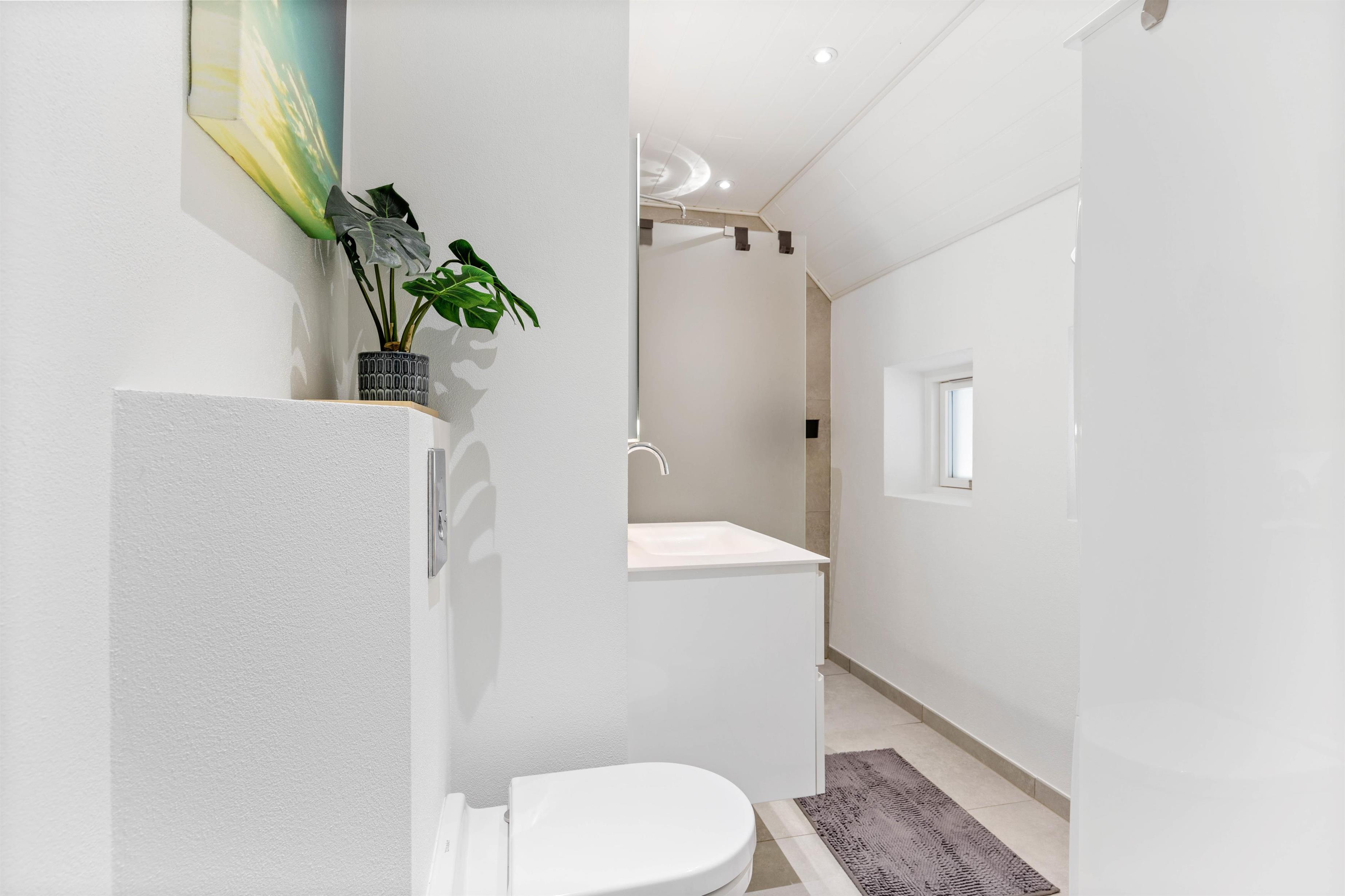 The house has a bathroom with walk-in shower featuring a rainfall showerhead, toilet, washing machine and tumble dryer. Underfloor heating provides comfortable warmth.