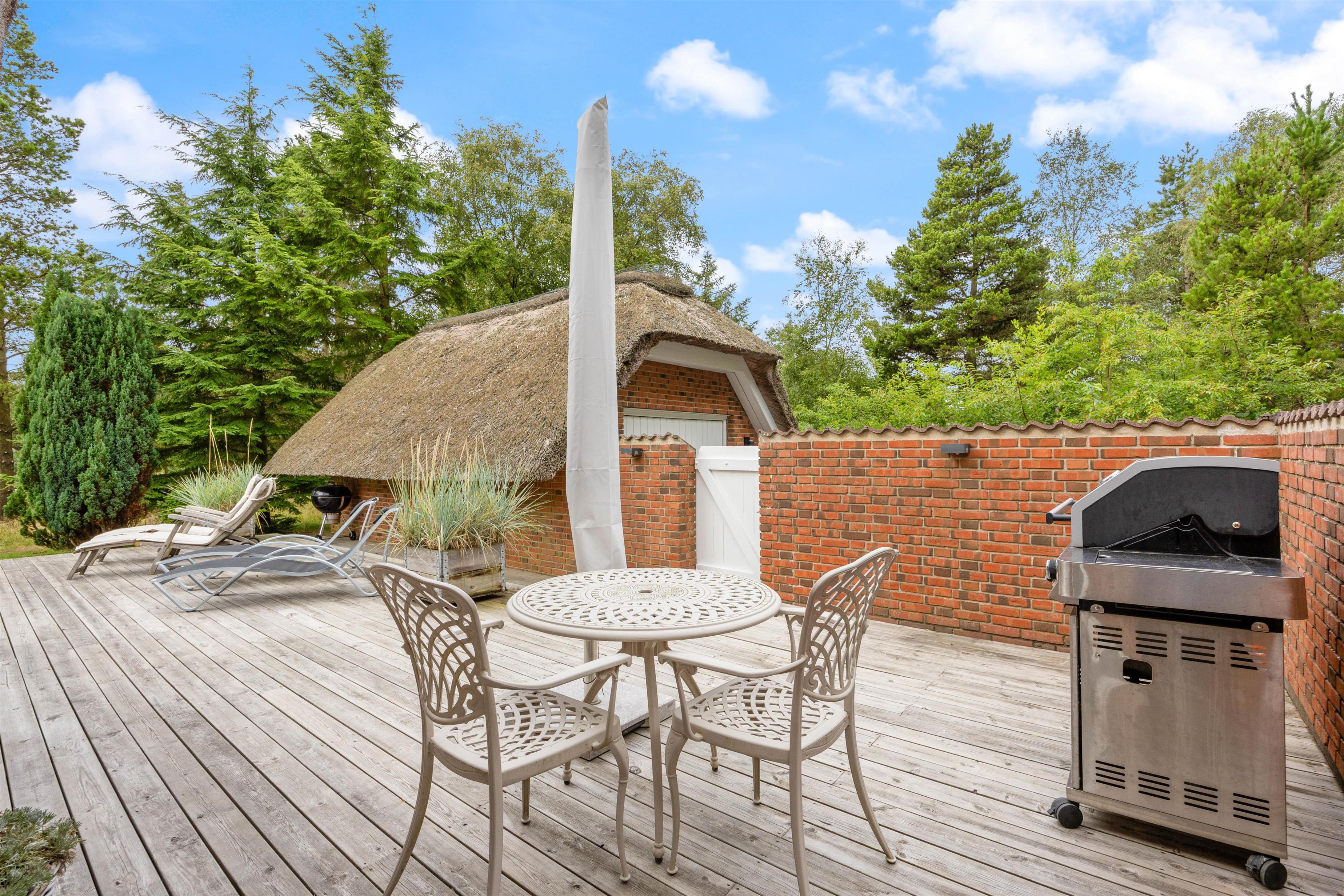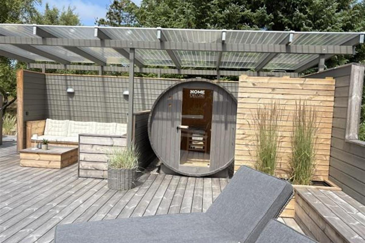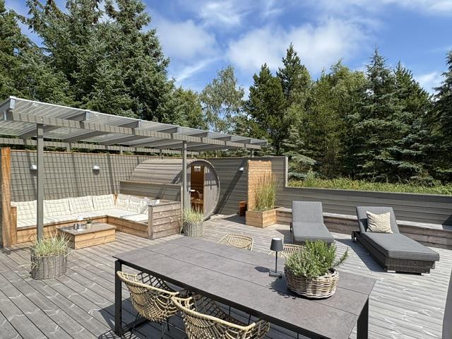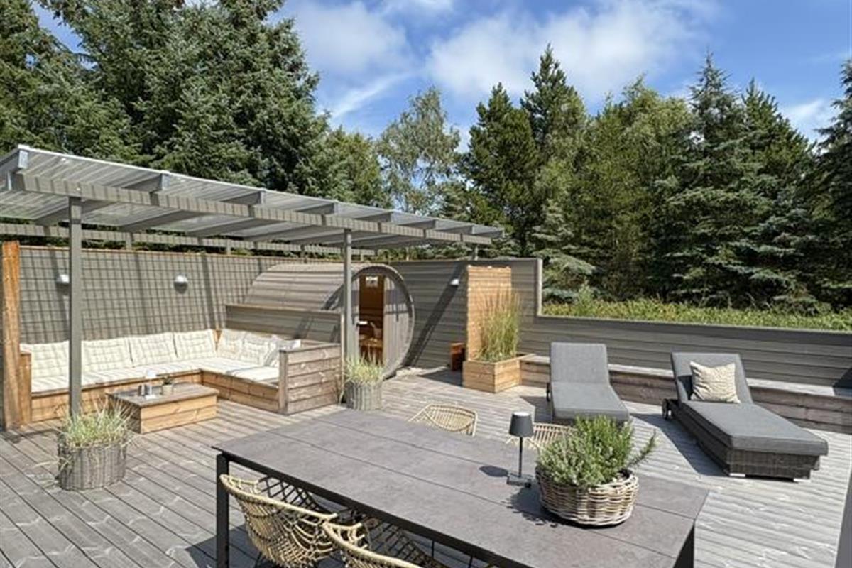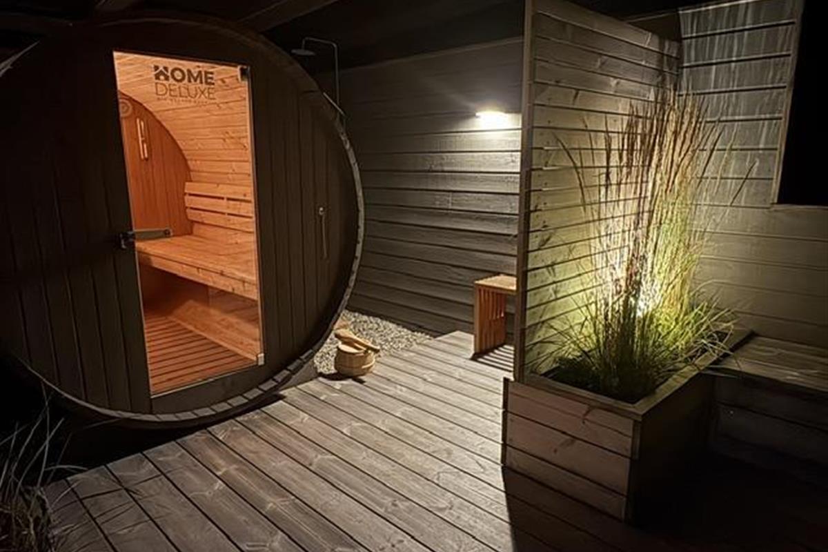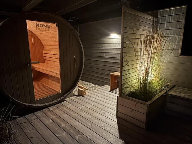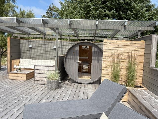The newly constructed south-east terrace (2024) features a covered lounge area with sauna and outdoor shower, creating a small wellness oasis. Both terraces (south-east and south-west) have dining tables seating up to eight people, sun loungers and parasols, allowing choice depending on weather conditions. Both charcoal and gas barbecues are available for use. The formerly covered terrace has been converted into a conservatory.