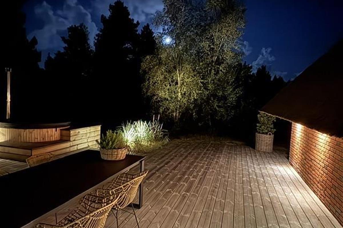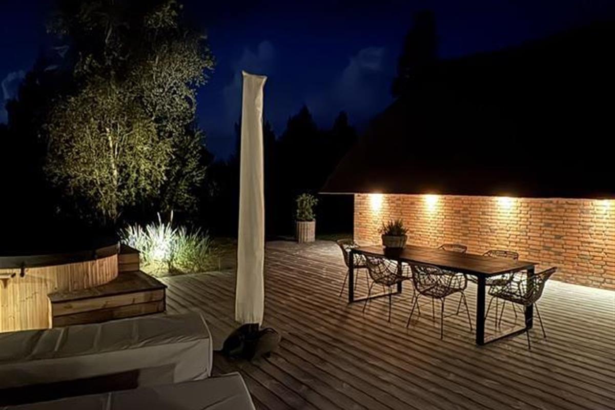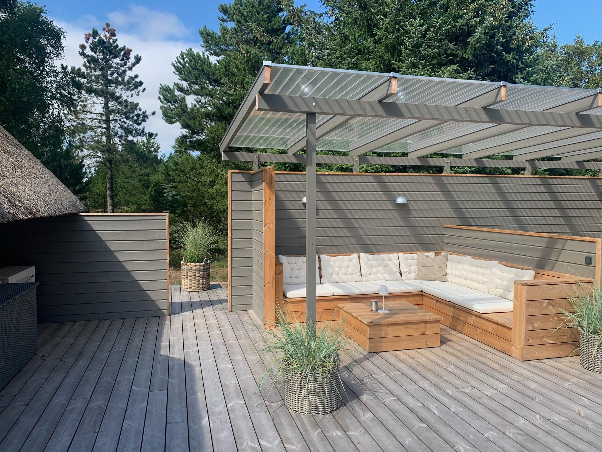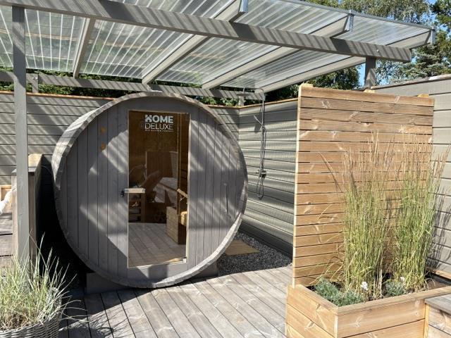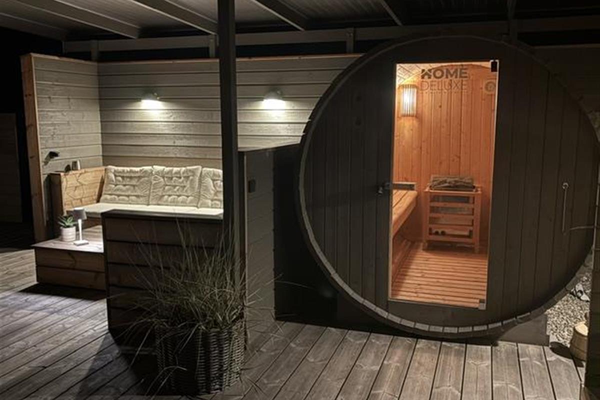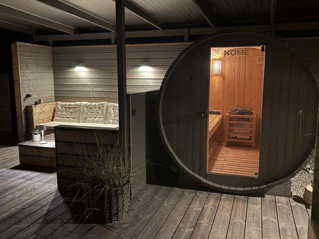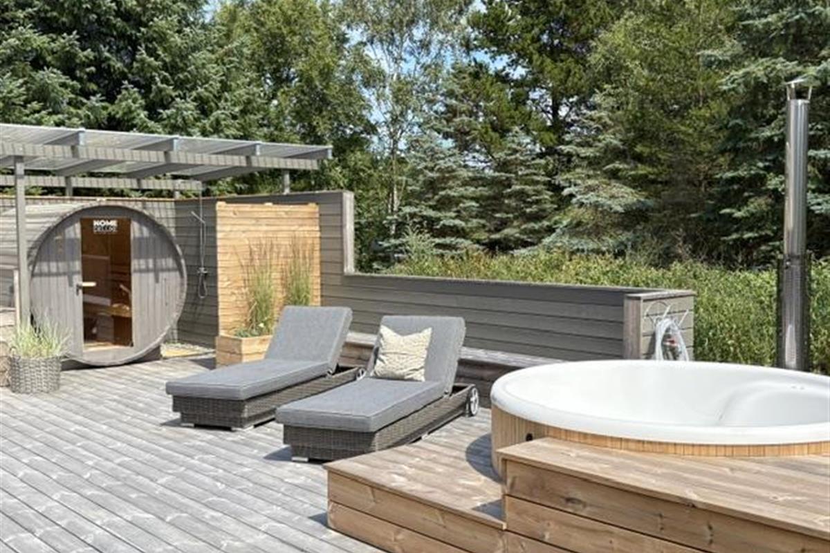 The newly constructed south-east terrace (2024) features a covered lounge area with sauna and outdoor shower, creating a small wellness oasis. Both terraces (south-east and south-west) have dining tables seating up to eight people, sun loungers and parasols, allowing choice depending on weather conditions. Both charcoal and gas barbecues are available for use. The formerly covered terrace has been converted into a conservatory.