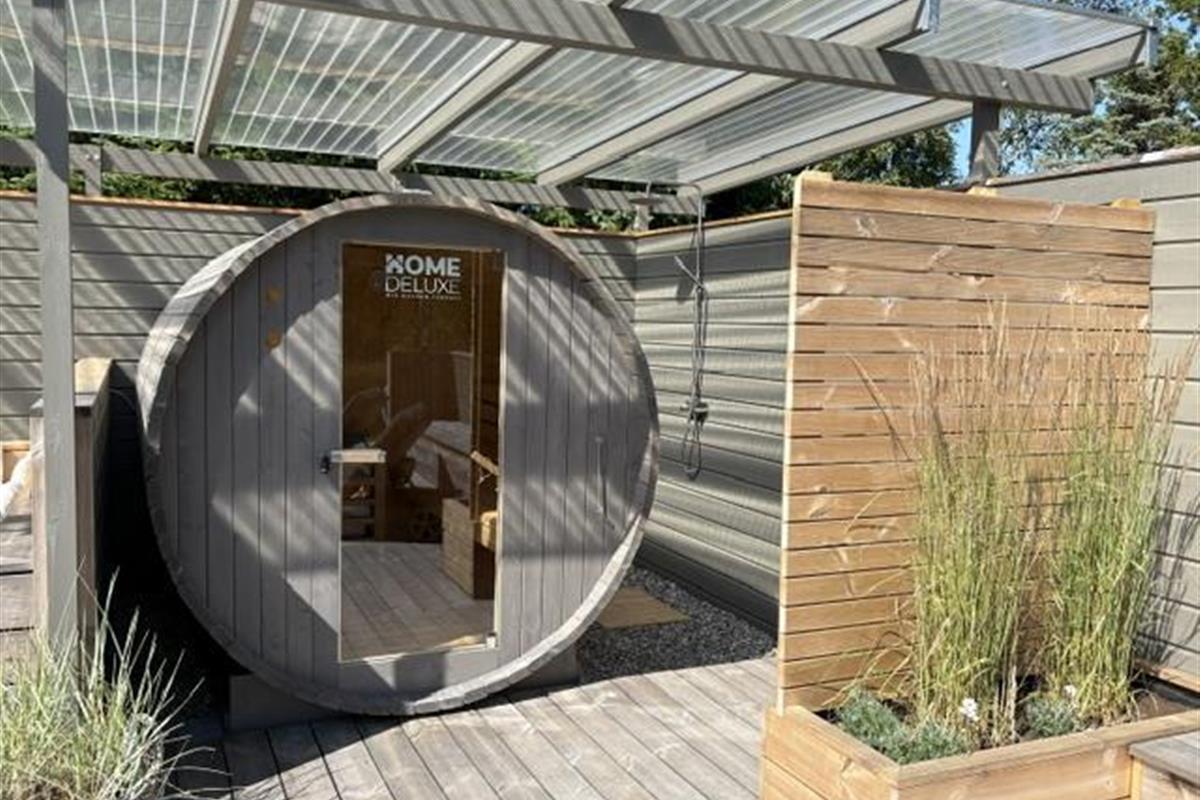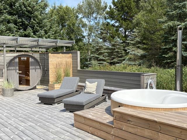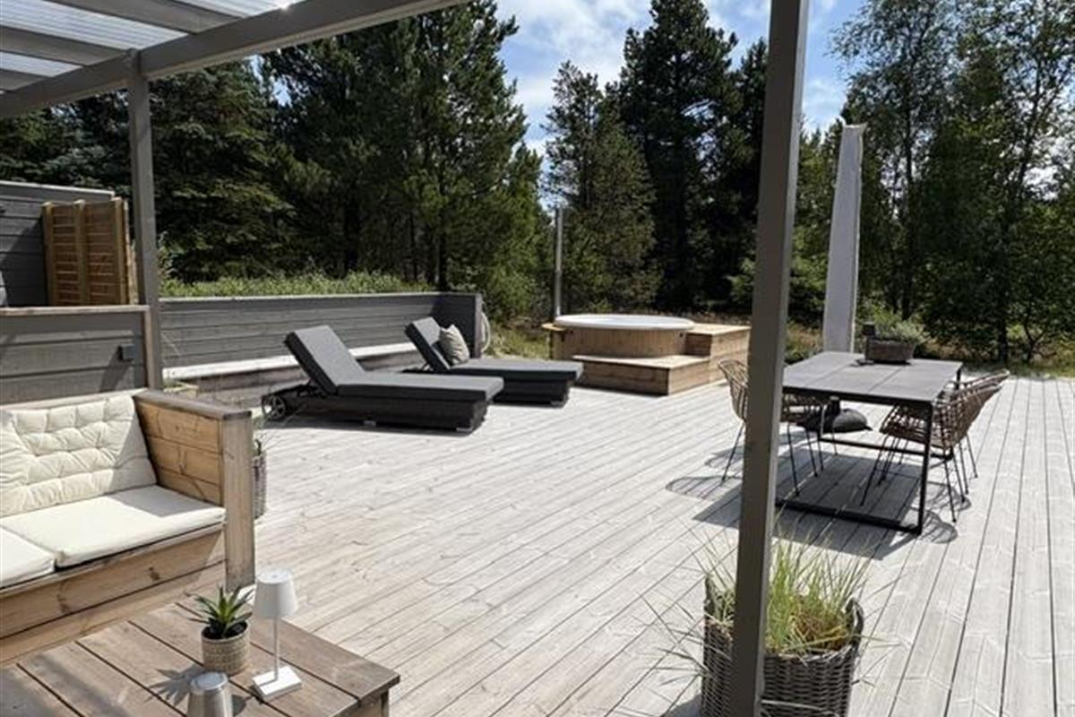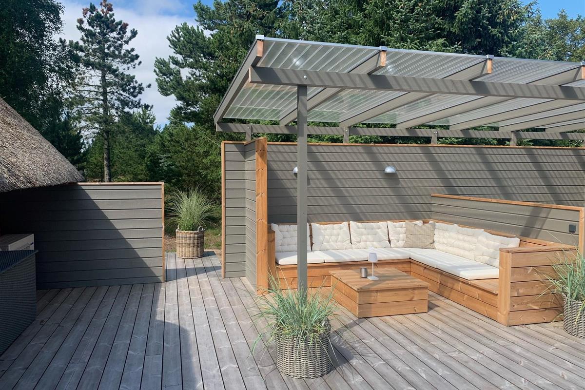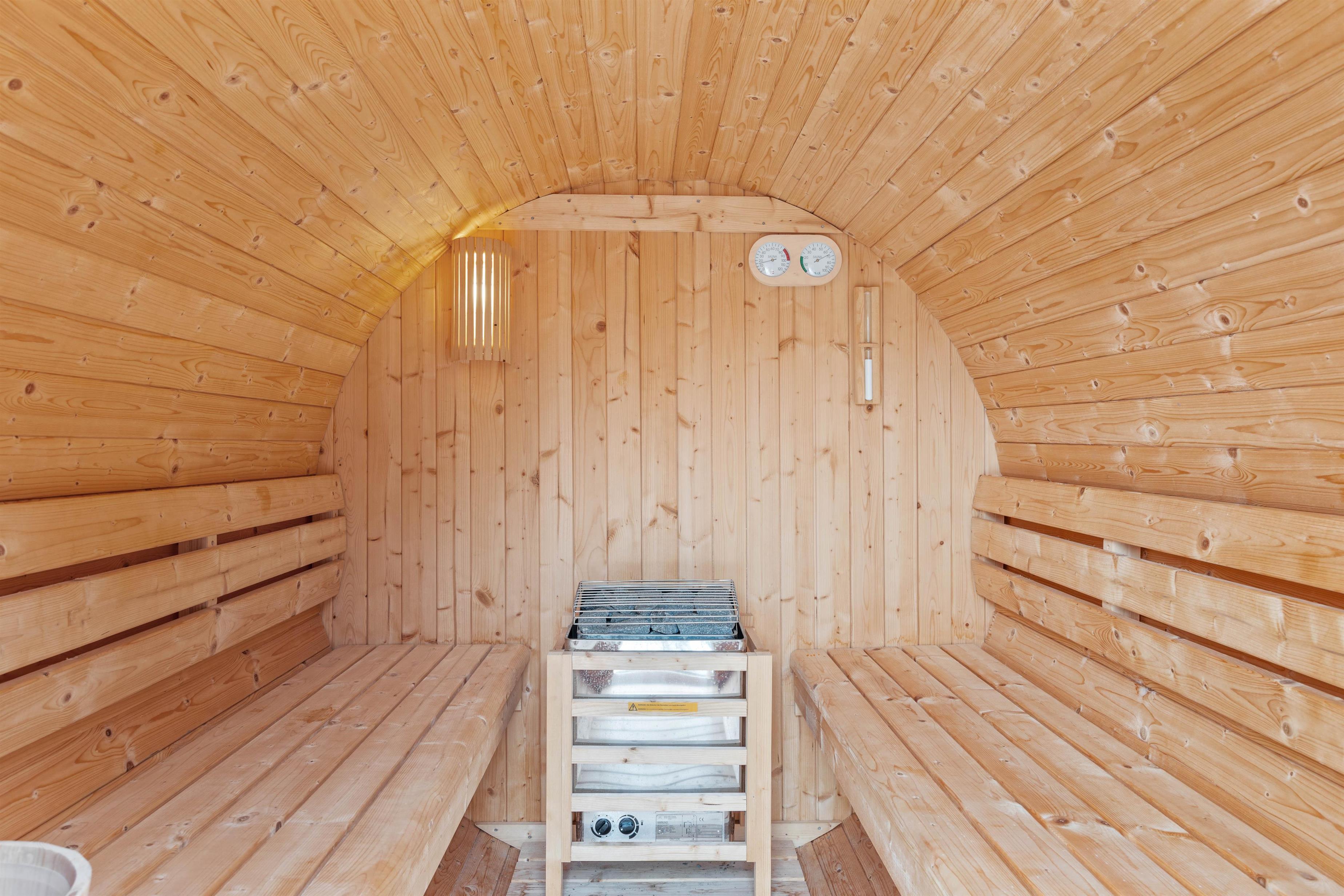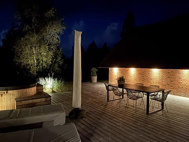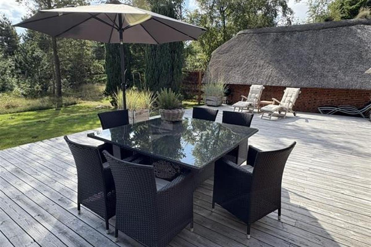 The newly constructed south-east terrace (2024) features a covered lounge area with sauna and outdoor shower, creating a small wellness oasis. Both terraces (south-east and south-west) have dining tables seating up to eight people, sun loungers and parasols, allowing choice depending on weather conditions. Both charcoal and gas barbecues are available for use. The formerly covered terrace has been converted into a conservatory.