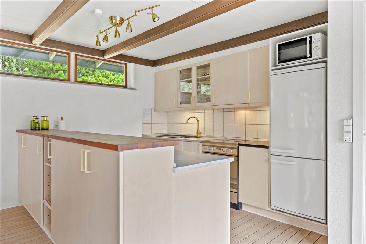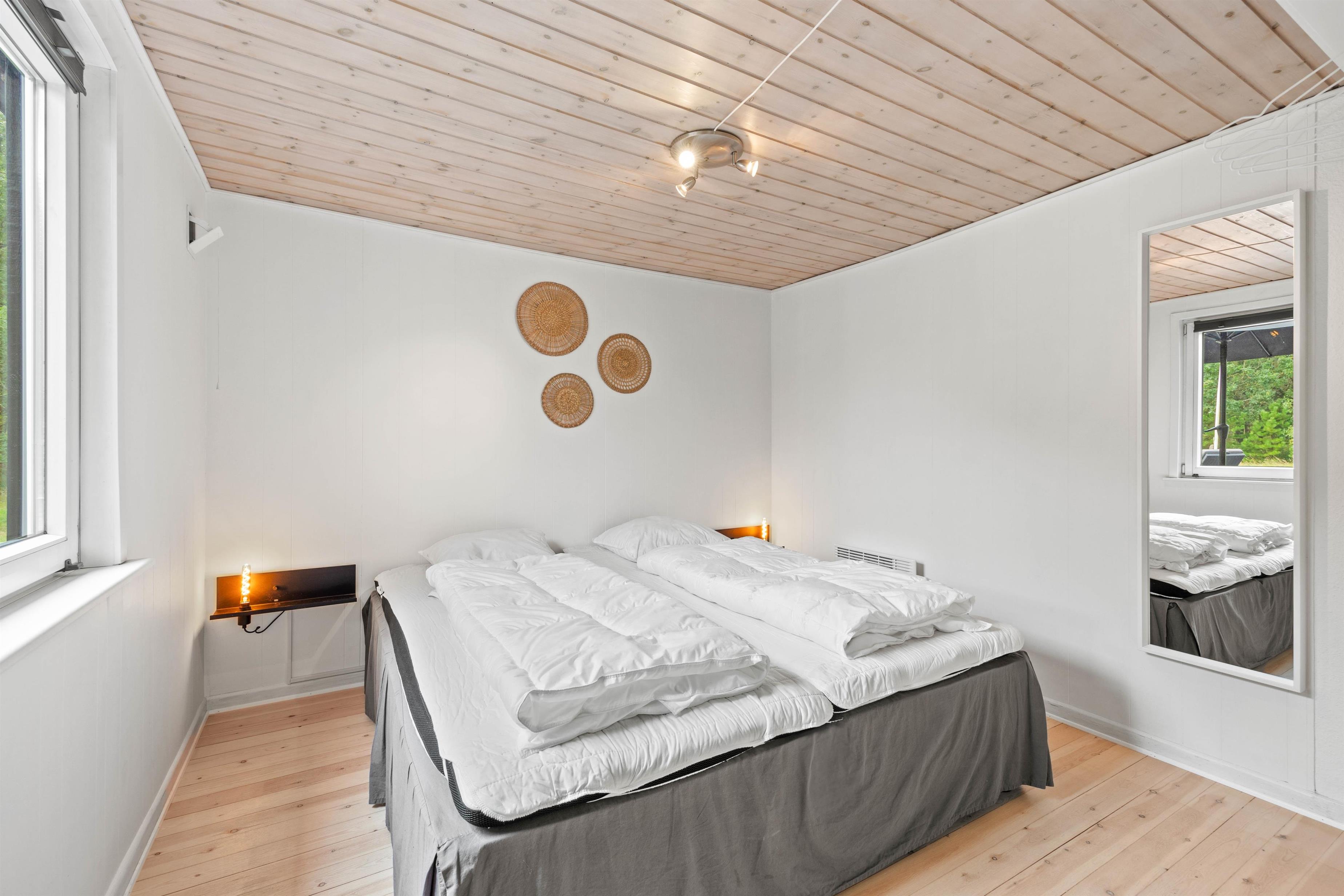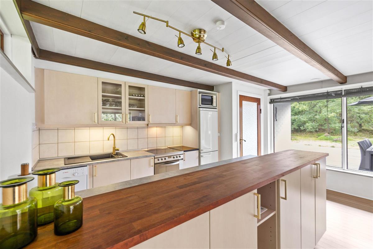 Relax on the sofa, gaze out at nature, and listen to the crackling of the wood-burning stove. The holiday home also features an energy-efficient heat pump for heating. Additionally, there's a well-maintained bathroom with underfloor heating, shower, and washing machine, plus three bedrooms. The bedrooms offer two double beds and a sofa bed for a restful night's sleep.
