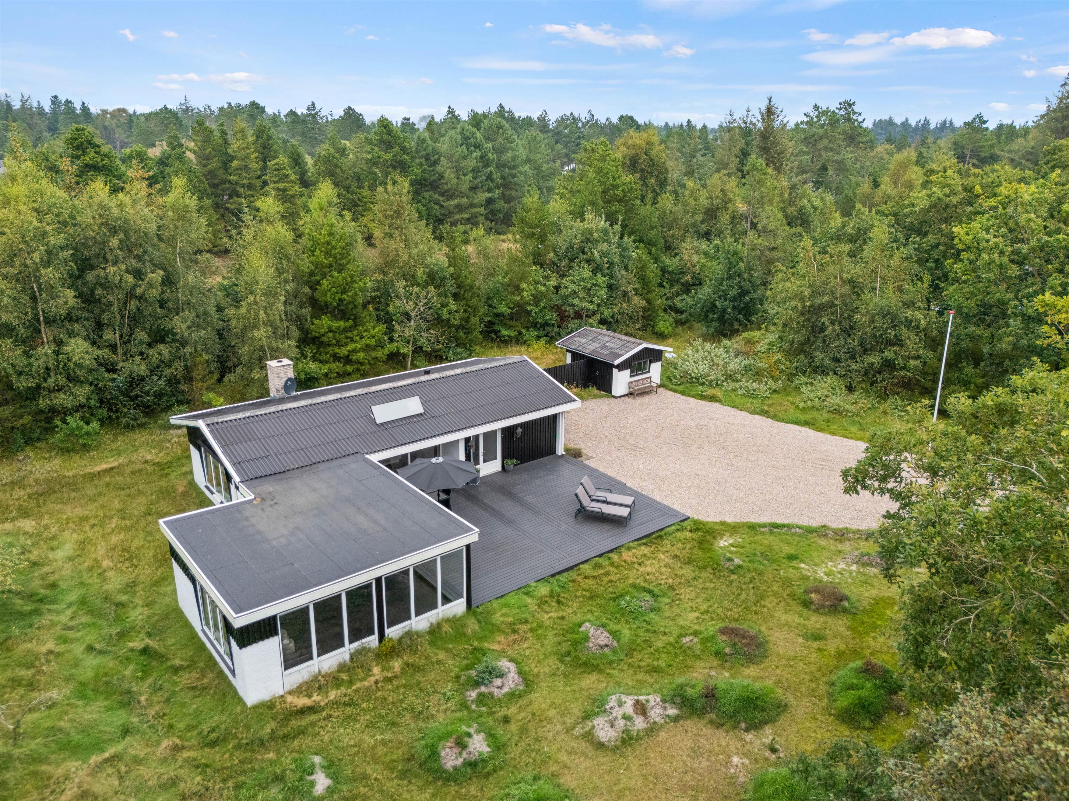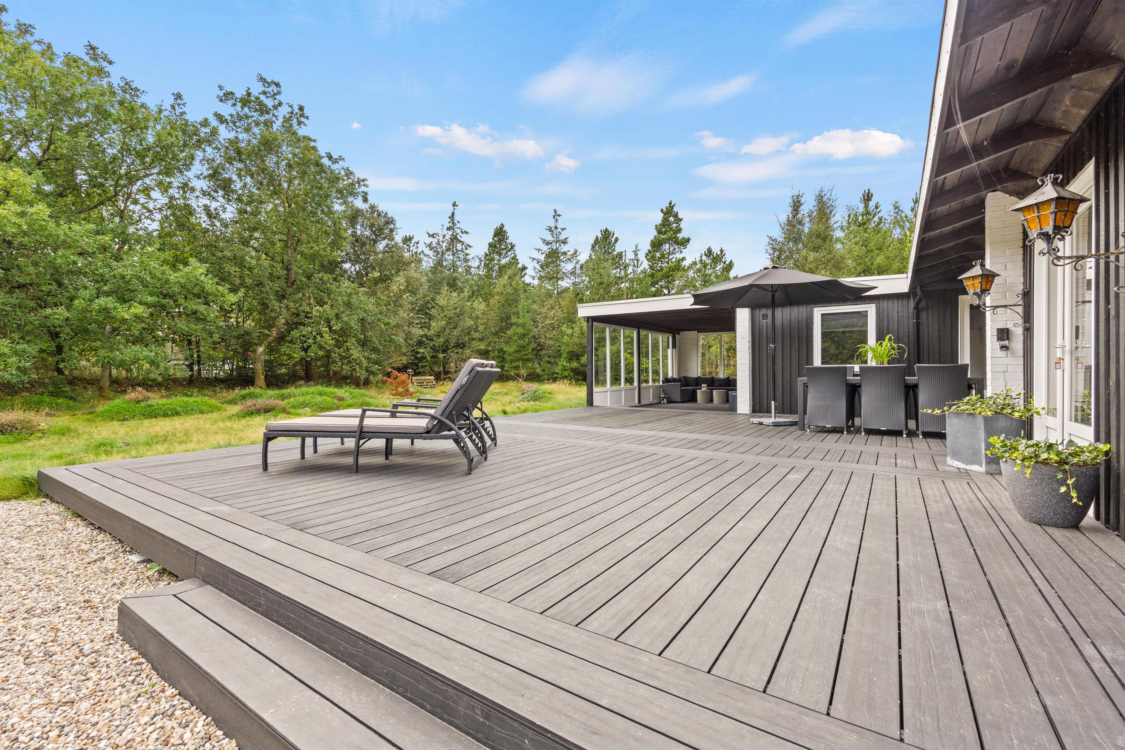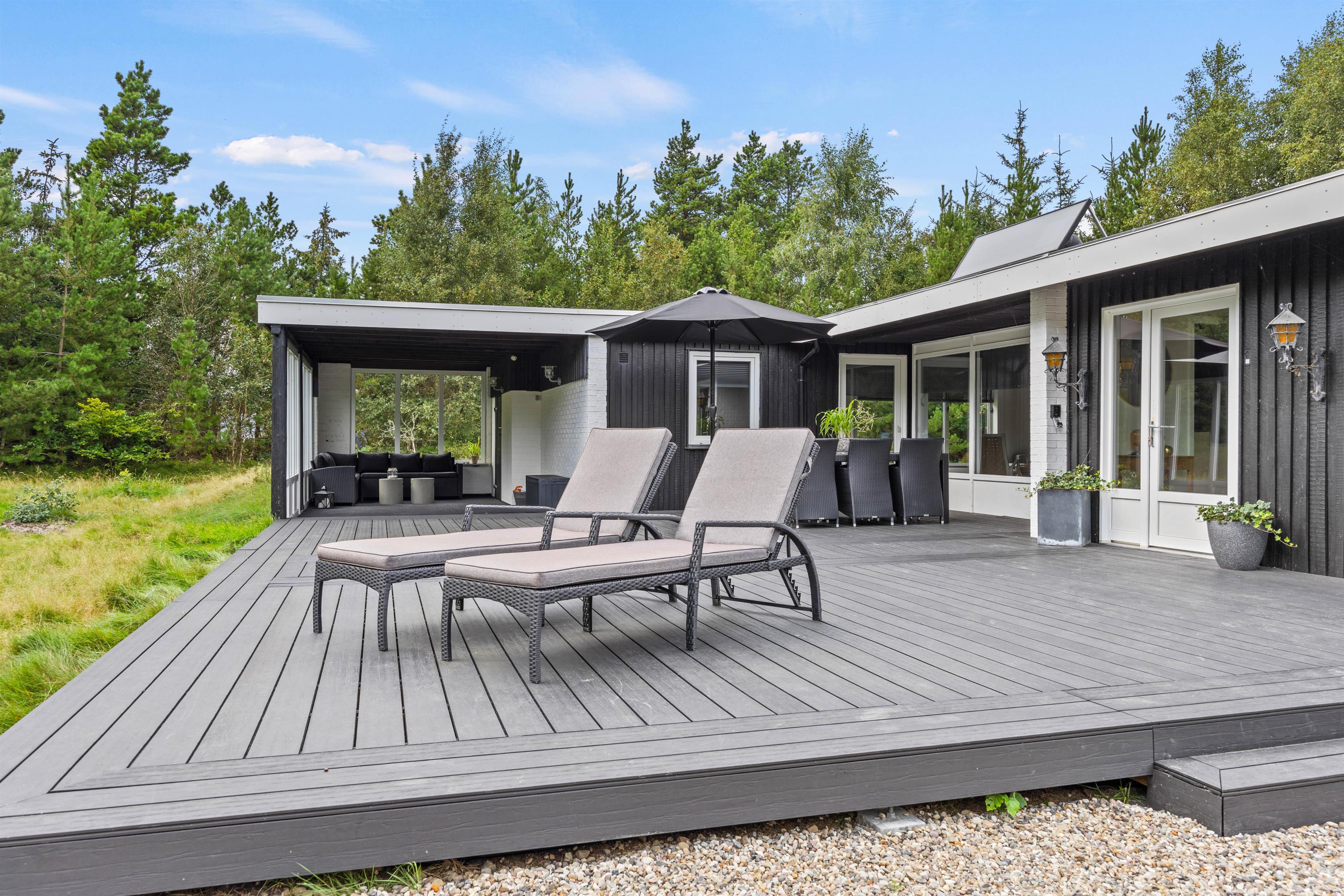 Your holiday home sits on beautiful natural grounds of 2,500 square metres, surrounded by bushes and trees, ensuring privacy while you relax on the terrace. Unwind on the sun loungers and enjoy the sunshine, or retreat under the covered area when it rains.