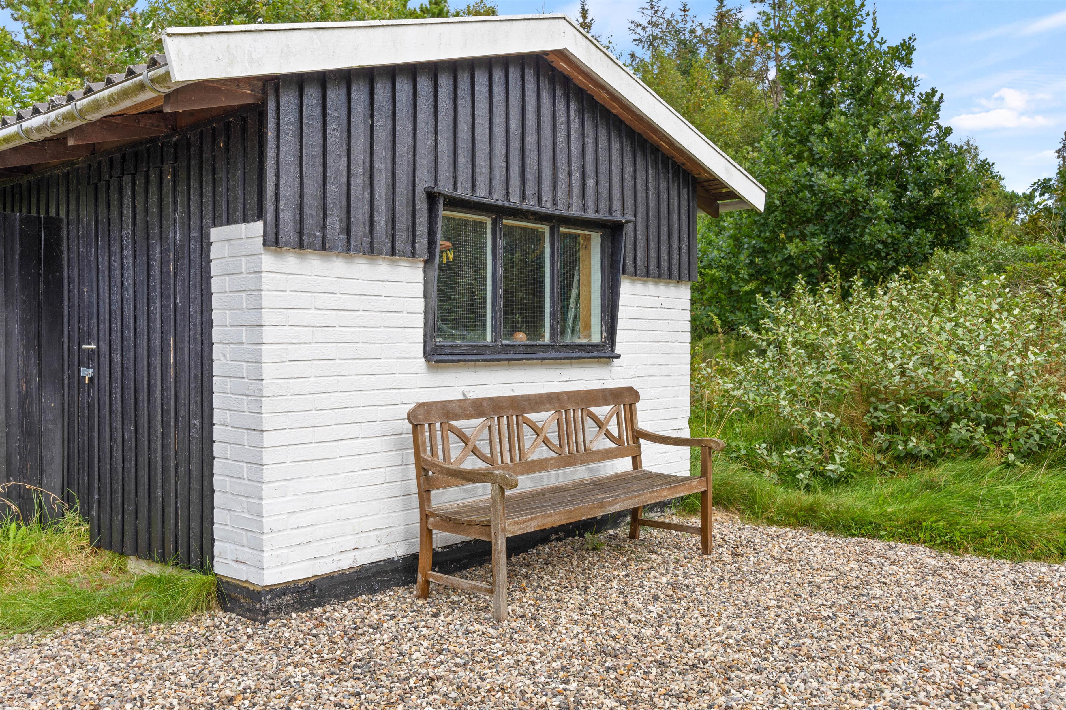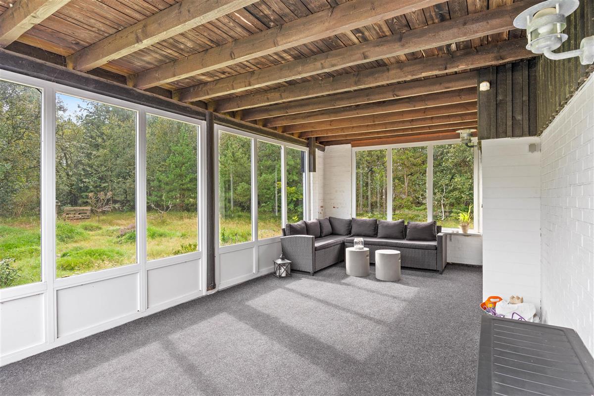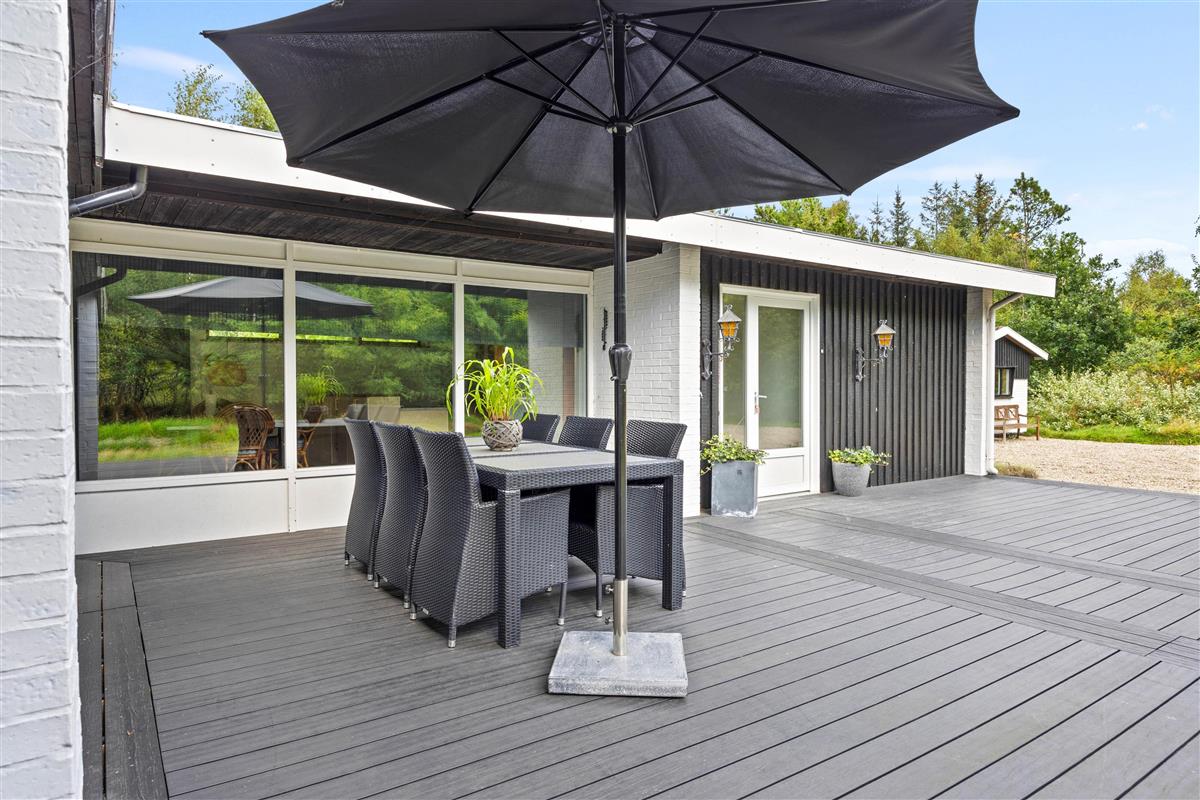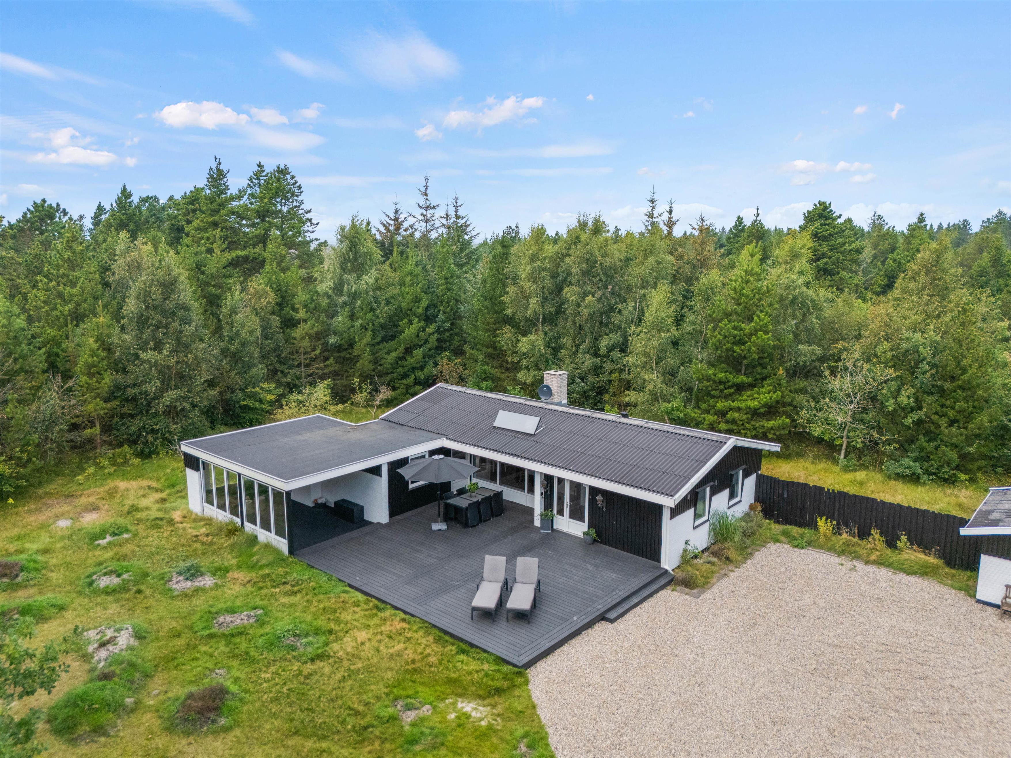 Your holiday home sits on beautiful natural grounds of 2,500 square metres, surrounded by bushes and trees, ensuring privacy while you relax on the terrace. Unwind on the sun loungers and enjoy the sunshine, or retreat under the covered area when it rains.