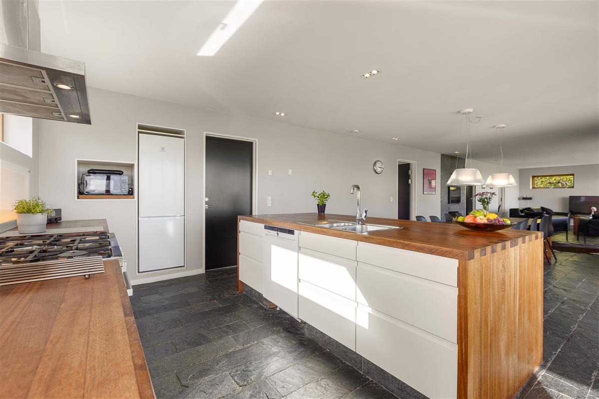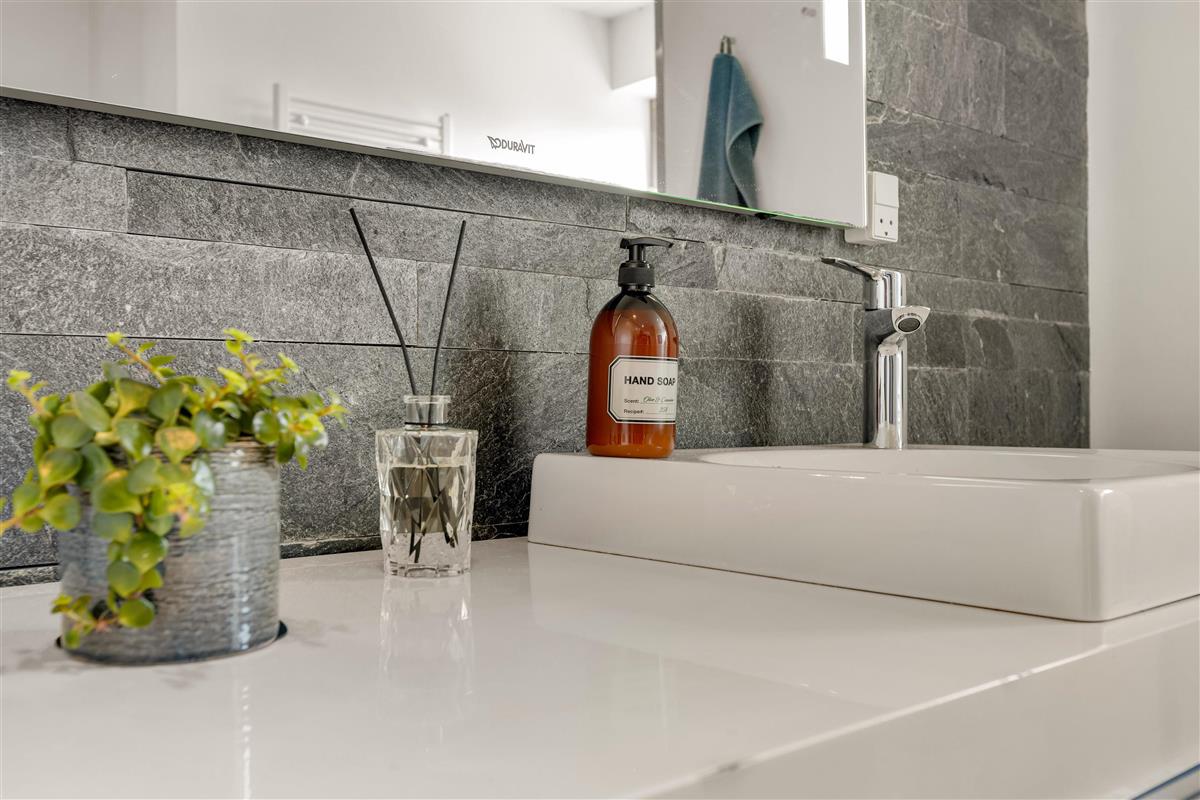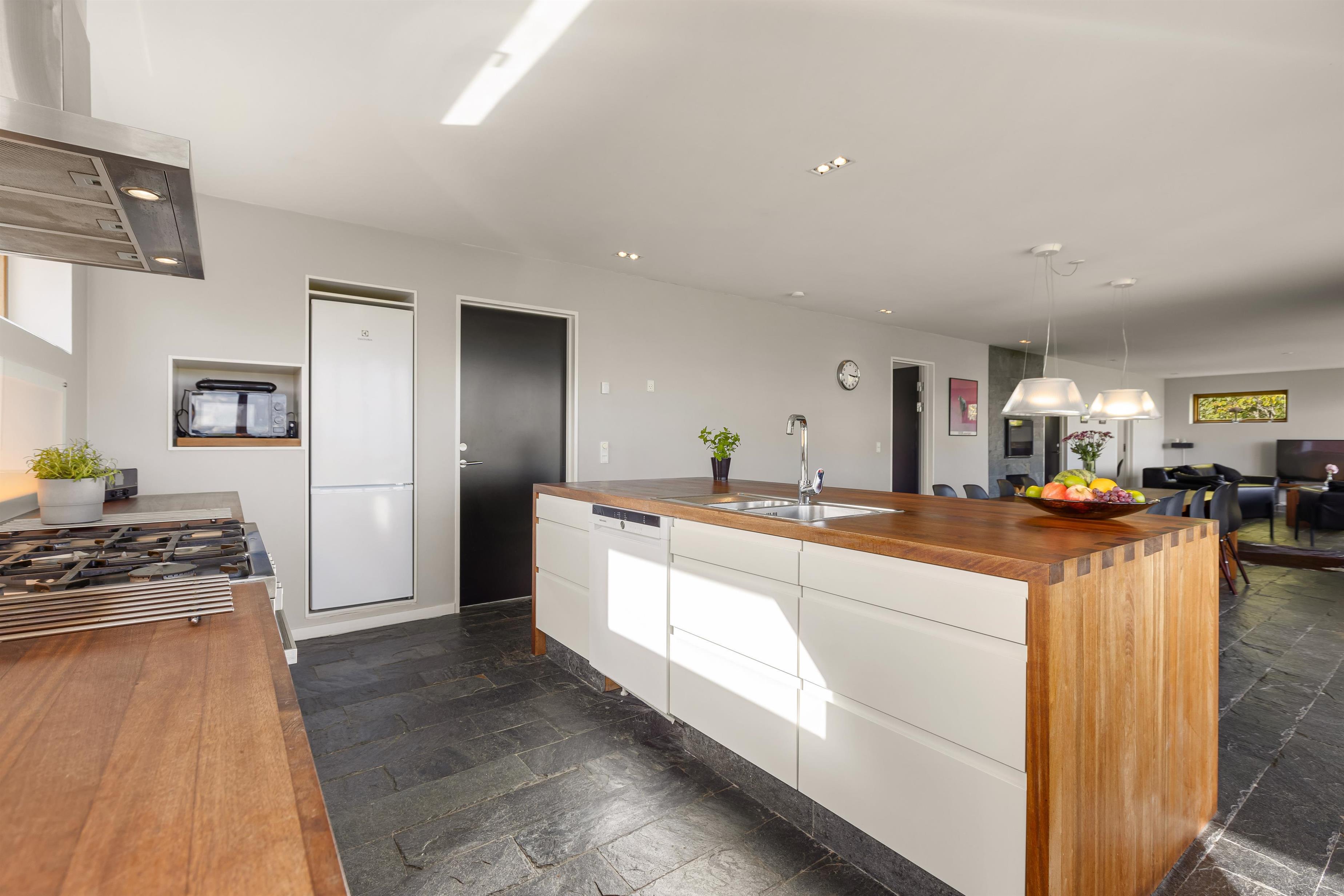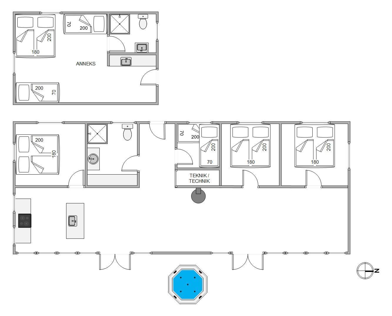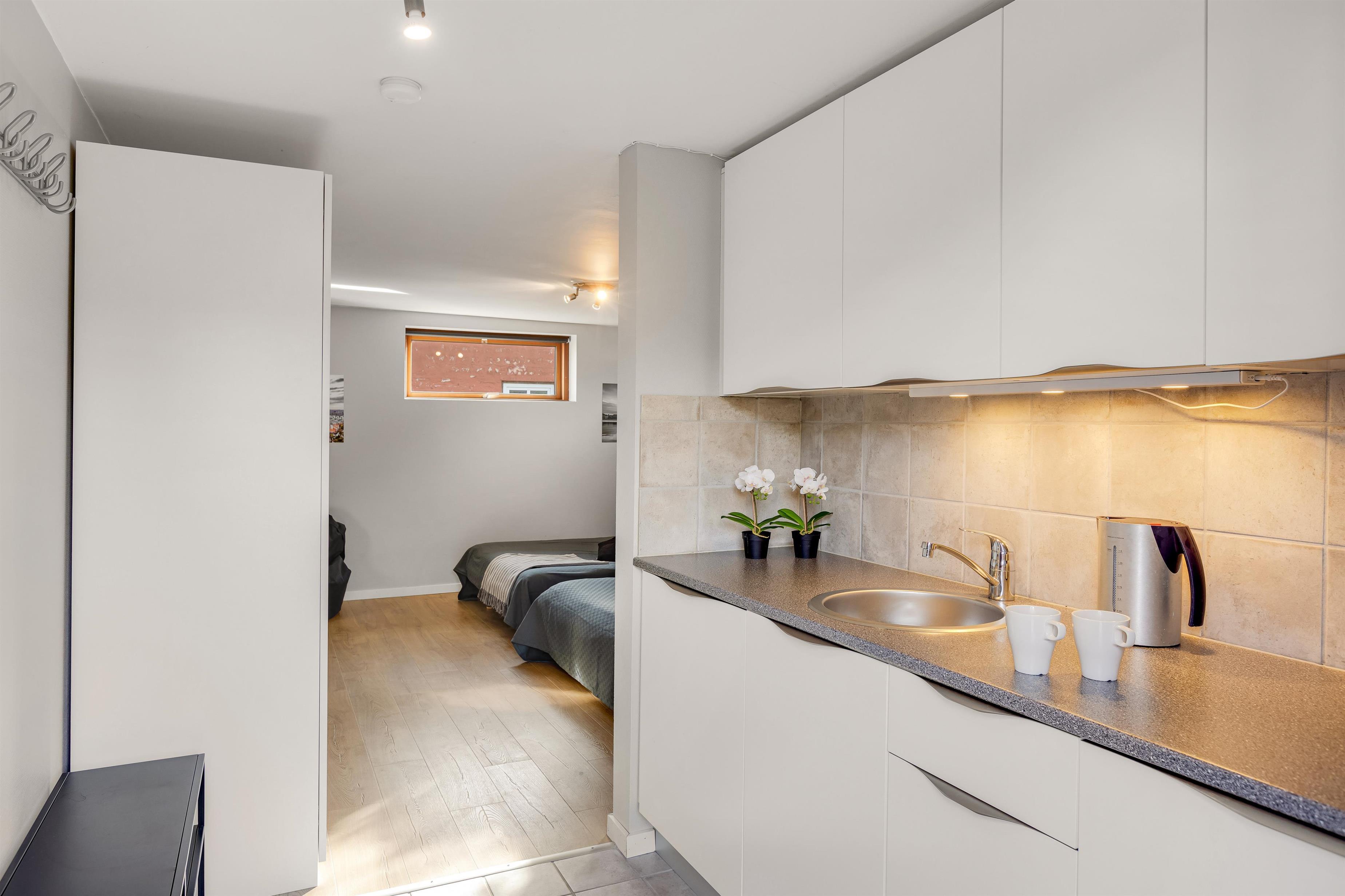The open-plan kitchen offers plenty of space for cooking together and creating delicious meals. Equipment includes a dishwasher, microwave, fridge with 60-litre freezer compartment, and a premium gas stove. The holiday home can be fully heated using energy-efficient heat pumps. The entire main house features tiled floors with floor heating.