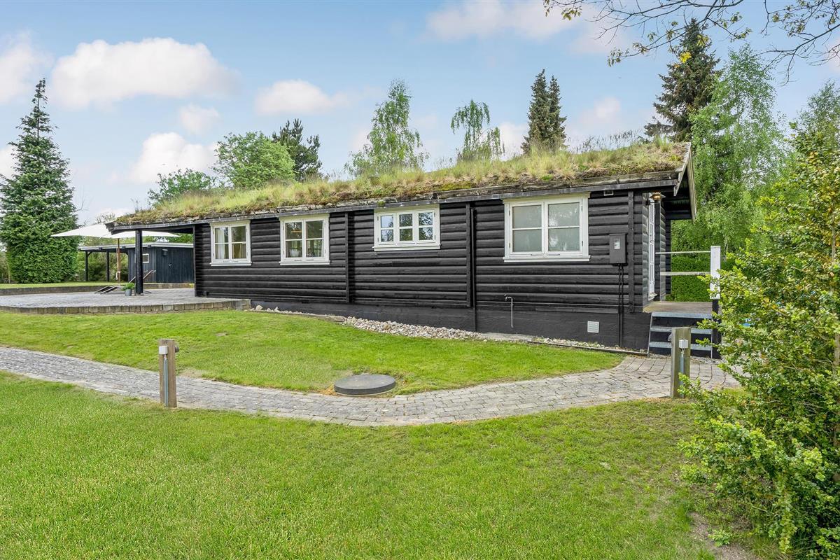 Charmante zwarte blokhut met grasdak in rustige straat nabij fjord en dorp Kulhuse.